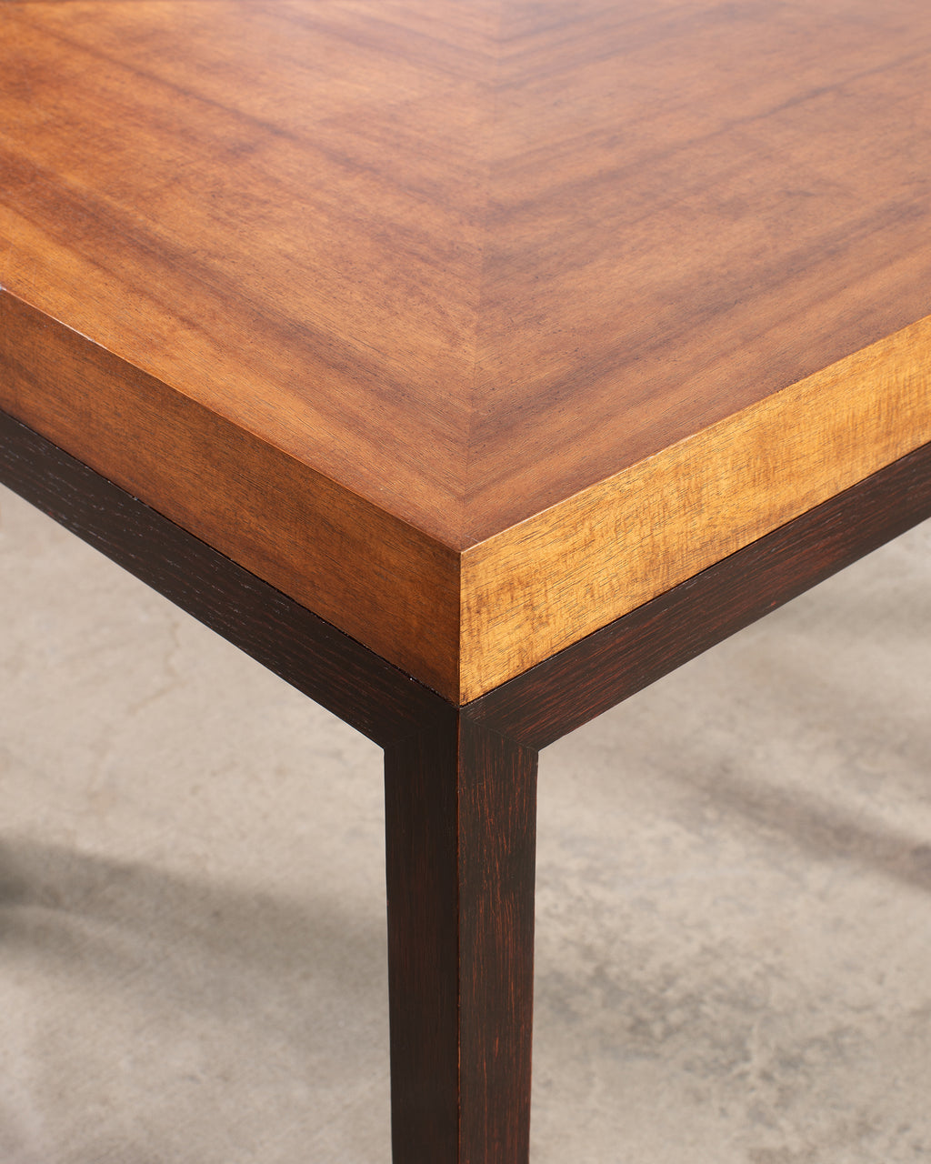 A modernist square "Normandie" games table by Therien Studio Workshops, constructed from oak with a dramatic Koa wood veneer creating a refined two-tone composition. The top is meticulously executed in a geometric parquetry pattern with a warm honey-toned surface laid in concentric, stepped square fields. The top is framed by a perimeter band and is set over a darkly stained, espresso-toned oak base having canted angular legs. The support is made up of four portal frame legs with a rectilinear profile. The wood is finished in a soft satin sheen. The original Therien Studios Workshop brass plaque resides under the table. Equally suited for use as a games table, a center table, or a small-scale dining table. The table has a clearance of 25.5" from the floor to the apron for ample leg room. The table is sturdy with solid joinery and construction. From an estate in San Fransisco, CA.