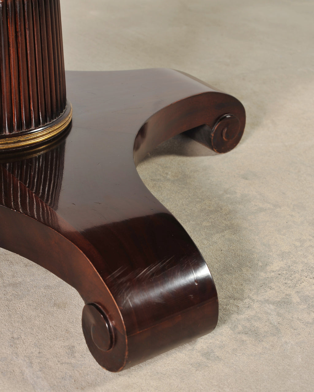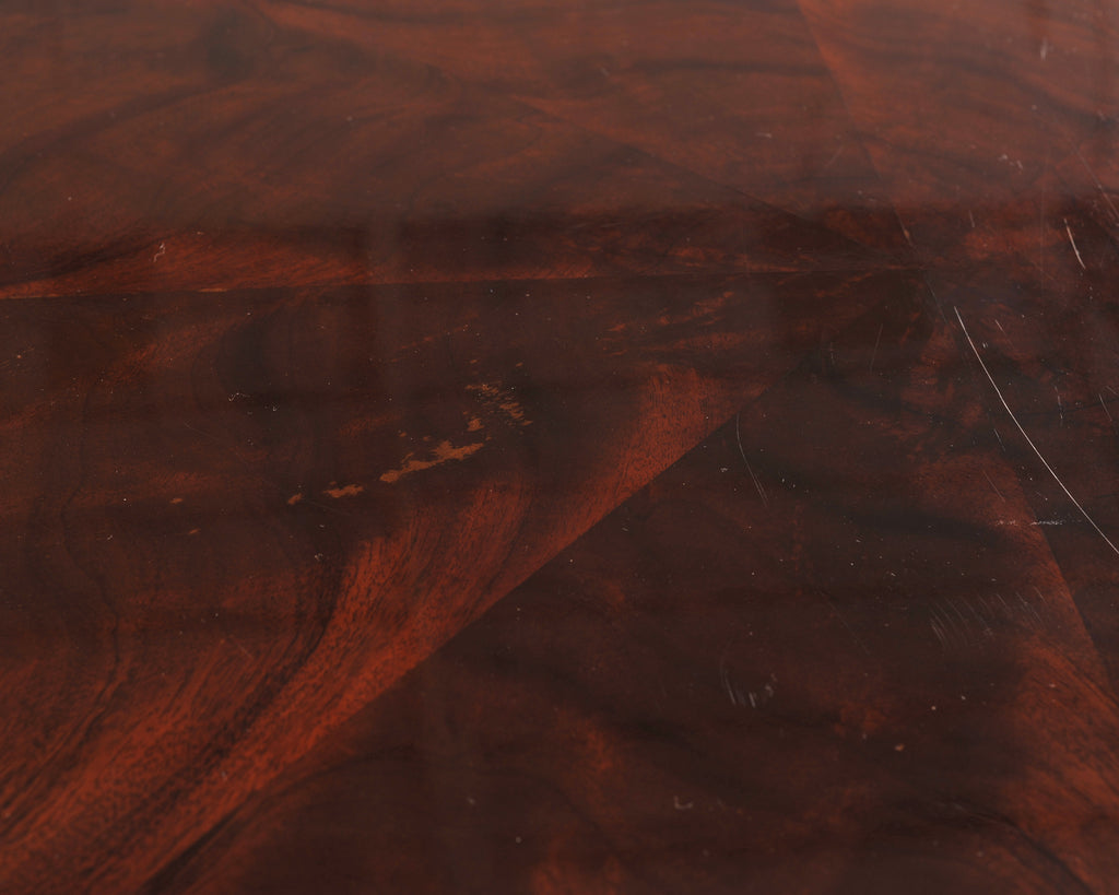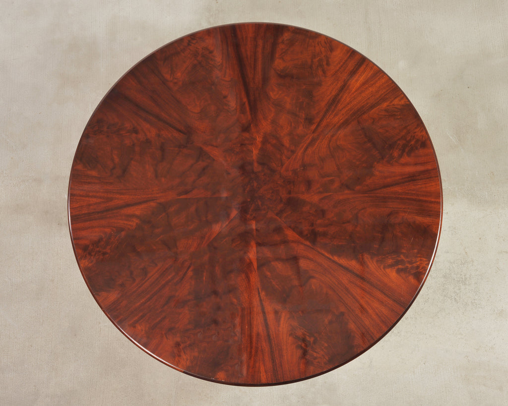 An elegant round Regency style mahogany pedestal table designed by Thomas Pheasant for Baker Furniture. The Baker table (Model # 7837G) is featured in Baker's Thomas Pheasant catalog on page 35. The substantial mahogany top is veneered in a dramatic book-matched sunburst design, showcasing the deep and fluid grain patterns. The top rests on a tapering column transitioning into a reeded drum column highlighted with gilt-toned banding. The column is mounted to a sculptural quad-form base ending with gracefully scrolled feet. The piece harmoniously blends Neoclassical, Georgian, English Regency, and Empire influences making it well suited to a variety of spaces, and is functional as a center table, or dining table. The table construction is sturdy and strong having excellent joinery and craftsmanship. From an estate in Bel Air, CA. Baker maker's plaque on bottom of table.