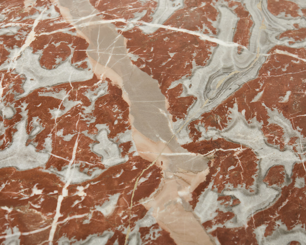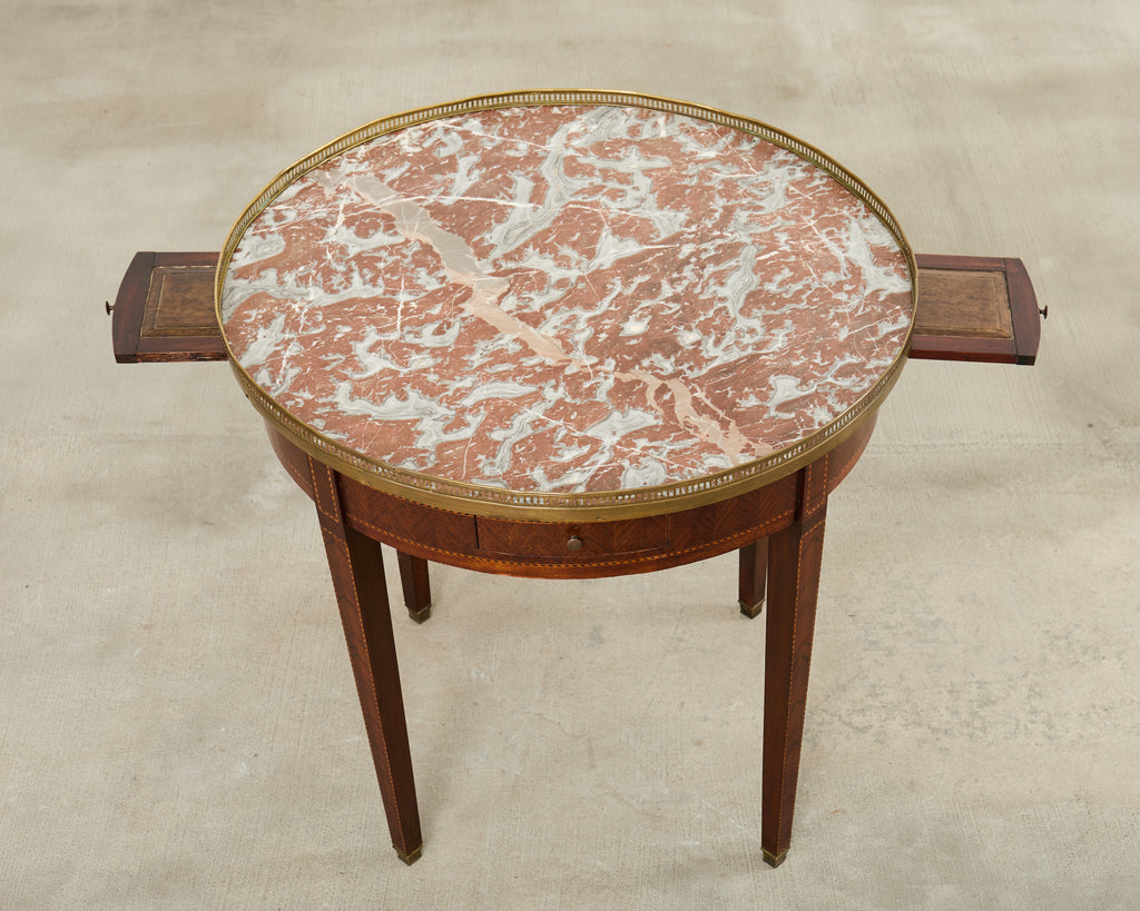 Distinctive 19th century French bouillotte table or games table crafted in the grand Louis XVI taste. The round table features a rare Turquin-Incarnat marble top inset in a fantastic pink and white tone. The marble is from the Caunes-Minervois, Languedoc-Roussillon region the Aude department of France. The top is supported by a mahogany base decorated with ebony marquetry inlay in a geometric chevron pattern bordering the apron and legs. The apron is fitted with two small pull-out drink trays and two small storage drawers. The marble top has a patinated brass gallery edge with a pierced border. The elegant tapered legs end with brass sabots. The table has a desirable aged patina consistent with age and use. The rare marble has a polished finish and opulent style on a grand scale.