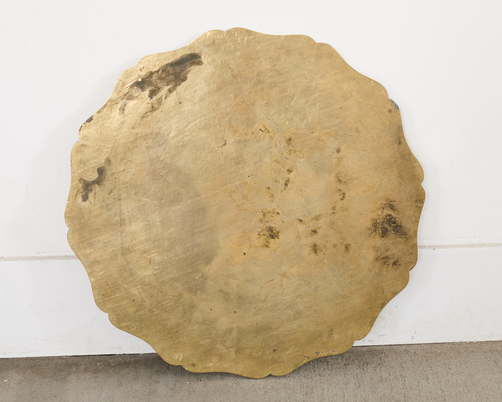 Handsome mid-century modern tray table featuring an Asian inspired etched brass tray top. The tray is subtly incised or etched with a small vignette in the Asian motif. The edge of the tray has a small galleried edge and a scalloped border. The tray is supported by a four leg stand with straight legs ending with bulb feet. Beautifully crafted with a handsome profile that could also serve as a cocktail table. From an estate in San Francisco, CA.