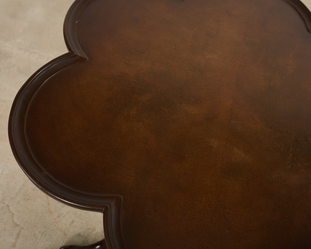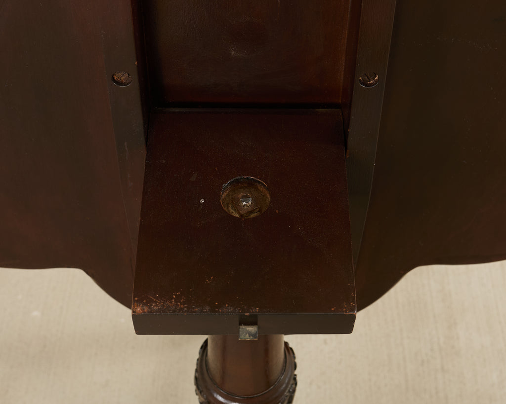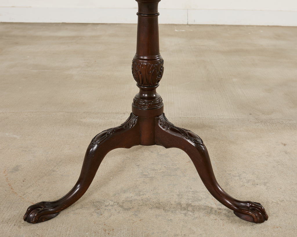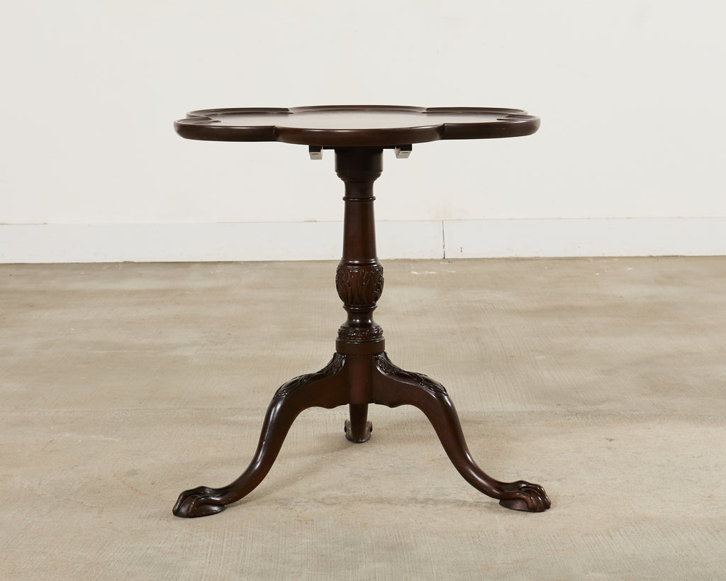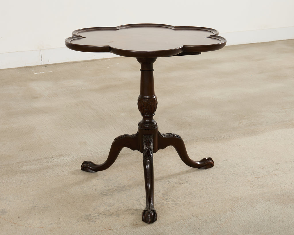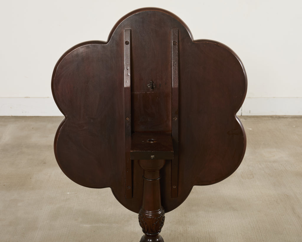 Handsome English mahogany flip-top side, end, or dessert table featuring a clover leaf shaped top. The top is supported by a turned column having cabriole shaped tripod legs ending with ball and claw feet. The legs and column are decorated with acanthus and the table has a dark, rich finish that showcases the fine woodgrains. Sturdy and stable from an estate in San Francisco, California.