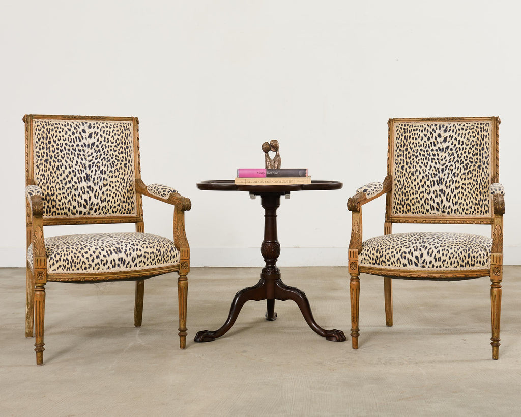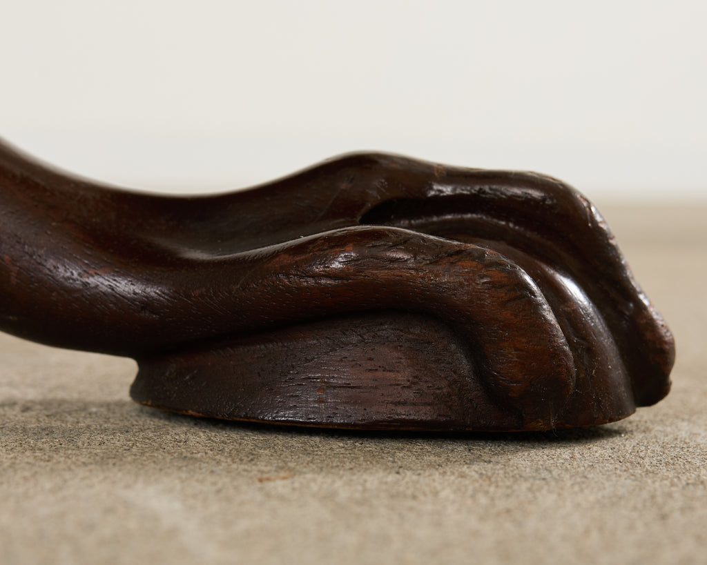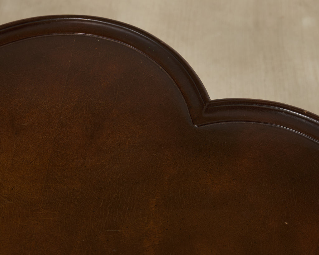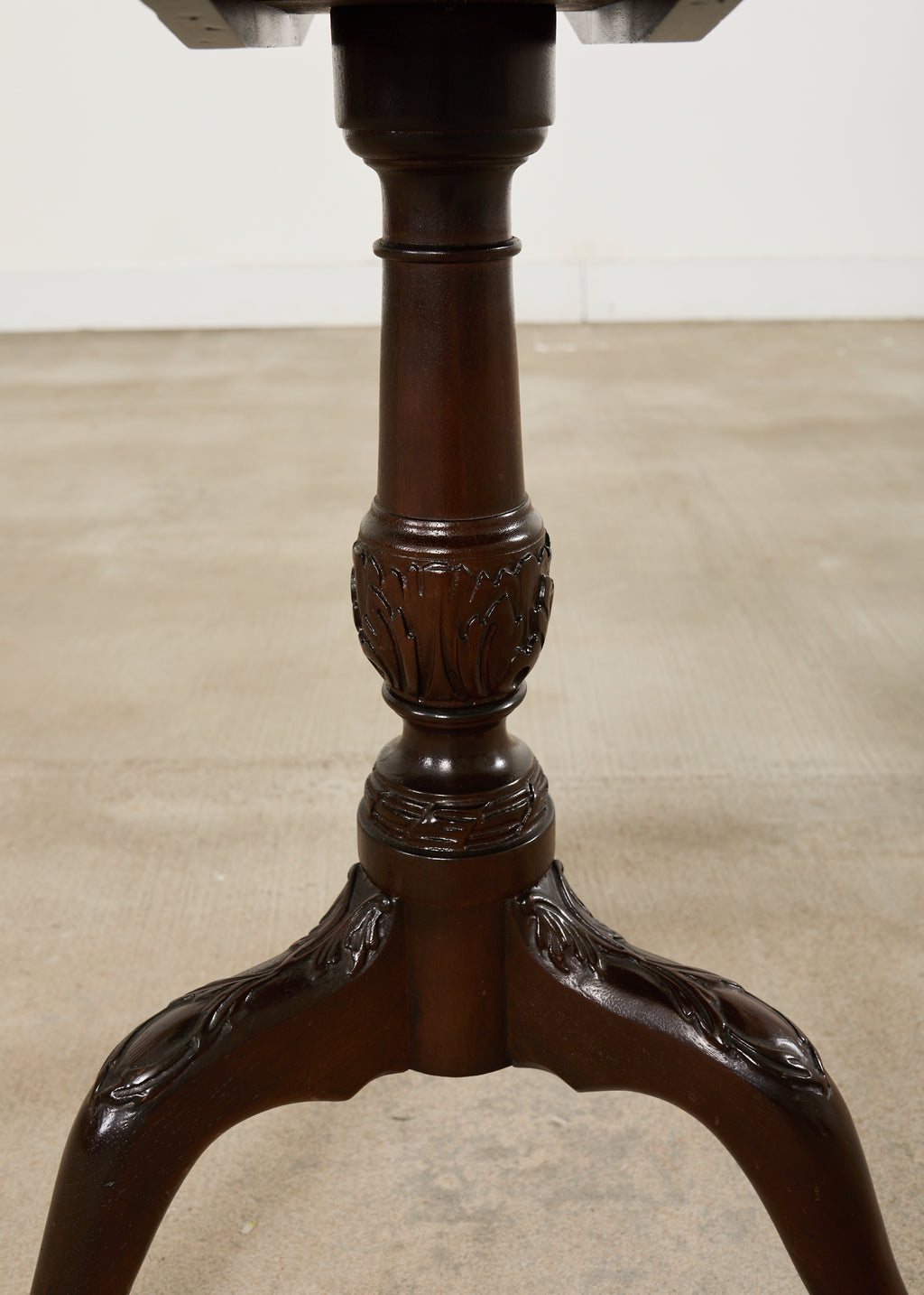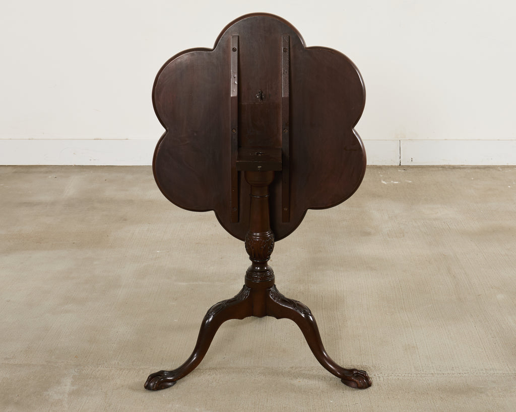 Handsome English mahogany flip-top side, end, or dessert table featuring a clover leaf shaped top. The top is supported by a turned column having cabriole shaped tripod legs ending with ball and claw feet. The legs and column are decorated with acanthus and the table has a dark, rich finish that showcases the fine woodgrains. Sturdy and stable from an estate in San Francisco, California.