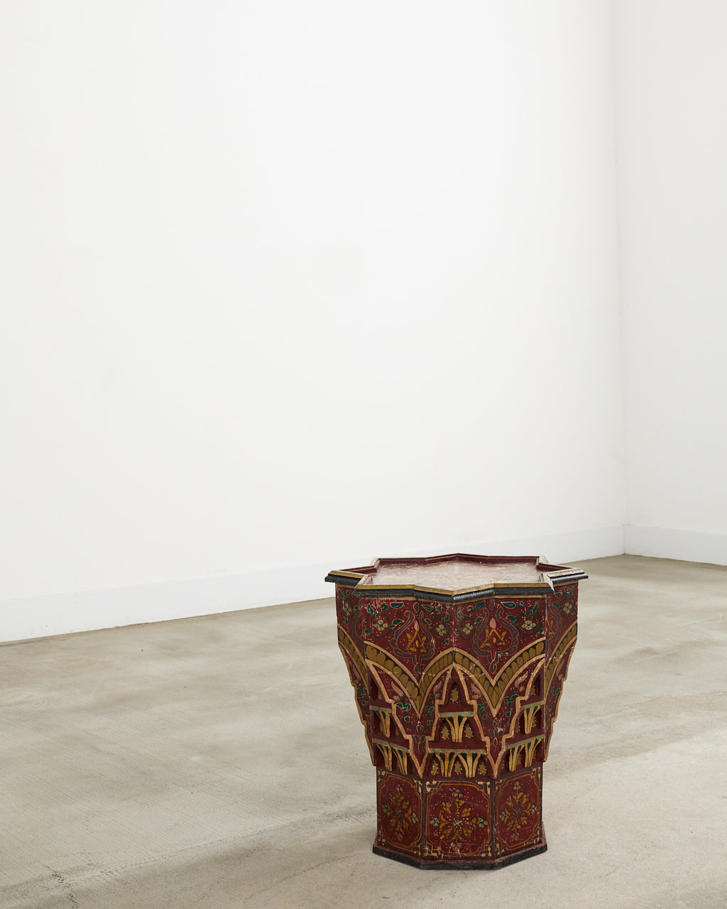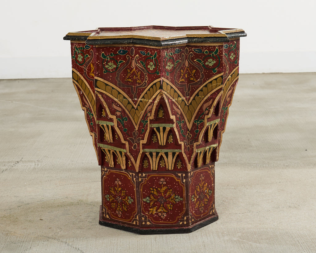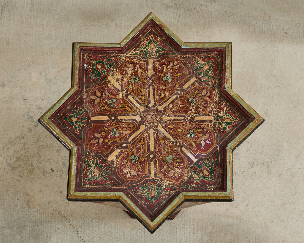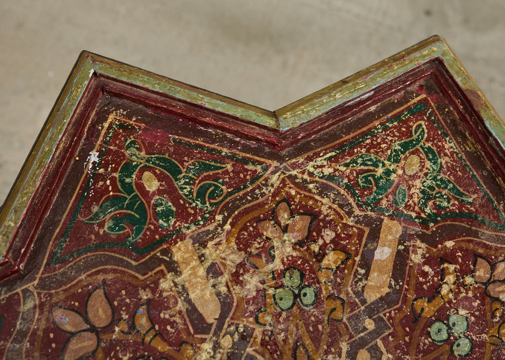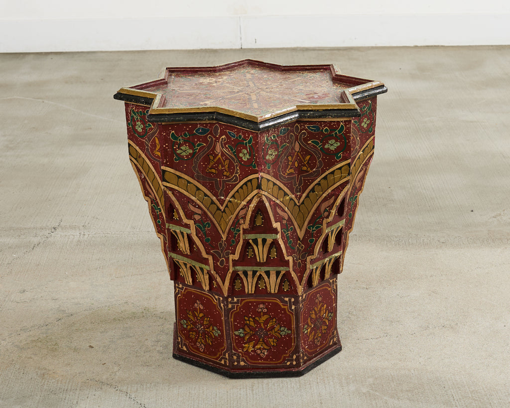 Dramatic polychrome painted Moorish Islamic star-shaped side table or drinks table featuring Middle Eastern arabesque designs and motifs. The large top is star-shaped and has a small galleried edge. The body has a tapered form and ends with an octagonal-shaped bottom. Beautifully crafted, carved, and embellished with vibrant colors over a red ground. Lovely aged patina on the painted finish to commensurate age and use.