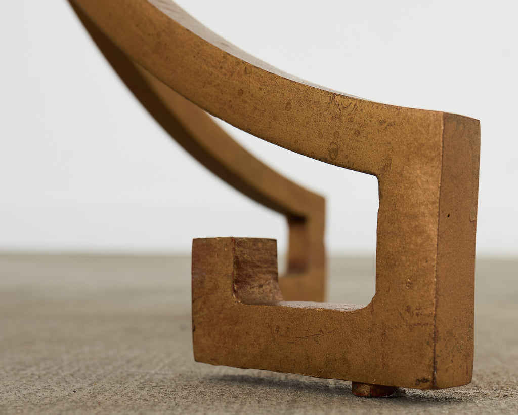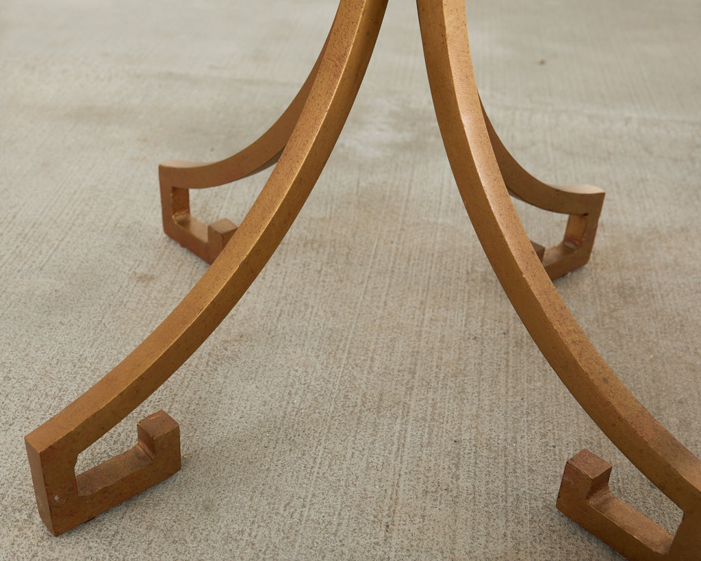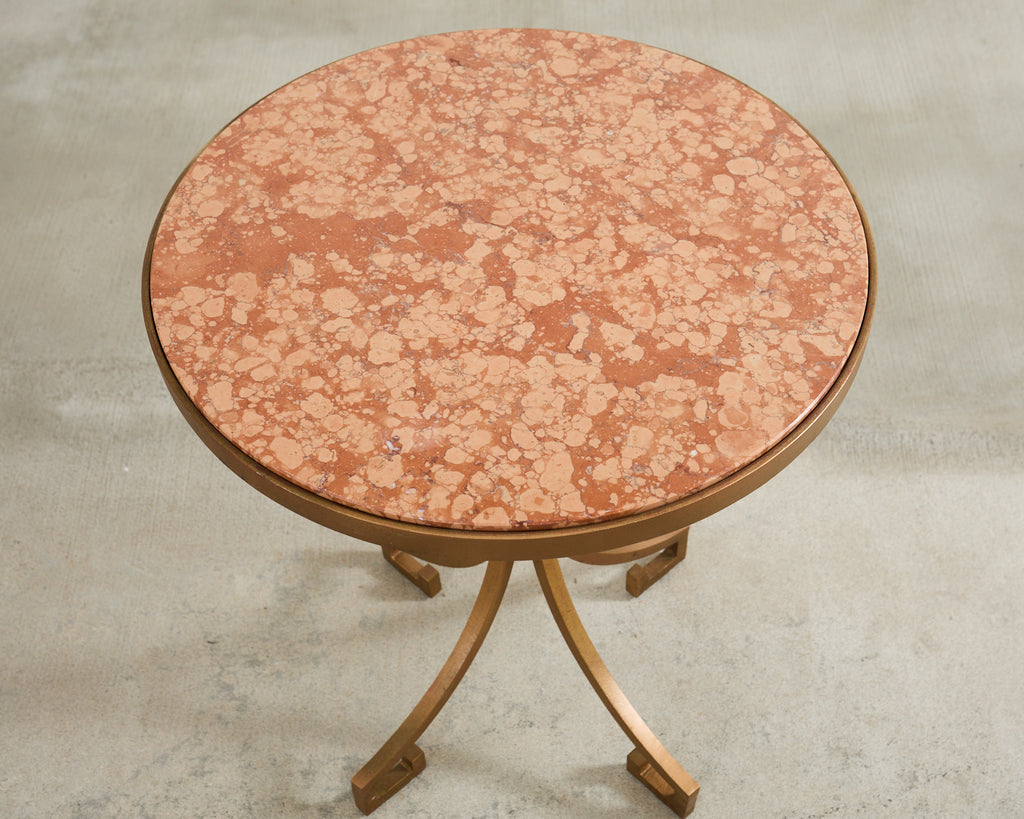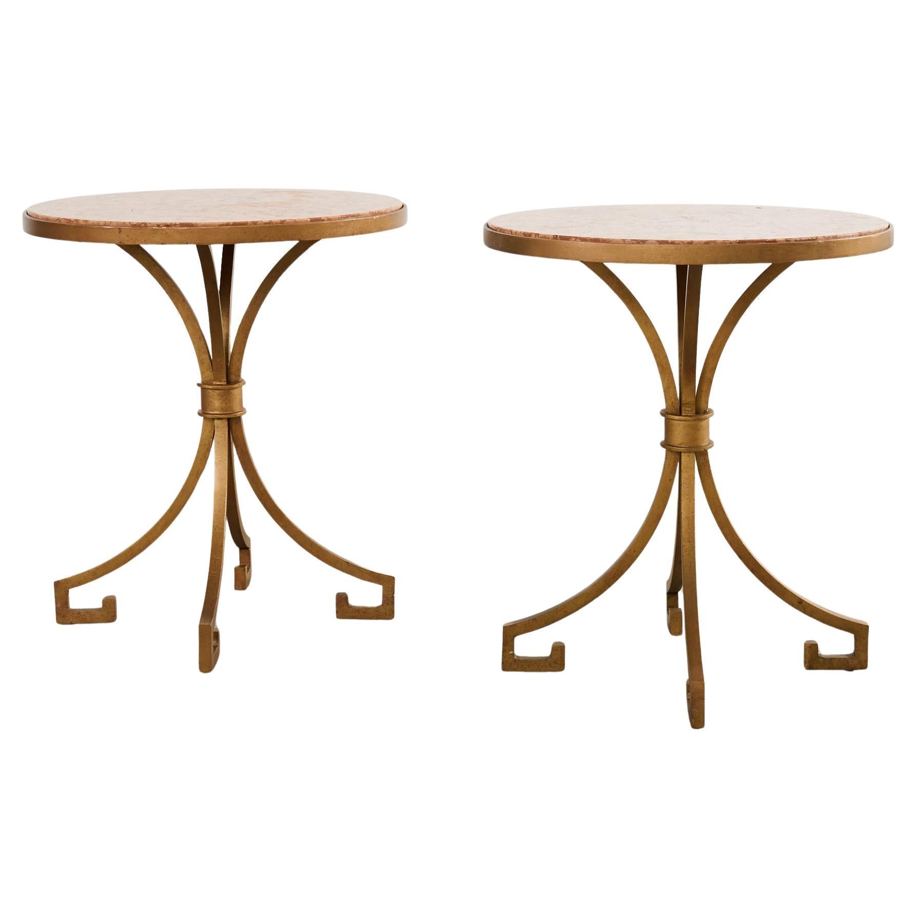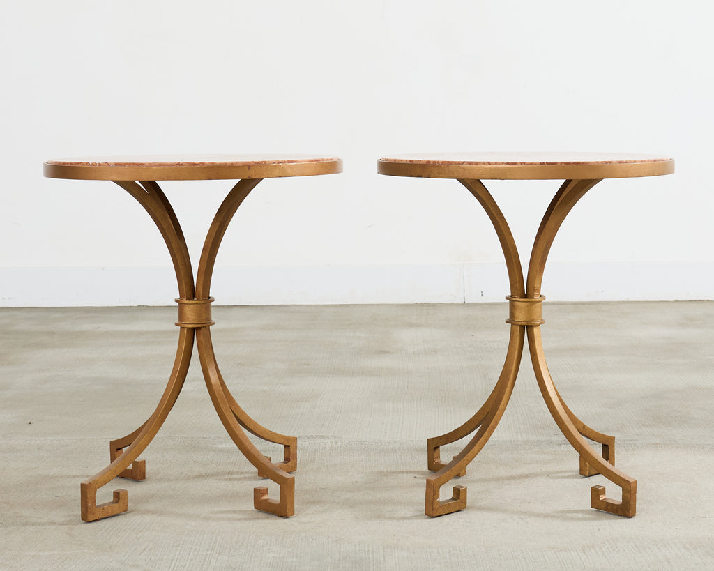 Whimsical pair of midcentury wrought iron drinks pedestal tables made in the manner and style of Arturo Pani (Mexican 1915-1981). The tables are crafted from solid square iron with a round top inset with colorful Italian Rosso Asiago marble measuring 1 inch thick. The marble is supported by four gracefully curved legs that conjoin in the middle and end with neoclassical Greek key motif feet. The iron has a gilt finish that accents the fiery red-orange Italian marble beautifully and provides a strong anchor of color to the space. The iron has a desirable aged patina to the gilt finish as seen in photos. Sold as a pair. The tables are very heavy and solid with excellent joinery and craftsmanship. From an estate in San Francisco, CA.