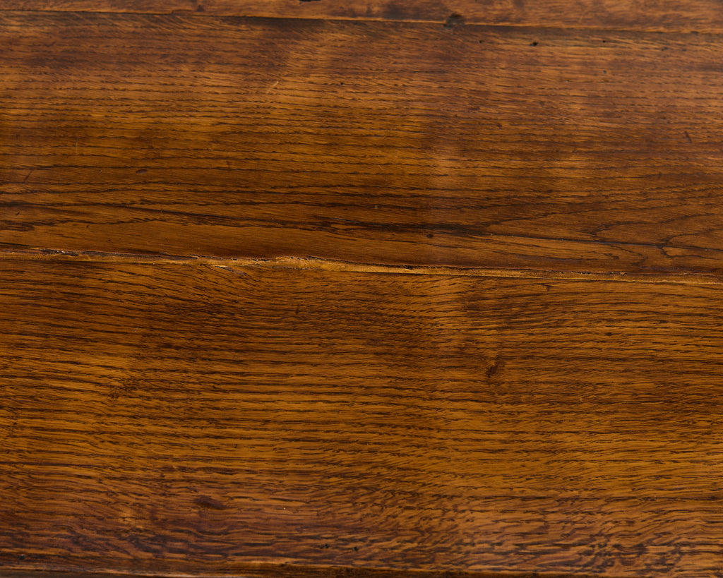 Wear includes surface markings, scratches, and darkening from use. Some mild age splits at plank edges and on stretcher. Some light scattered worming/pitting to at least one leg. Some reinforcement fasteners added at a later date on stretcher intersections to provide stability. Filled splits and gaps as seen in photos. Table remains structurally sound and functional.