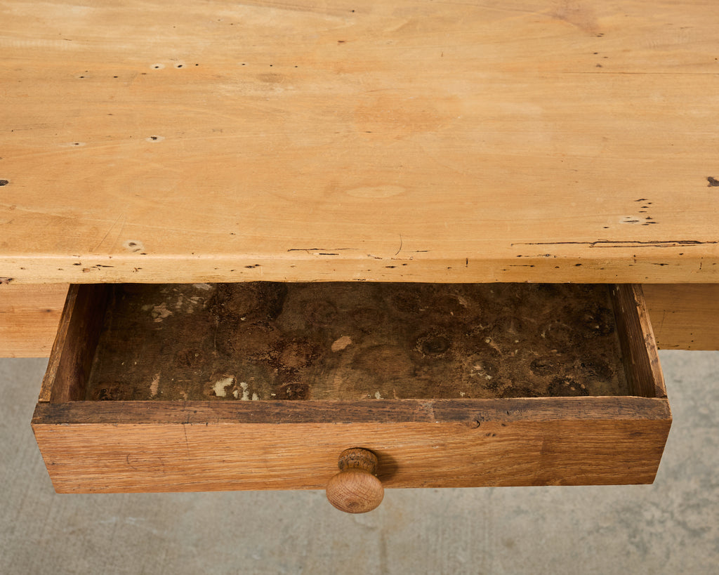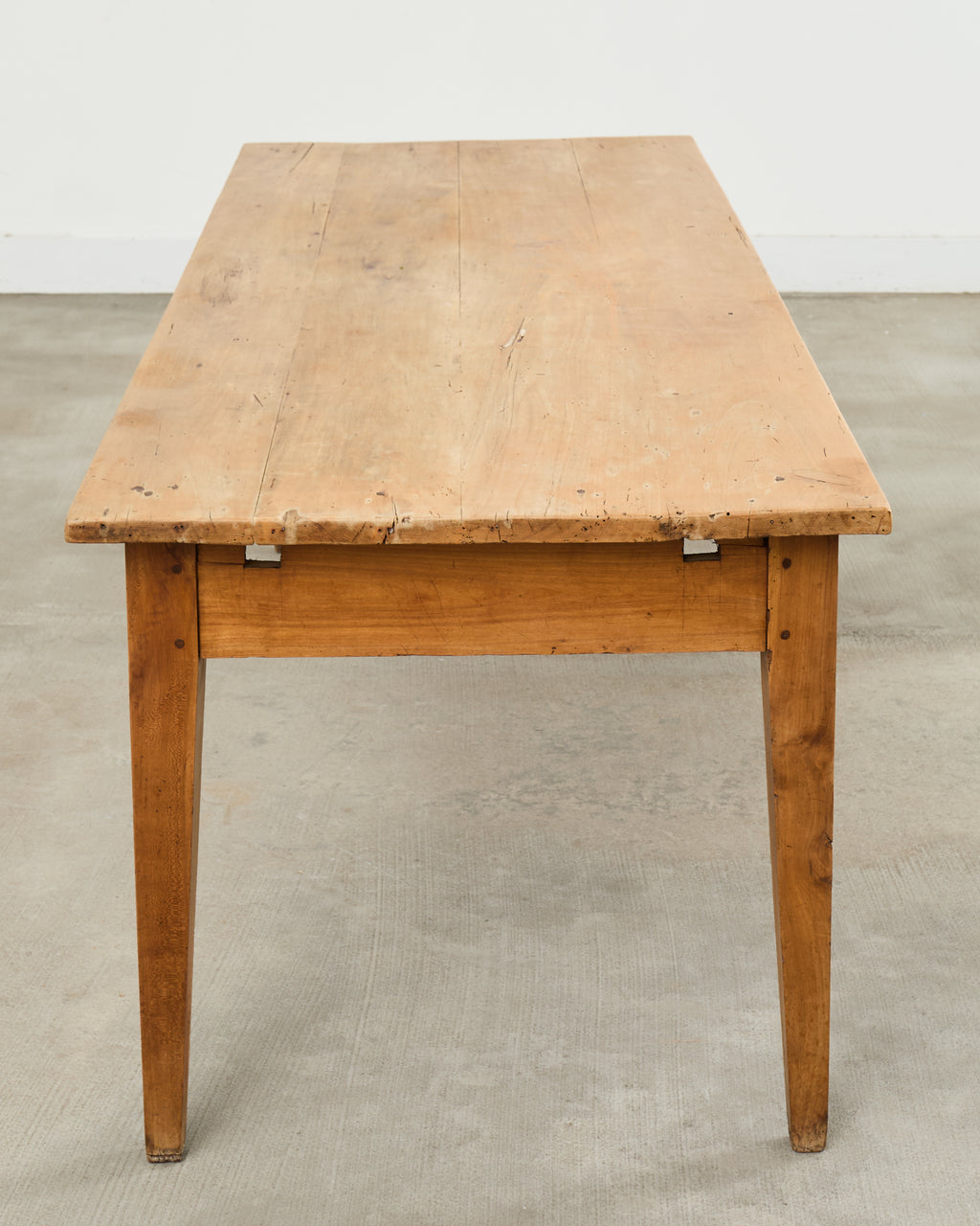 Charming late 19th century country French provincial farmhouse work table crafted from fruitwood. The table features a 1 inch thick plank top and a small storage drawer in the frieze on one side. The table is sturdy and solid with excellent joinery and craftsmanship. The fruitwood has a gorgeous warm, soft patina in a light honey tone. The wood has a desirable weathering and age giving the piece character. This style of table was the work horse of the French kitchen serving several tasks. Classic European skinny dimensions and profile in the farmhouse aesthetic. The top is supported by elegant tapered legs with wood peg joinery. From an estate in the Napa Valley, California. Erin Lane Estate specializes in European farm tables with over 100 in stock ready to ship from our warehouse in California.