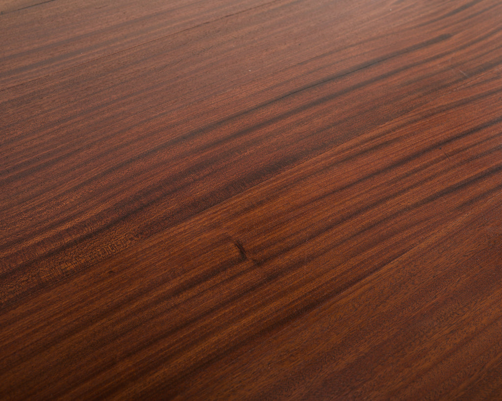 Gorgeous 20th century country French farmhouse dining table featuring a rare mahogany construction. The table has a 2 inch thick solid mahogany plank top having a straight edge border. The top is supported by a massive trestle base with 4 inch thick square post legs conjoined by an H form stretcher. Each end of the table is fitted with a small storage drawer having a patinated brass round pull. Ample leg room measuring 24 inches from the floor to the apron. The radiant mahogany woodgrains are featured throughout the table with a dark finish. The finish has a desirable aged patina to commensurate its age and use. Very heavy and solid with excellent joinery and craftsmanship. Erin Lane Estate specializes in European farmhouse tables with over 100 in stock ready to ship from our California warehouse.