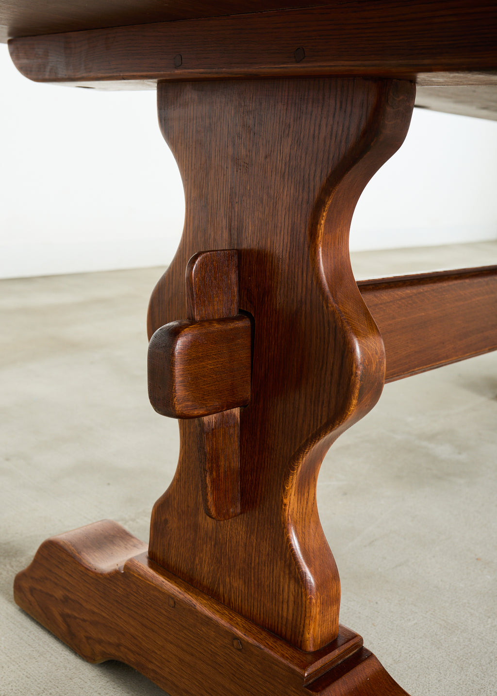 Grand country French provincial farmhouse trestle dining table constructed on a monumental scale measuring nearly 11.5 feet long. Hand-crafted from massive oak timbers featuring a 3 inch thick top which is surprisingly flat given its size. The substantial top is supported by a triple pedestal trestle base. Gracefully curved baluster legs are conjoined by a long stretcher and end with shoe feet. The table showcases the rich oak woodgrains throughout with rounded, smooth edges. The table is very heavy and solid having excellent joinery and craftsmanship. Designed in a refectory style to resemble an 18th century monastery table with a grand scale and presence. Erin Lane Estate specializes in large European farm tables with over 100 in stock ready to ship from our warehouse in California.