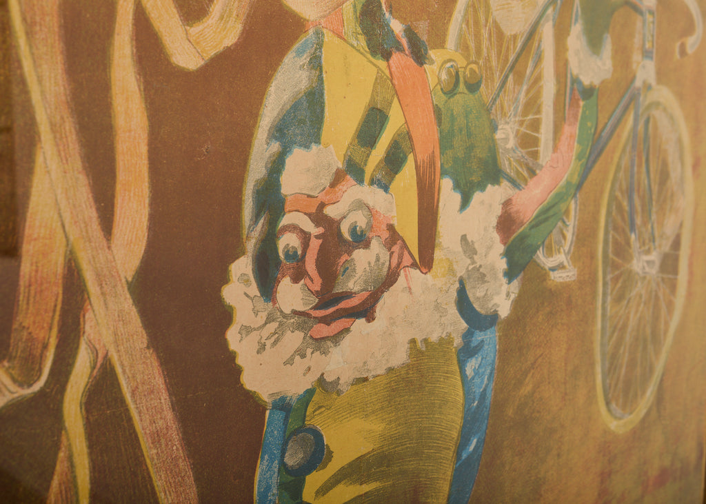 Whimsical large early 20th century Belle Epoque period bicycle advertisement poster for Cottereau bicycles. Illustrated by Henry Boulanger, lithograph signed reads "H. Grey". Crafted during the height of the Parisian poster craze. Text reads "usine a Dijon" or factory in Dijon. The large ad is mounted in a walnut frame with a gilt border. The paper is protected by UV rated plexiglass in a museum style of framing. The illustration is vibrant with theatrical exuberance and color rich energetic fin-de-siecle style. From an estate in San Francisco, CA.