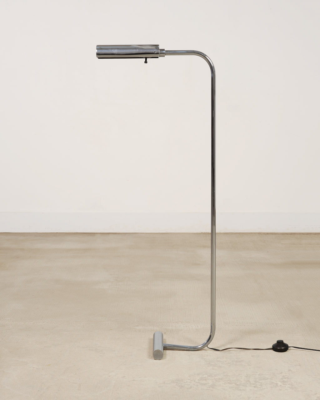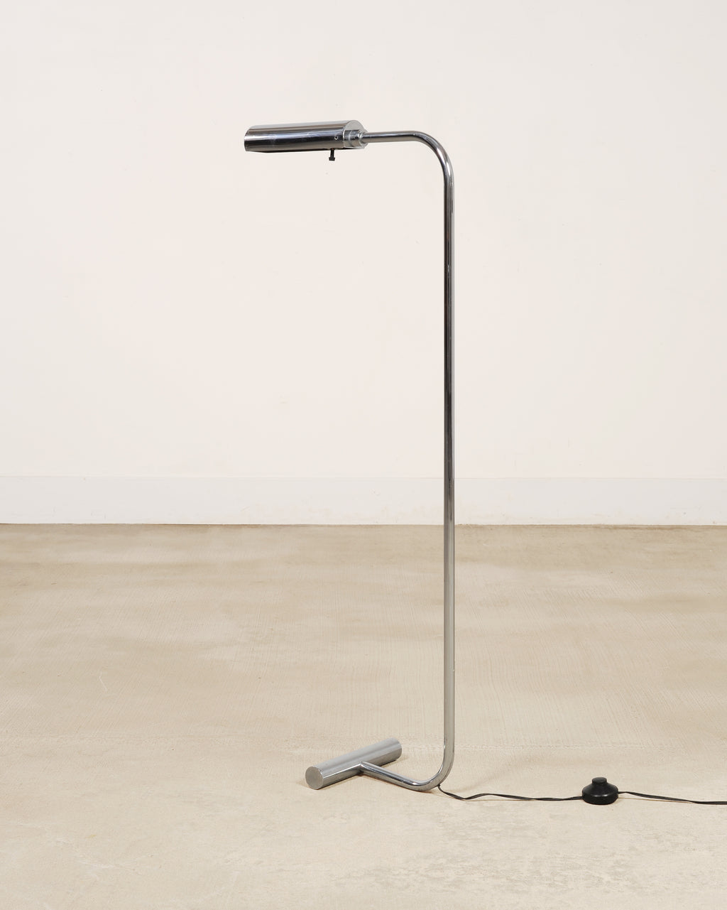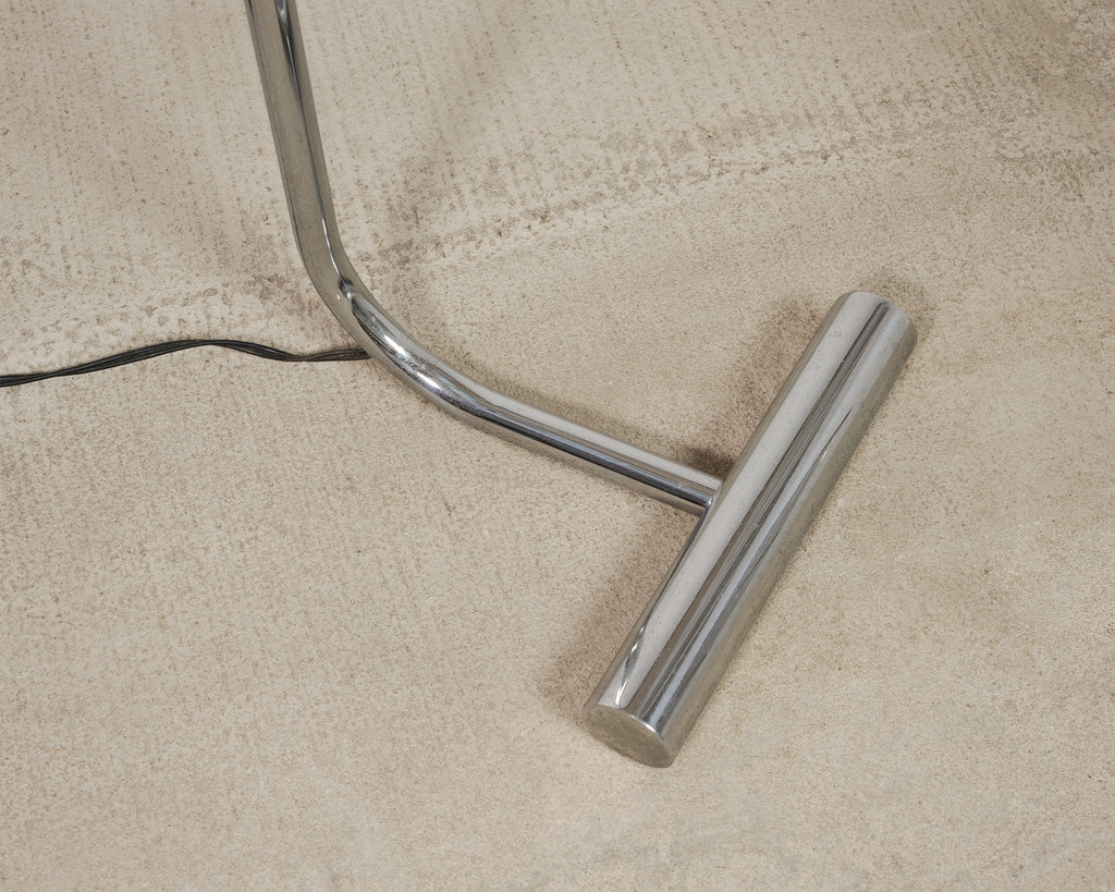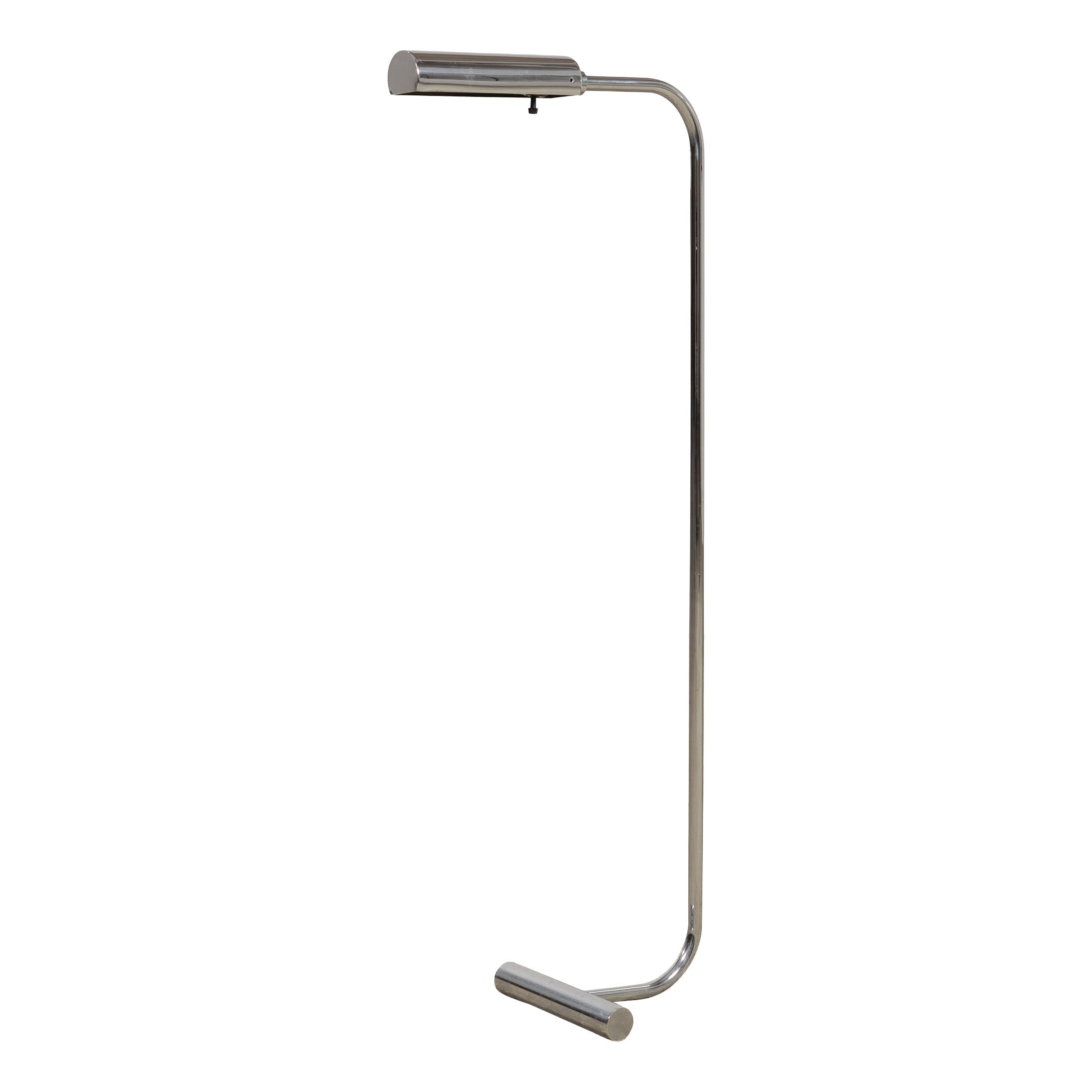 A sleek mid-century modern minimalist chrome and steel pharmacy floor lamp featuring a continuous bent tubular stem rising from a weighted T-bar base. The stem of the lamp ends in a cantilevered cylindrical head designed to focus light downward. The polished metal surface gives the lamp a crisp, reflective presence, while the low-profile base gives the piece a modern and light silhouette. The lamp has a subtle black cord with an inline foot switch and a type A plug. The chic lamp is designed in a mix of Mid-Century Modern, Minimalist, and Bauhaus styles, after similar designs by Cedric Hartman, and Casella Lighting. From an estate in San Francisco, CA.