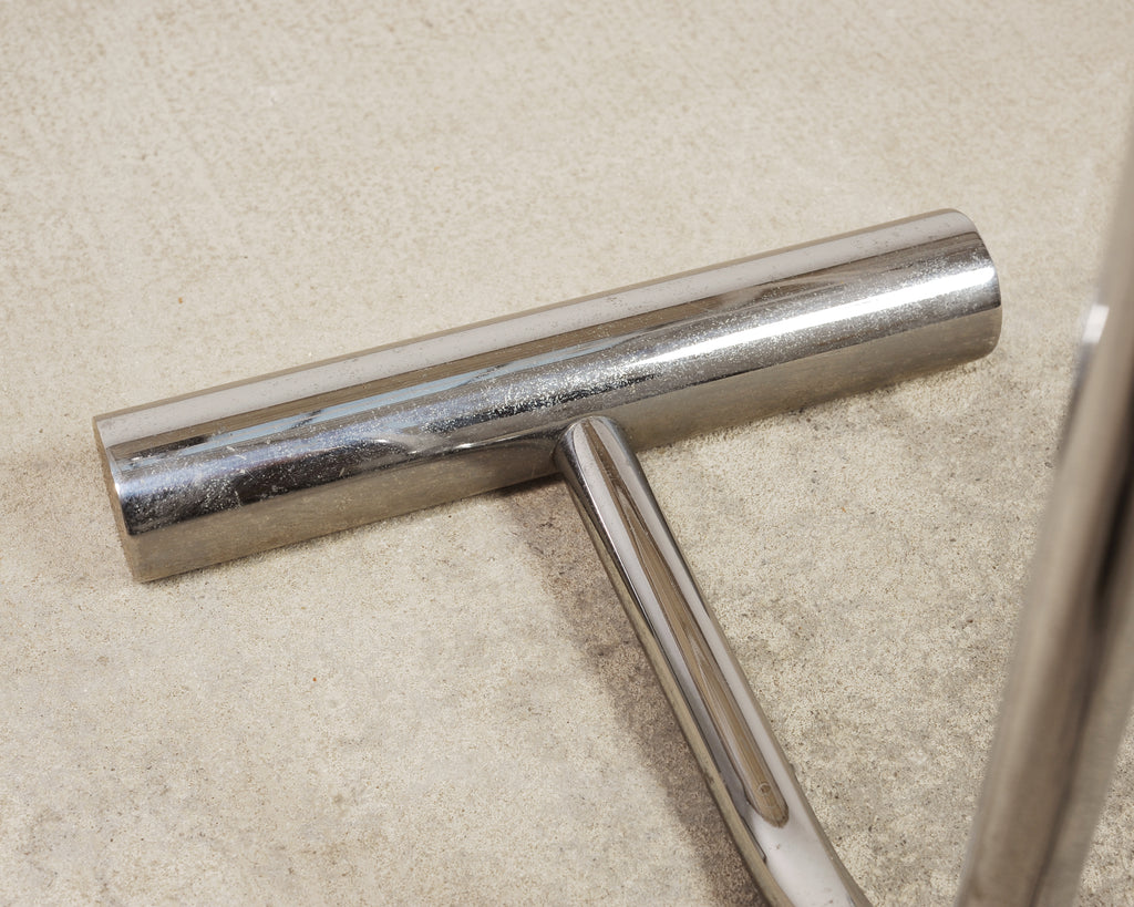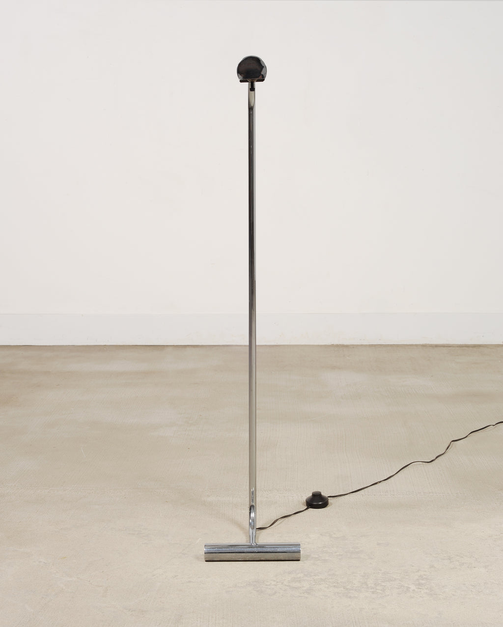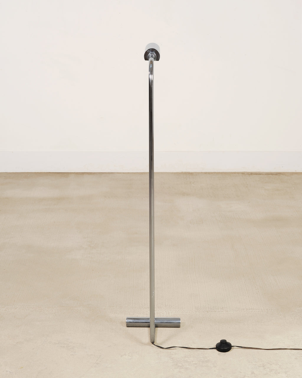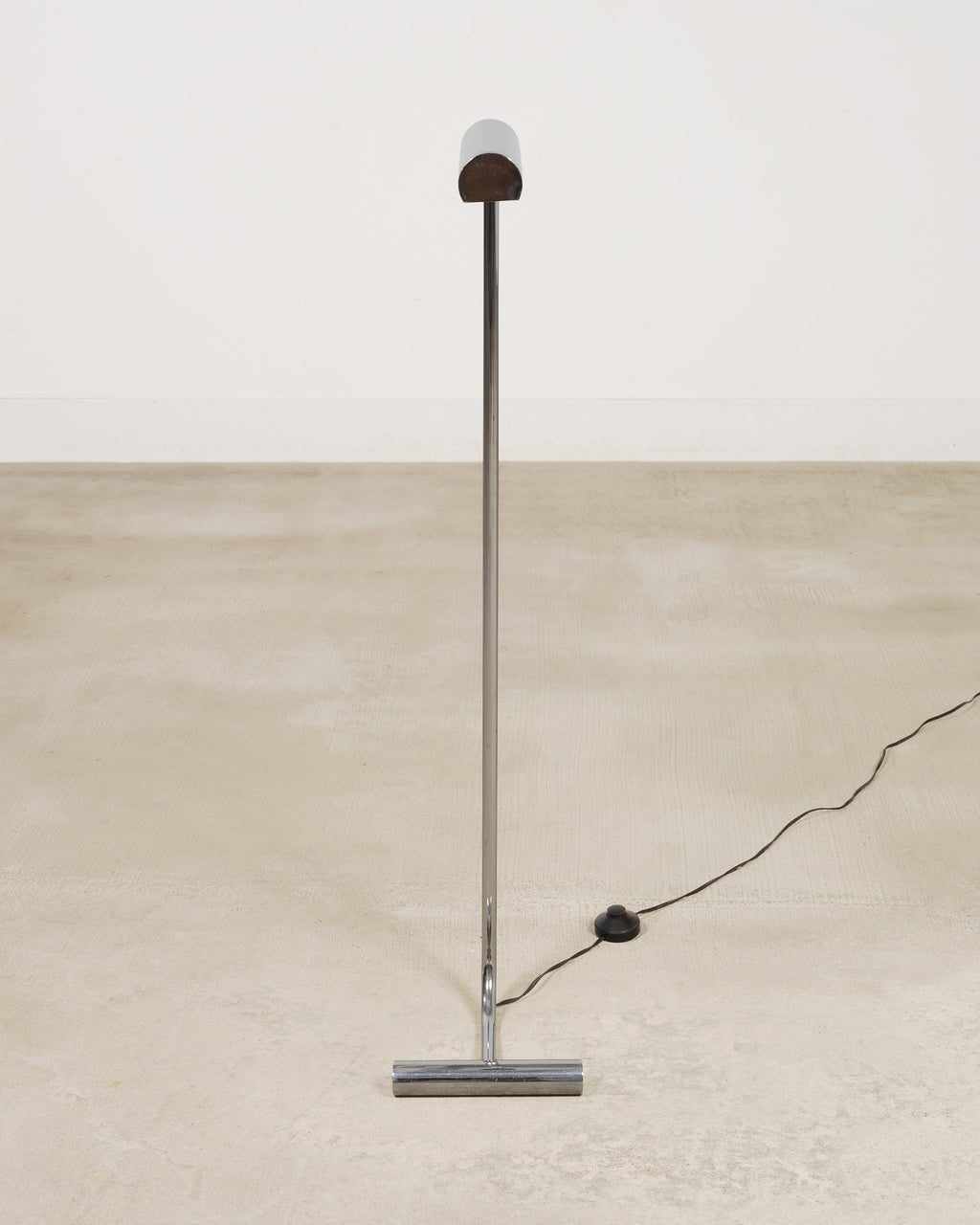 A sleek mid-century modern minimalist chrome and steel pharmacy floor lamp featuring a continuous bent tubular stem rising from a weighted T-bar base. The stem of the lamp ends in a cantilevered cylindrical head designed to focus light downward. The polished metal surface gives the lamp a crisp, reflective presence, while the low-profile base gives the piece a modern and light silhouette. The lamp has a subtle black cord with an inline foot switch and a type A plug. The chic lamp is designed in a mix of Mid-Century Modern, Minimalist, and Bauhaus styles, after similar designs by Cedric Hartman, and Casella Lighting. From an estate in San Francisco, CA.