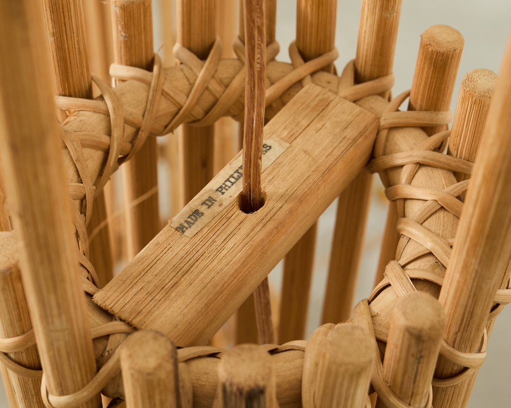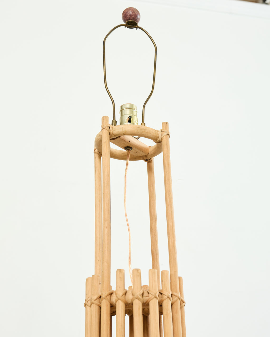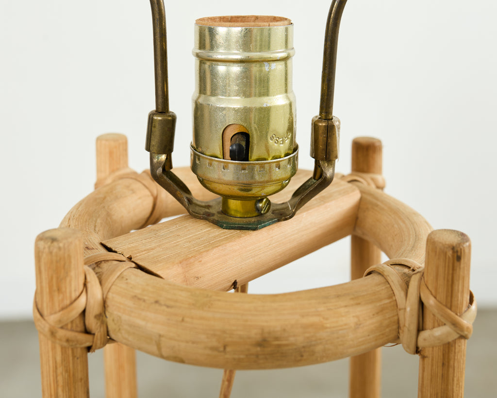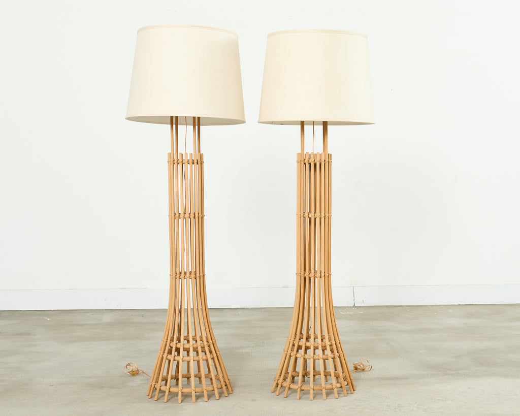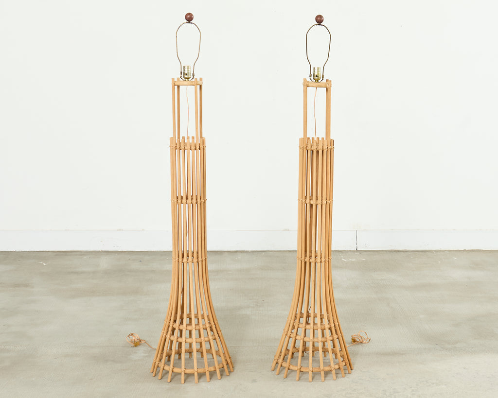 Sculptural mid-century modern floor lamps crafted from pole rattan in the organic modern style and manner of Italian designer Franco Albini (Italian 1905-1977). The tall lamps measure over 5 feet tall and feature a gracefully tapered column form. The pole rattan is bundled around ring stretchers with wicker lashes. Topped with drum shaped shades by Leonard Foss and ending with painted round wood ball finials on top. The slender shape has a natural airy design with a basket like silhouette on the base. Sold as a pair. From an estate in San Francisco, California.