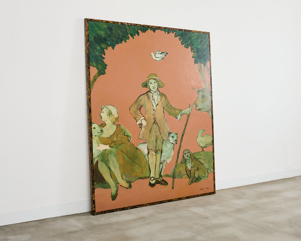 Grand imposing oil on canvas painting of a country French provincial farmer couple with various animals measuring 8 feet high and 6.5 feet wide by Ira Yeager (American 1938-2022). The painting features a dramatic peach-orange background decorated with figures and animals having a whimsical light green tone. The border of the painting has a Yeager trademark speckled edge an homage to when he could not afford frames for his work. The painting is signed on bottom right "Yager 1791" his nom-de-plume signature and fictional date. Very impressive size and scale with vibrant color providing a strong commanding, anchor to the room or space.