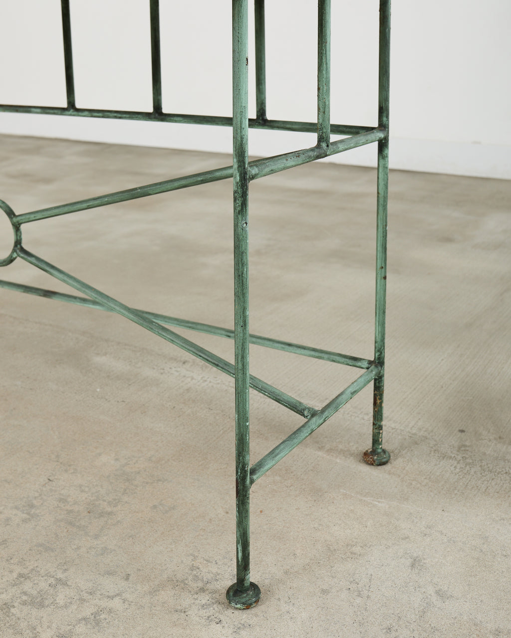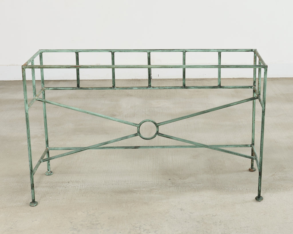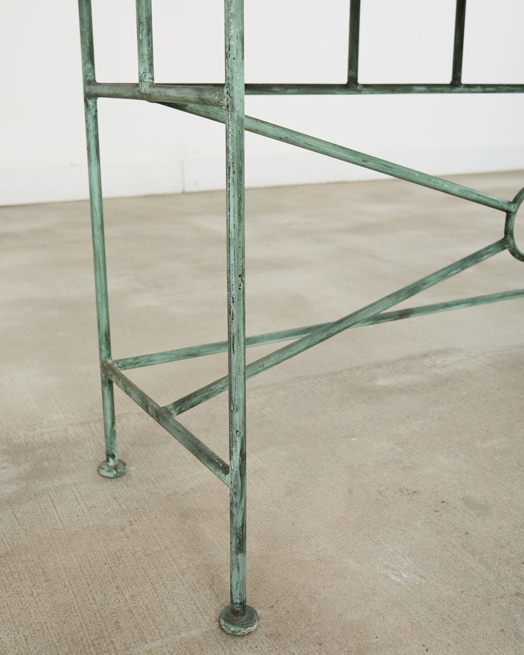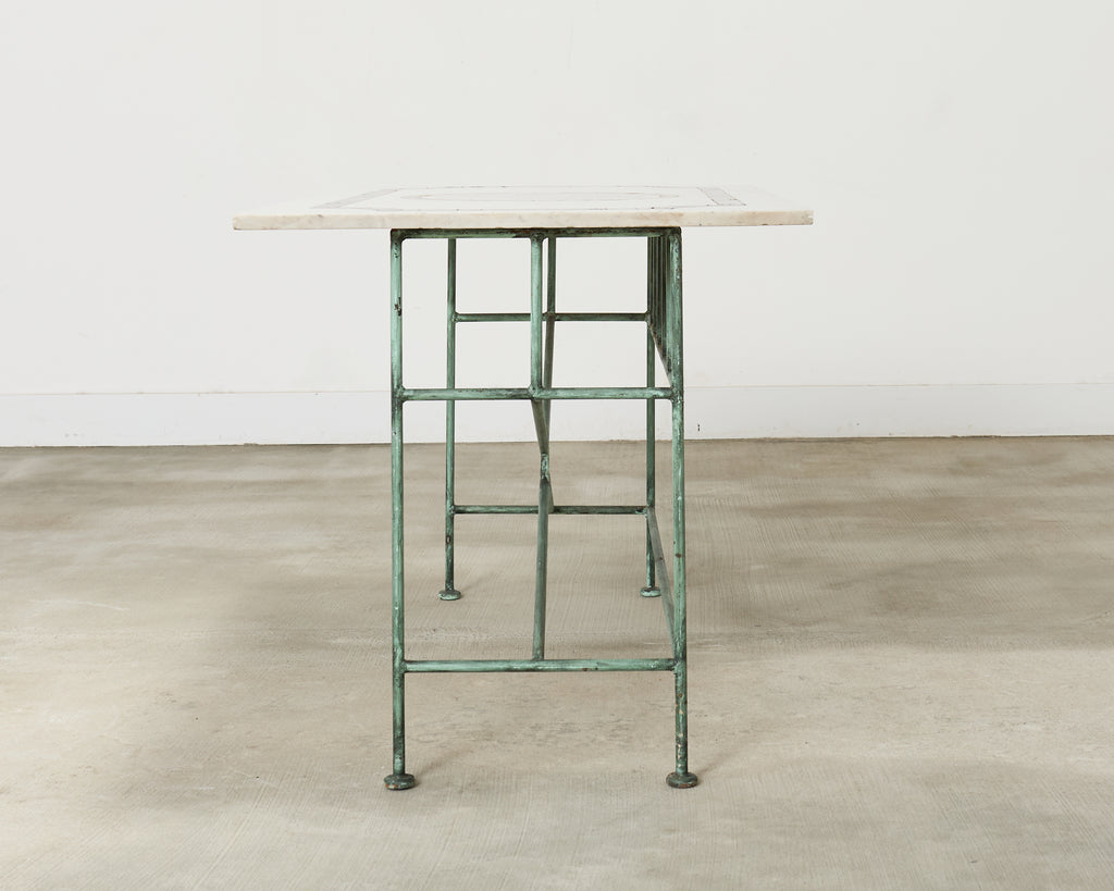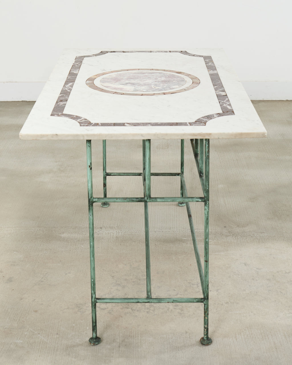 Amazing Italian iron and Carrara marble top specimen console table crafted in the neoclassical Pompeiian taste. The table features an Italian marble top measuring over 4 feet long inlaid with multi-colored shades. The design has a circular motif in the middle. The thick marble slab is supported by an iron base with an applied verdigris finish. The base is crafted from thick round iron rods with a decorative x-form stretcher with a circle in the middle. The design is reminscent of Italian style furniture by Mario Papperzini. The console would be suited for garden, orangerie, or a grand entry. The marble has a desirable aged patina on the finish and a classical form with highly skilled European craftsmanship. The table is sturdy and strong with solid joinery. From an estate in the Napa Valley, CA.