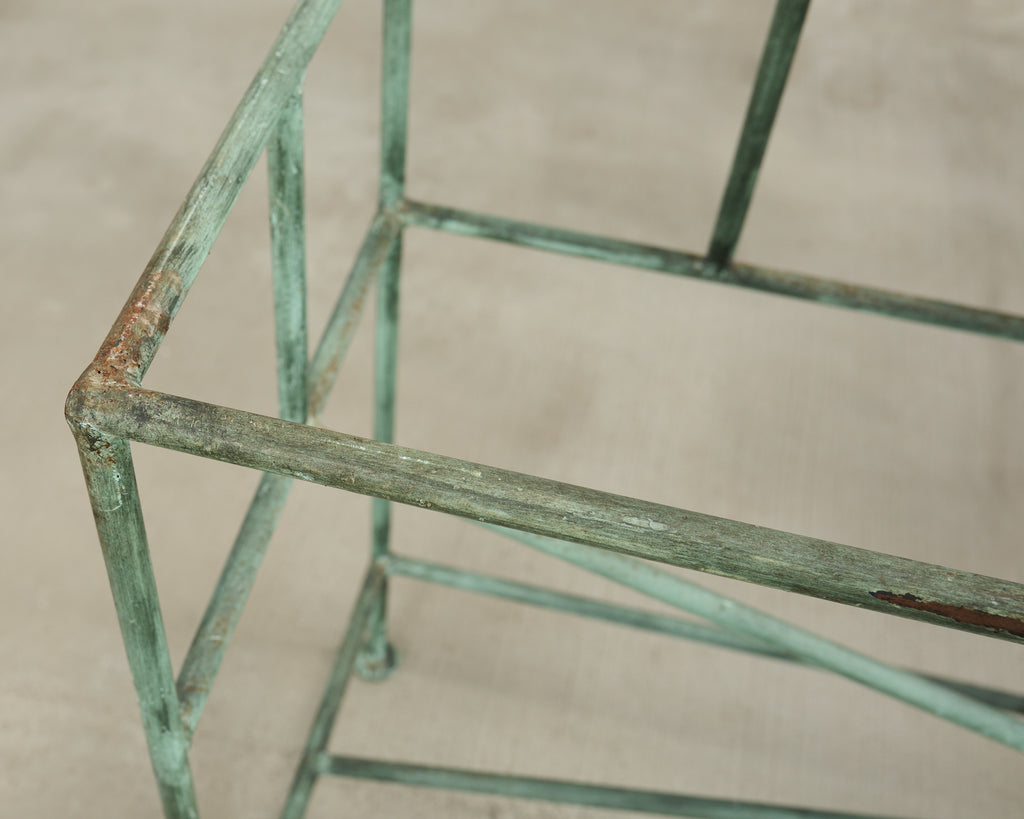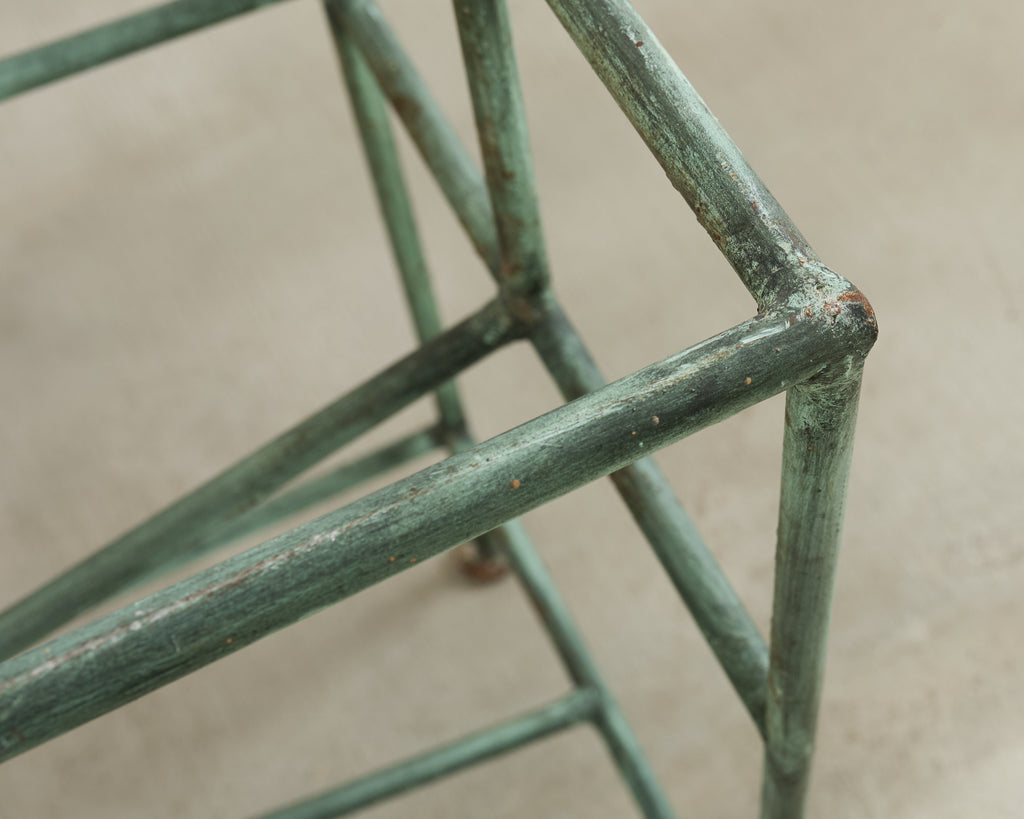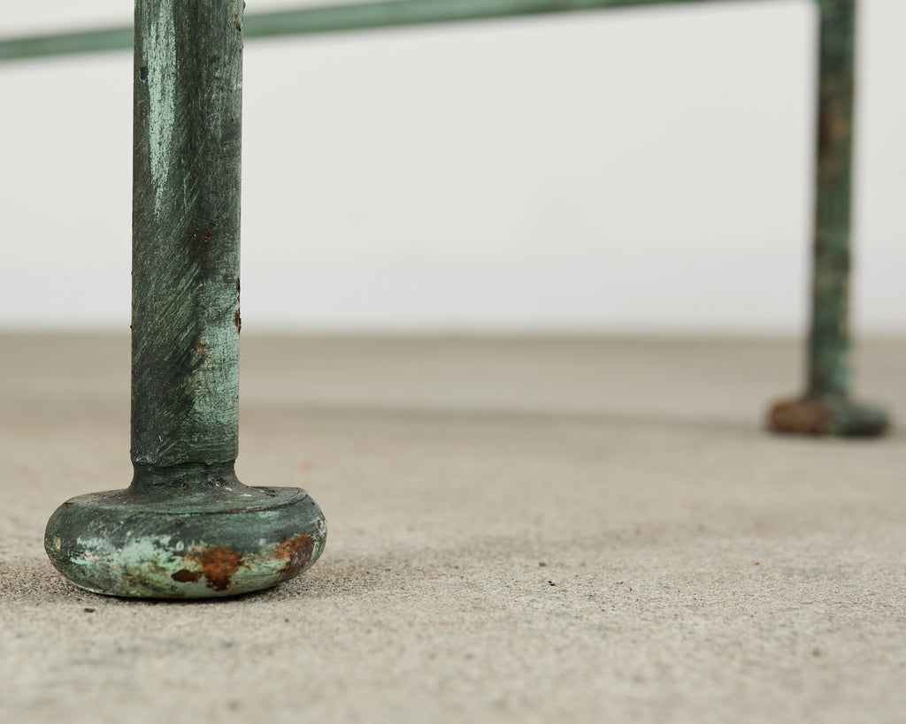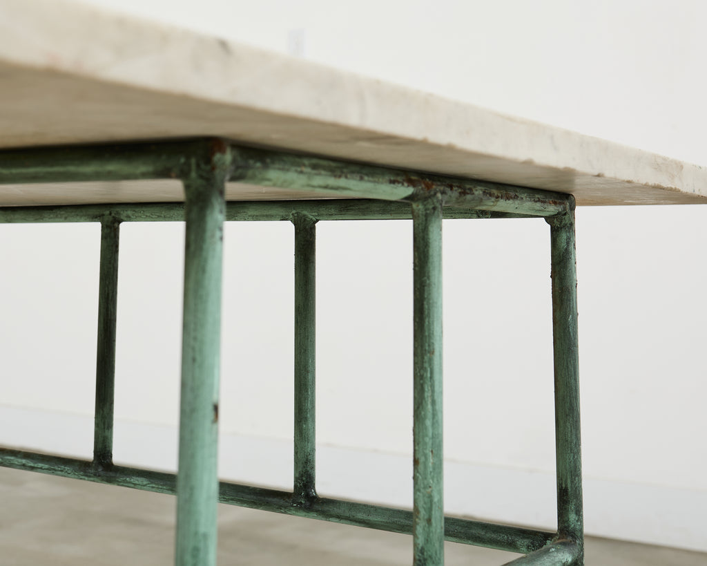 Condition: Distressed, wear consistent with age and use. Beautifully crafted with solid joinery and construction. Aged patina on marble with minor chips, scuffs, and light stains on marble as seen in photos. Iron has a patinated verdigris finish applied.