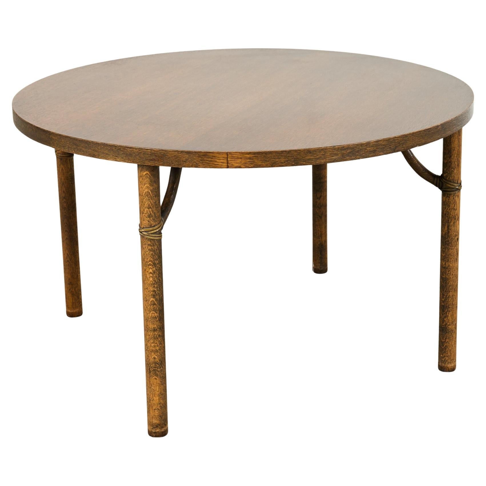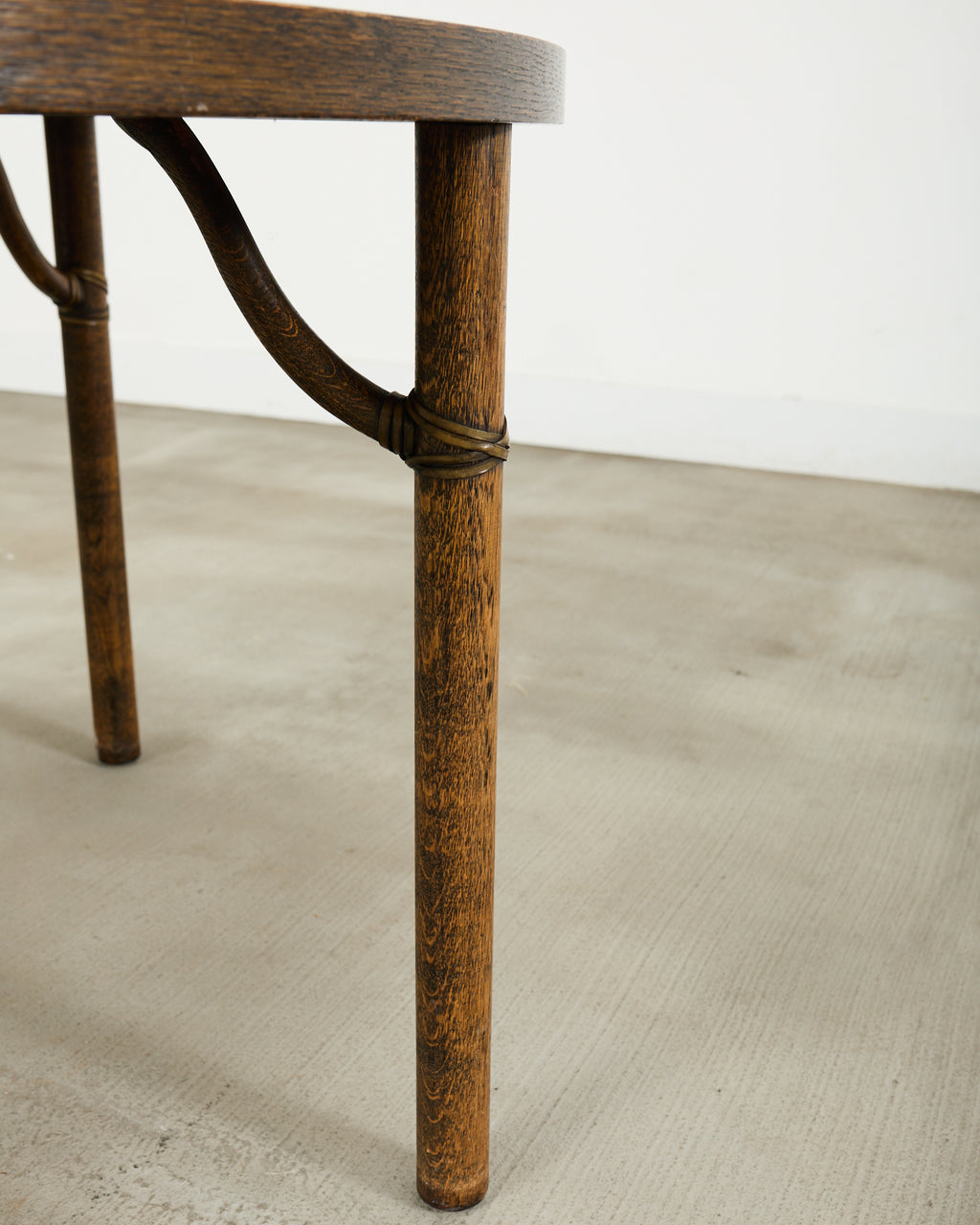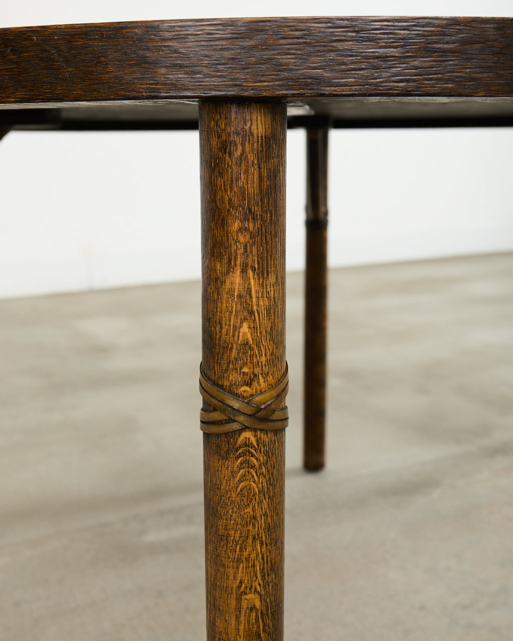 Mid-century modern oak card games table or dining table crafted in the California coastal organic modern taste by McGuire artisans. The table features a round oak top measuring 45 inches in diameter and 1.5 inches thick. The top is supported by faux bamboo round oak legs with gracefully curved spandrel supports having leather rawhide laces on the exposed joints. The table is very sturdy and solid with excellent joinery and craftsmanship. The top showcases the rich oak woodgrains with a dark finish. Classic mid-century games table profile and design that could be used as a breakfast dining table also. Four matching lounge chairs also available. From an estate in San Francisco, CA. McGuire plaque on bottom of table.