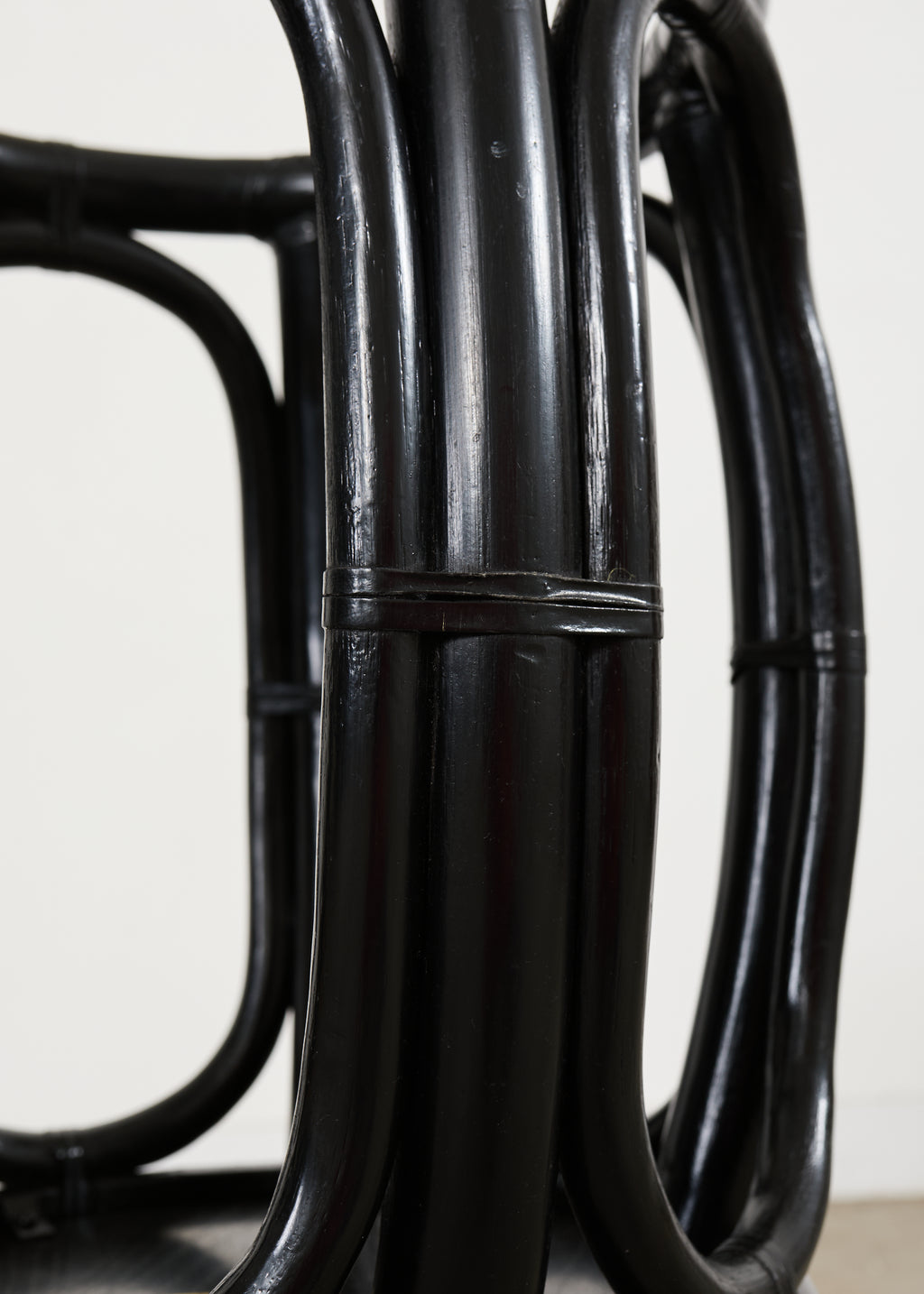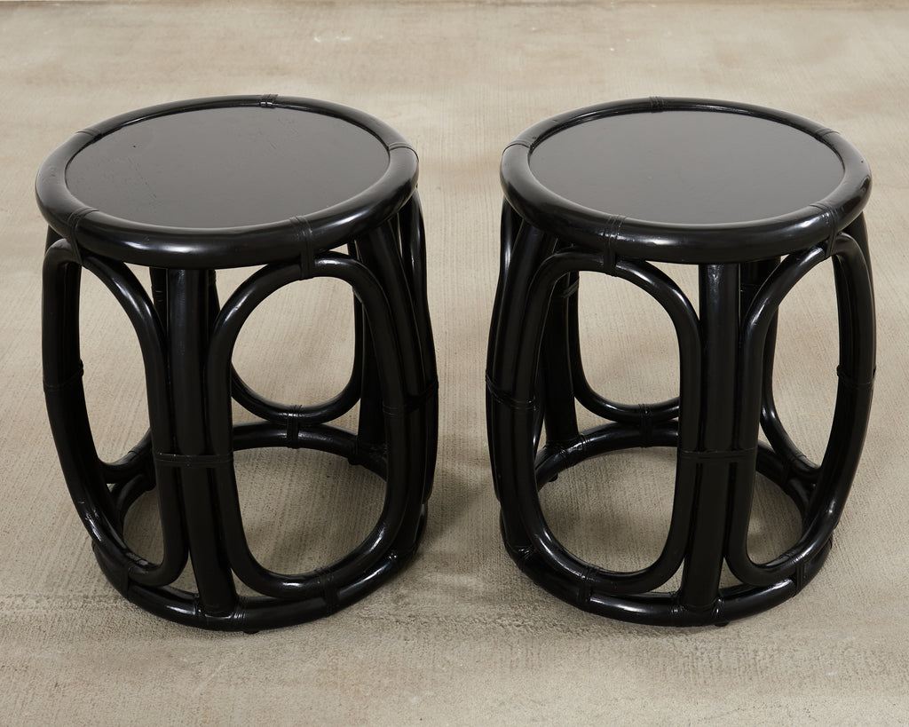 Chic pair of black lacquered rattan taborette drum form drinks tables or stools crafted in the California coastal organic modern style by McGuire artisans. The tables feature a pole rattan thick frame with an oak round top. The rattan poles are lashed together with leather rawhide laces on the exposed joints. The tables have a round barrel drum form with a handsome silhouette. The design is open with large oval windows on all sides. Sturdy and strong with excellent joinery and craftsmanship. The frames have a modern redux in a jet black satin finish. Sold as a pair. From an estate in the Napa Valley, CA.