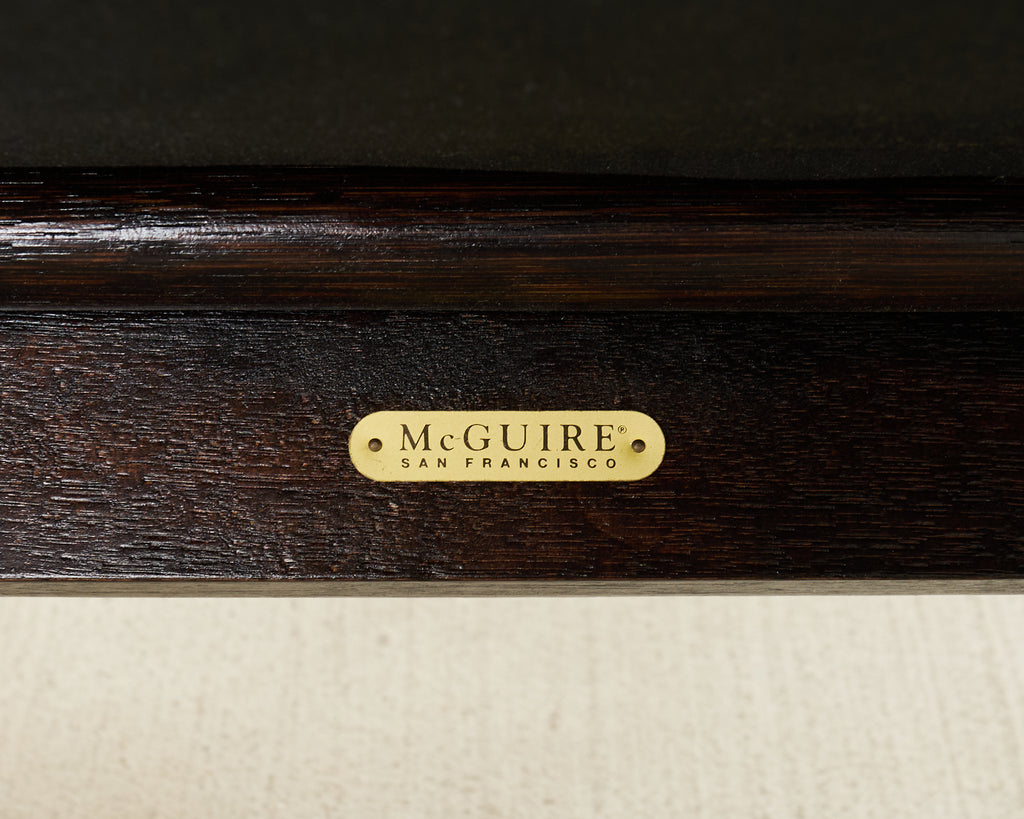 Stylish and rare pair of large lounge chairs or club chairs with matching ottoman designed in the California coastal organic modern style by Barbara Barry for McGuire. The chairs feature a gracefully curved rattan frame with tightly woven mesh cane inset and Barry's signature oval cut out on the back. The set includes two chairs, one ottoman and two throw pillows. The frames feature a dramatic dark tobacco finish. The generous seats and ottoman are upholstered with a subtly striped fabric with an ecru background. The chairs are sturdy and strong with excellent joinery and craftsmanship. The rattan is lashed together on the legs with leather rawhide laces. The chairs have a crisp, modern design in very good well preserved condition. Each piece has the original McGuire plaque on bottom. Sold as a set of three.