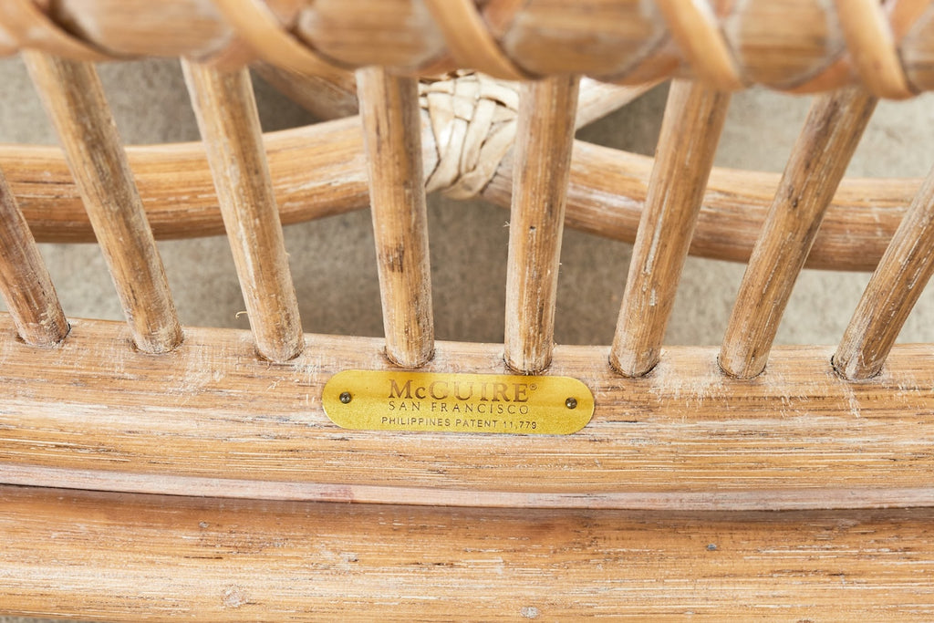 Elegant pair of McGuire rattan loop back dining armchairs made in the California coastal organic modern style. One of McGuire's most iconic and beautiful chair styles designed by Elinor McGuire in the 1970s. The chairs feature a sinuous loop back splat inside a square frame. The arms gracefully curve down to a generous square seat. The rattan is reinforced with an abundance of leather rawhide laces on the exposed joints. The seat has a fitted loose seat cushion upholstered with a vintage fabric that is still presentable, but faded. The arms measure 25 inches high. Excellent joinery and craftsmanship with a subtle cerused finish or glaze on the blonde rattan accented by cream colored leather laces. Each chair has a McGuire makers plaque on bottom and a pearlescent "M" signifying McGuire's highest quality pieces. From an estate in Napa Valley, CA.