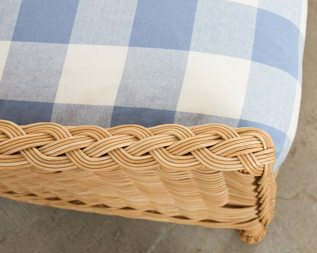 Amazing pair of barrel back form rattan wicker lounge chairs or club chairs made in the California coastal organic modern style by McGuire artisans. The rare chairs feature a strong rattan frame covered with woven wicker. The arms gracefully curve around the frame with a decorative band of braided wicker. The set includes an ottoman measuring 24 inches wide, 15 inches deep, and 18 inches high. The chairs and ottoman have newly upholstered fabric on the cushion with a large gingham pattern design. The chairs are in exquisite condition with excellent joinery and craftsmanship. The natural finish on the wicker has a desirable faded and aged patina and the chairs have a classic silhouette and are very comfortable. From an estate in Santa Barbara, California. Sold as a pair.