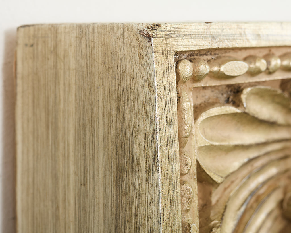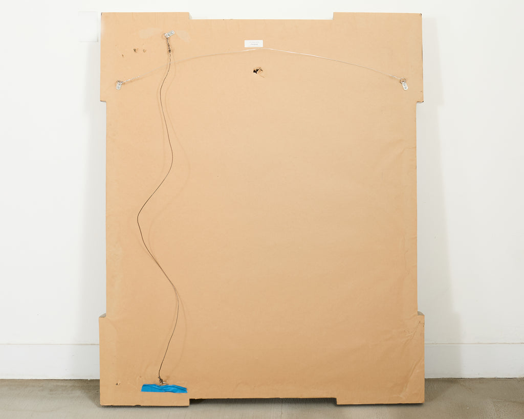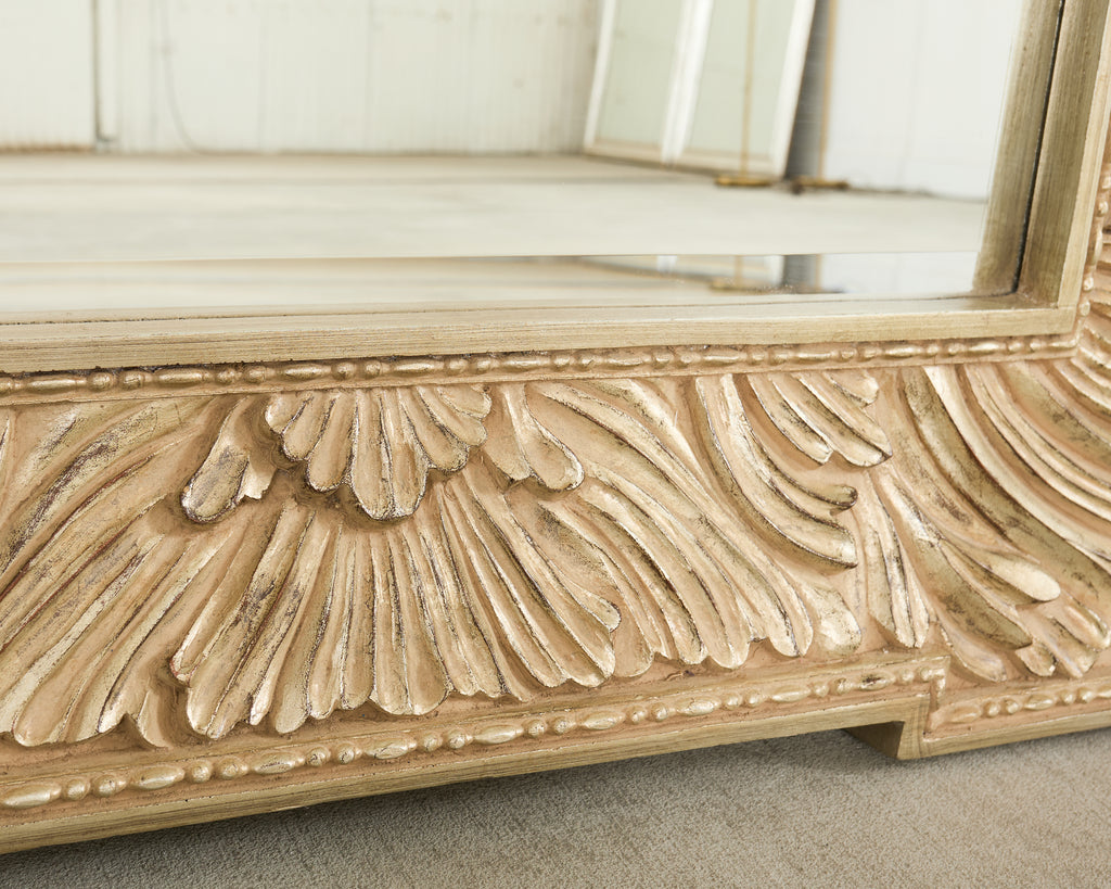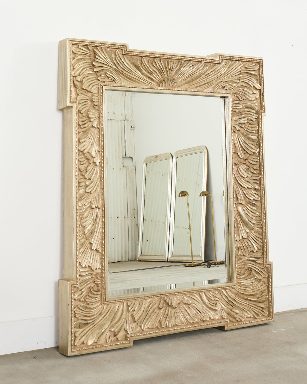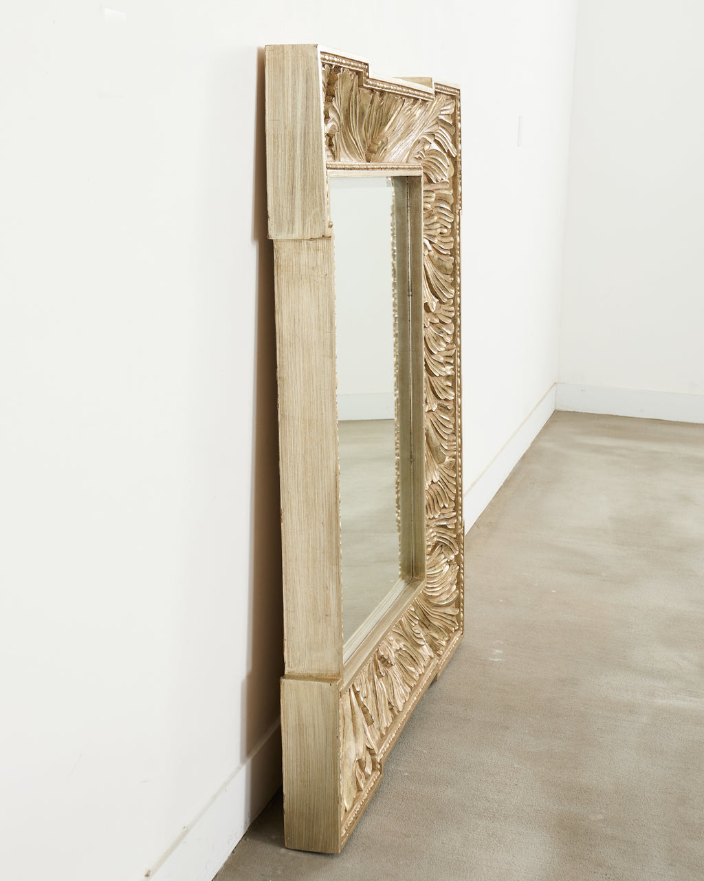 Impressive silver gilt wall mirror crafted in the baroque taste by Howard Elliot. The mirror is nearly 5 feet tall and 4 inches deep. The frame has a Flemish inspired design with notched corners. The frame is embellished with foliate, acanthus, and rocaille motifs having a delicate beaded inner and outer border. The frame has a thick, beveled glass mirror plate. The silvered finish has an intentionally distressed patina to mimic age. The frame is deeply carved with intricate details. From an estate in San Francisco, California.