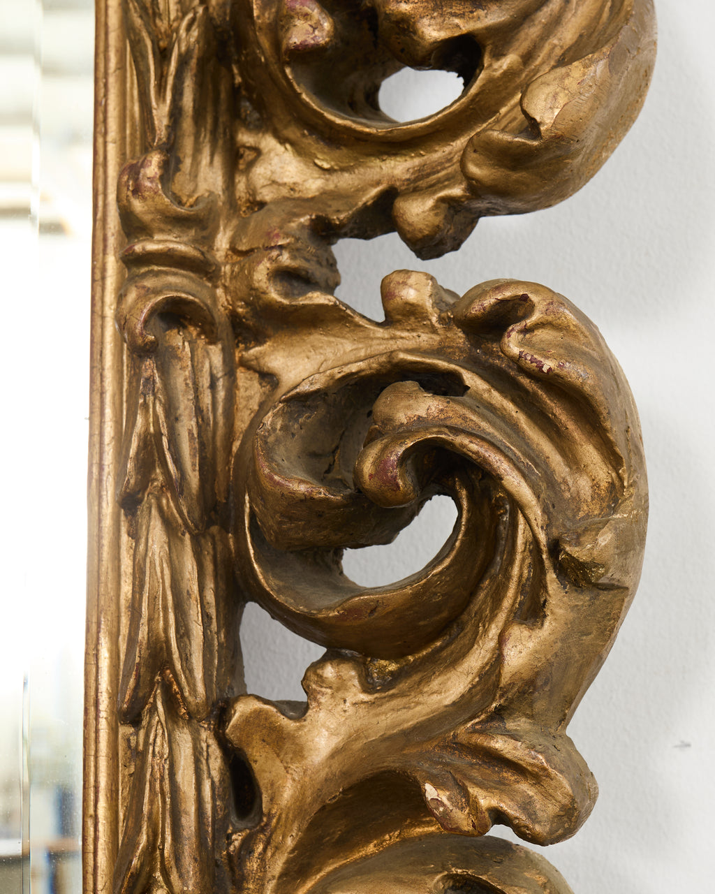 Imposing 19th century Italian carved floor mirror made on a grand monumental scale measuring over 6 feet tall. The mirror features a hand-beveled period thick glass plate mounted in a deep relief-carved gilt wood frame. The frame has elegant scroll work in gesso of large acanthus and laurel leaves in the baroque rococo taste. The aged gilt patina has a warm burnished finish to commensurate age and use. The frame is impressive with 3 inch thick gracefully curved details. From a historic mansion in San Francisco, California.
