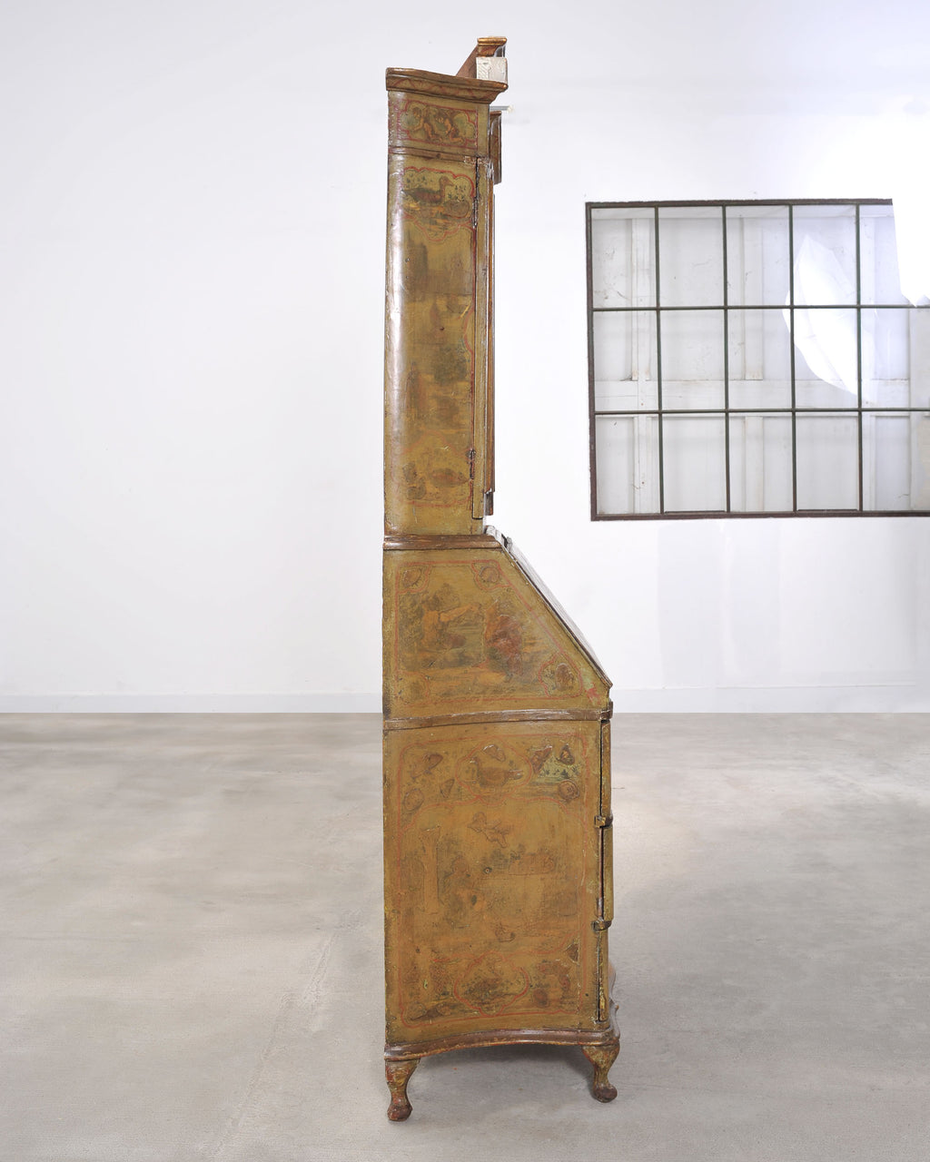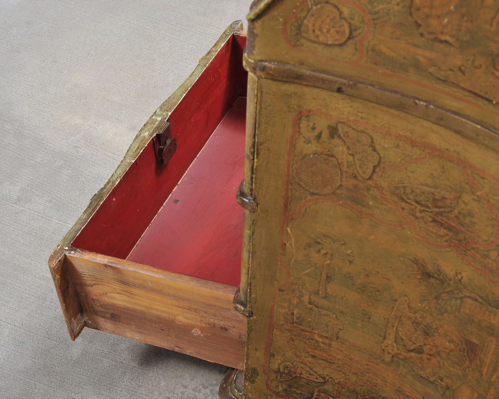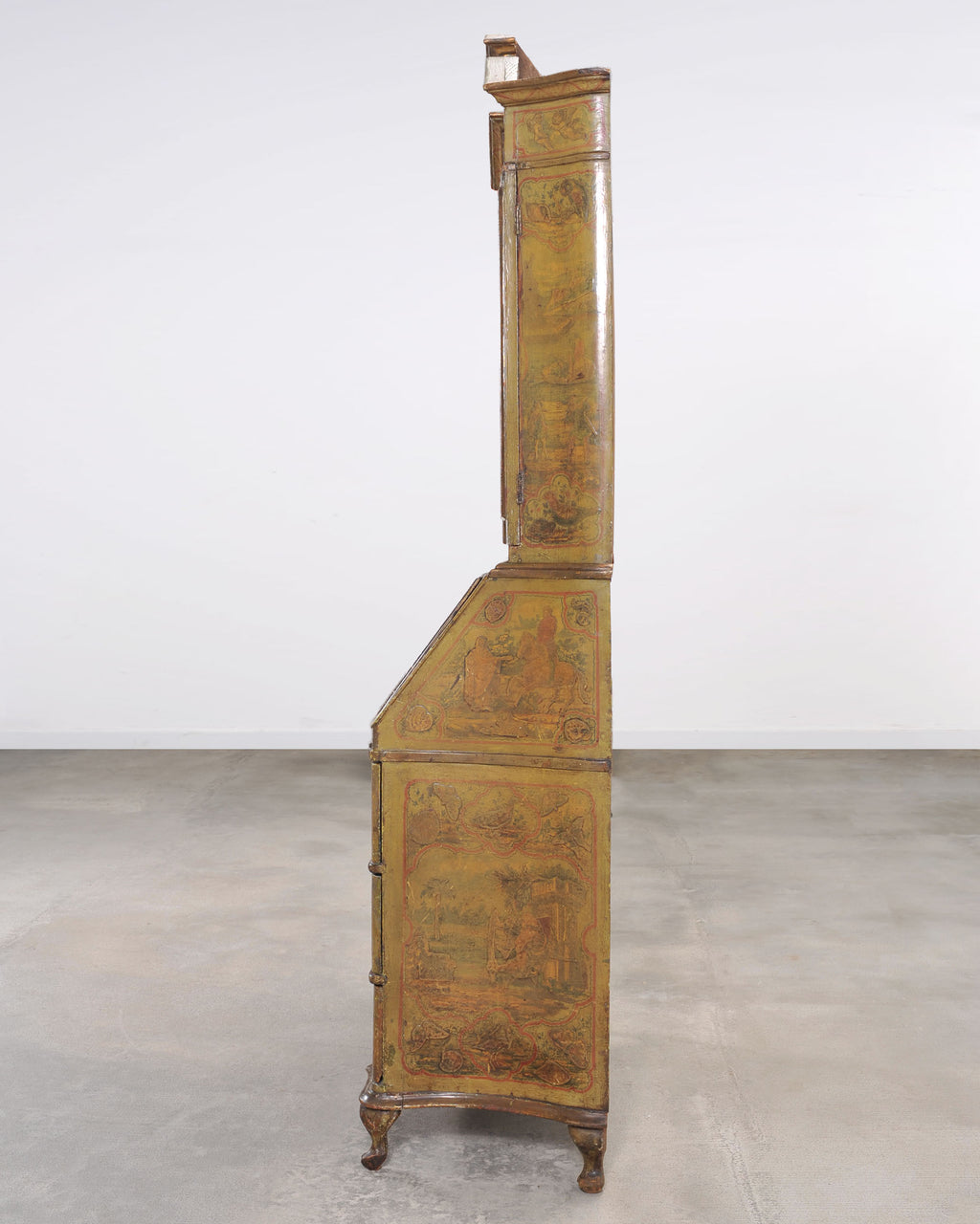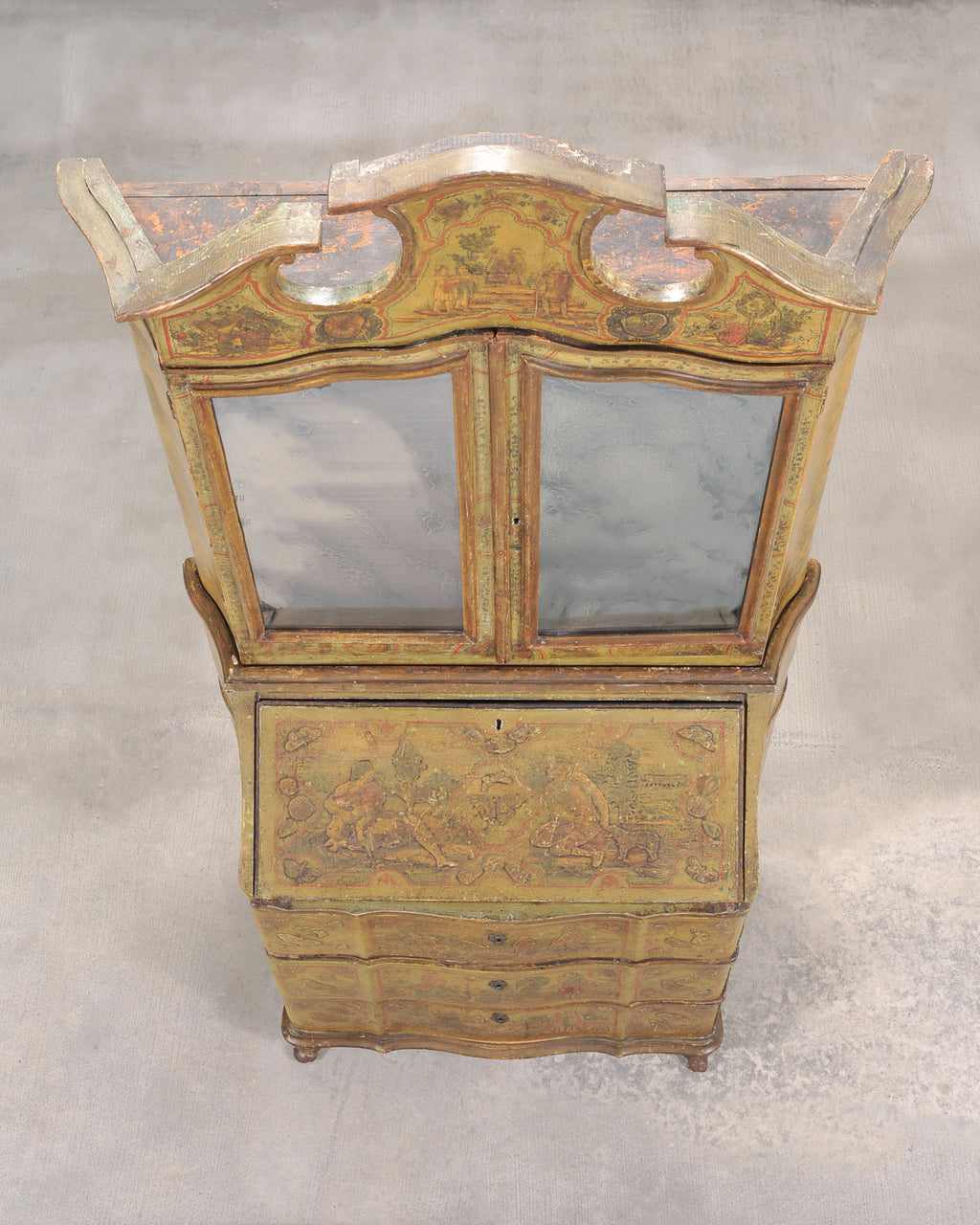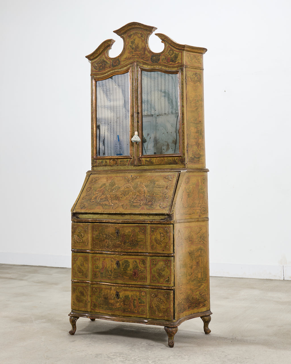 An elegant and imposing late 19th century two-part Italian secretary bookcase cabinet or desk crafted in the Venetian and Rococo Revival period styles. The piece features a beautifully timeworn lacquered surface with hand-painted figural and scenic landscape decoration throughout. The lacquered exterior is richly ornamented with painted reserves in relief depicting pastoral scenes, figures, butterflies, birds, and decorative flourishes on a warm ochre and olive-toned ground with red and green edging. The upper case is crowned by a shaped Rococo broken pediment crest. The case is fronted by a pair of doors inset with foxed antique mirror plates, which open to reveal a striking oxblood red-painted interior. Fitted with pigeon holes, cubbies, multiple shelves, and letter compartments. The interior of the doors open to reveal a stunning composition of a landscape with figures, echoing the exterior. The lower section is formed as a chest of drawers surmounted by a slant-front desk secrétaire. The drop front opens to a fitted interior with arched pigeonholes, small drawers, and a writing surface above the three large drawers. The cabinet rests on short elegant cabriole legs ending with scrolled feet. The cabinet has a wonderfully aged weathered finish with a beautifully varied and weathered natural patina. The piece works exceptionally well as a storage cabinet, desk, secretary, or bookcase. The back is left unfinished for placement against a wall. Two keys with tassels are included. Desk opens up to create a workspace measuring 26" wide and 21.5" deep. The piece has a makers stamp from P.T.A. Casarin, Venice, Italy under the top case. Affixed label Identifying the cabinet maker as a specialist in lacquered reproduction pieces from Venice. The case was crafted with an intentionally aged lacquer patina to mimic an early 18th century piece. Provenance: From the collection of Adolphus Andrews Jr. and Emily Taylor Andrews (Emmy and Dolph), San Francisco, CA. Mr. Andrews served as a longtime trustee to the boards of the de Young Museum, and The Palace of the Legion of Honor Museum in San Francisco, CA.
