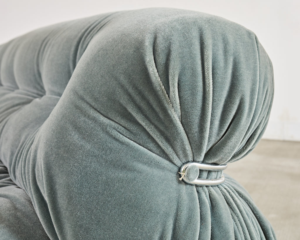 An iconic labeled Italian modern "Soriana" sofa, made by Cassina and designed by Afra and Tobia Scarpa. The 20th century sofa features the iconic "soft-architecture" construction, consisting of a large plush mohair cushion cinched and cradled by exposed chrome-plated steel clamps, creating a dramatic and luxurious silhouette. The continuous rods and loops give the sofa the effect as if it's been belted in place. The sofa rests on low round wood feet, giving a subtle floating effect. The upholstery is finished in an opulent blue/green teal mohair with a rich light-catching nap. The low, generous cushioning and broad, rounded arms create a dramatic statement piece, blending Modern, Mid-Century, and European Postmodern styles. The sofa is in exceptional well preserved condition as seen in photos. Original Cassina Made in Italy tag underneath. From an estate in San Francisco, CA.