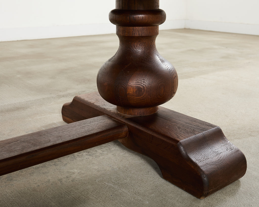 Imposing country French provincial farmhouse table made on a grand scale. The table features a massive 4 inch thick solid oak top supported by a trestle base. The trestle has impressive turned legs with a large bulbous form. The legs are conjoined by a long stretcher and end with wide shoe feet. The oak has a deep walnut or chestnut finish having a rich matte sheen that showcases the woodgrains. The table has ample legroom measuring 24 inches from the floor to the bottom. The table is very heavy and solid with excellent joinery and craftsmanship. The table has a distinctive profile and minimalist design in the farmhouse aesthetic. The top measures 7.5 feet long. Erin Lane Estate specializes in large European farm tables with over 100 in stock ready to ship from our warehouse in California.
