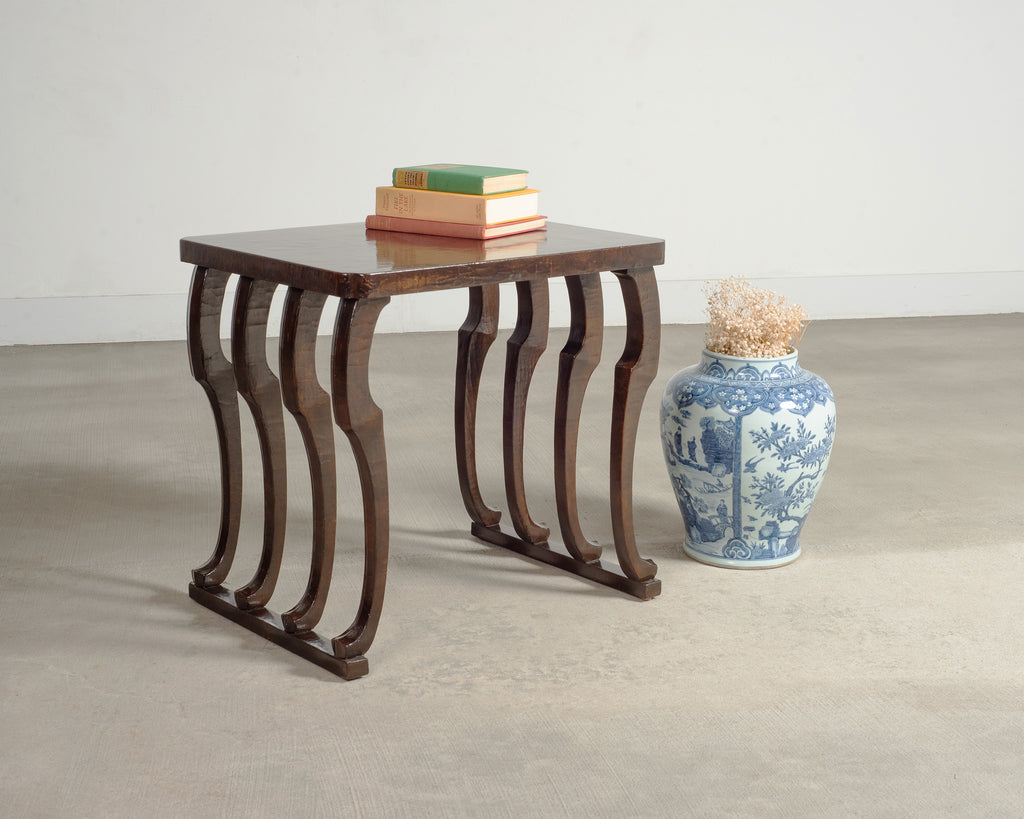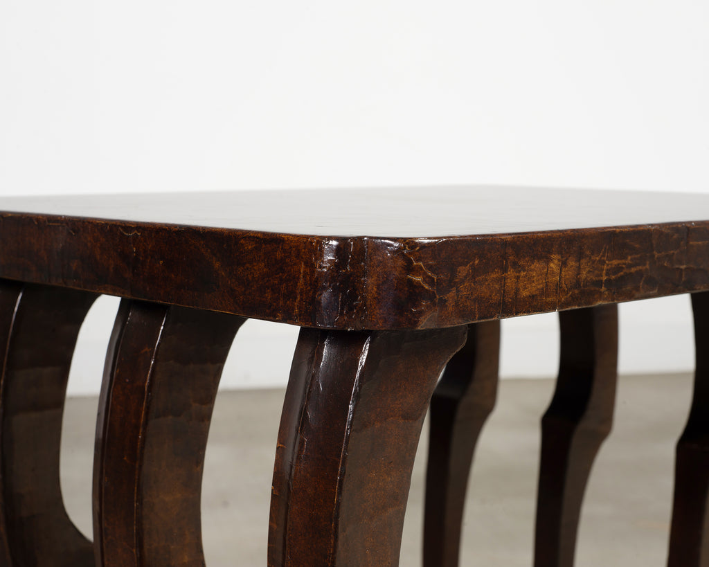 Fantastic 20th century lacquered side or console table attributed to John Dickinson for the illustrious design firm Randolph and Hein, San Francisco, California. The rare table features a zoomorphic 8 leg design supporting a thick rectangular top. Crafted from wood with an intentionally distressed patina having a craquelure or alligatored finish over the rich, dark woodgrains. Each leg ends with a hoof inspired foot as they are all conjoined on each side with a stretcher base. The thick top has shaped or clipped corners and a thick craquelure lacquer finish. The table is sturdy and solid with excellent joinery and craftsmanship. The table is unsigned purported to be designed by John Dickinson for a grand mansion in San Francisco, California.