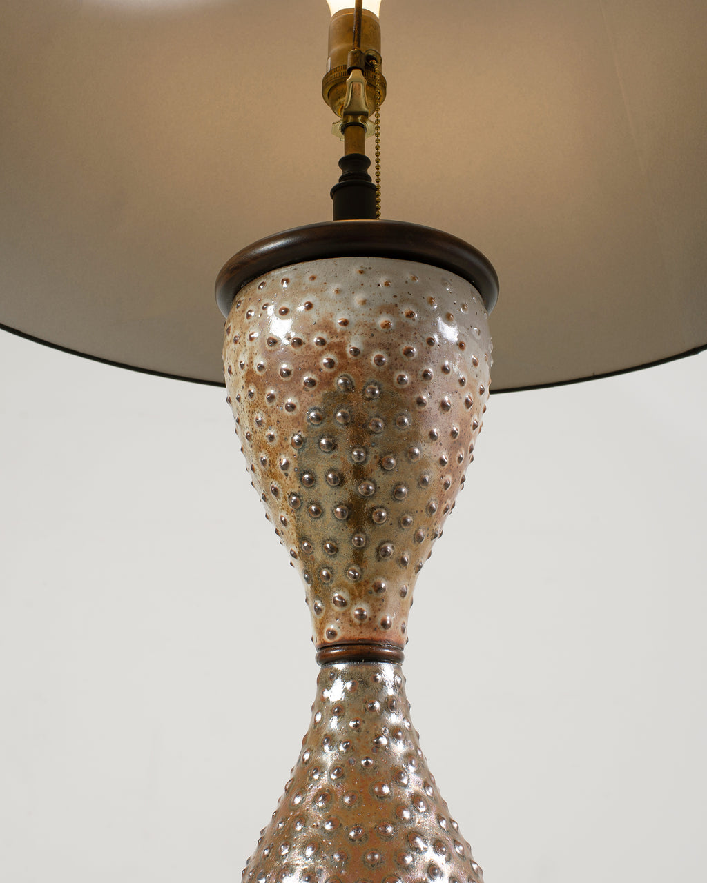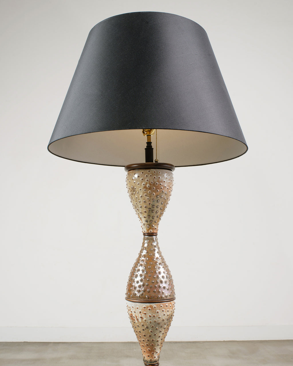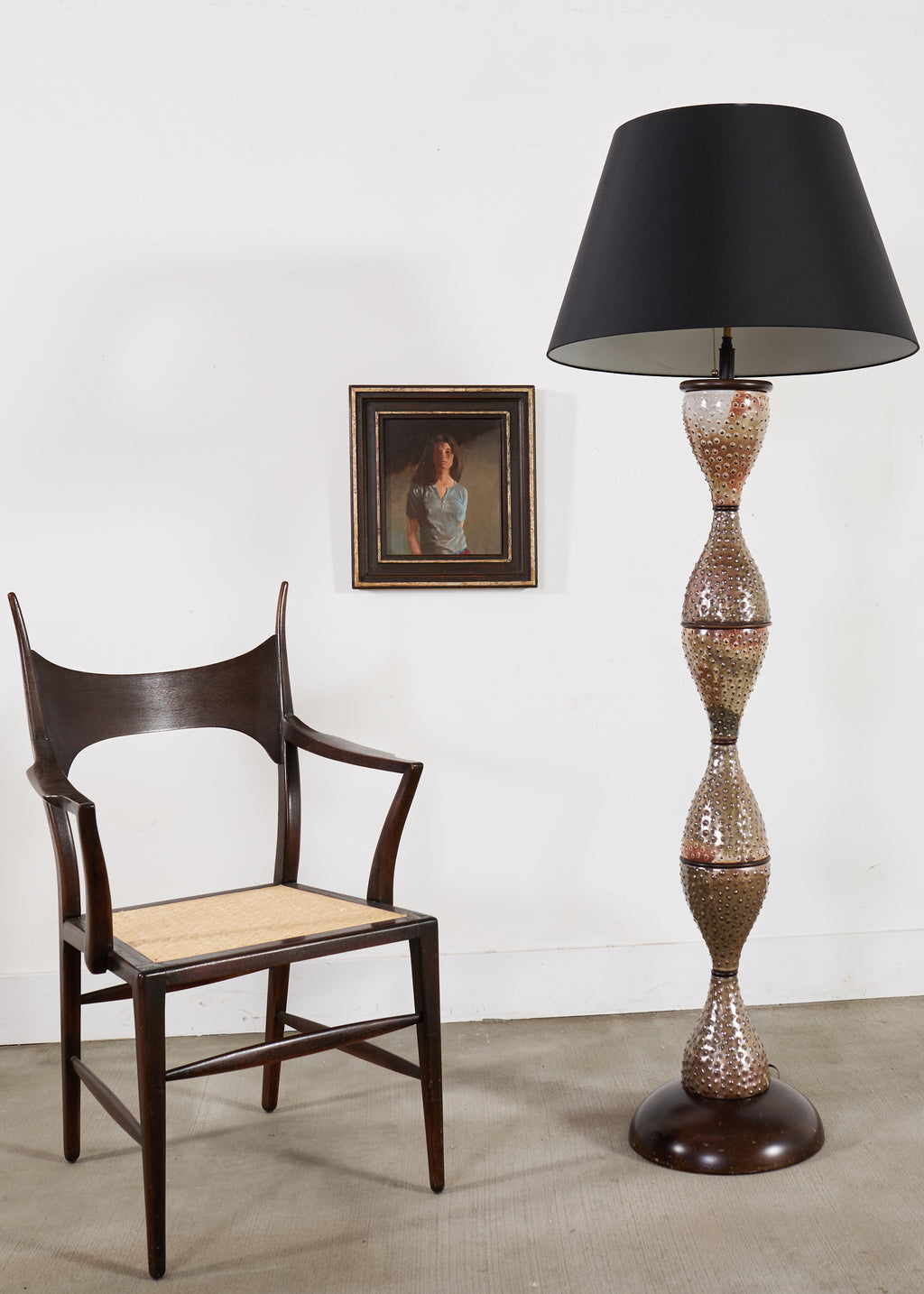 Fantastic mid-century Scandinavian modern pottery floor lamp made in the manner and style of Mobach, Netherlands. The lamp features an impressive tall, bulbous column having a rich, glazed finish in earth tone shades with a hobnail texture. The column is made from stacked gourd like sections mounted to a round walnut plinth. The lamp is topped with a large contemporary black barrel shade measuring 24.5 inches in diameter. The lamp measures 13 inches wide without the shade. The floor lamp is from a Samantha Todhunter design installation in an important 1916 Julia Morgan designed mansion located in Presidio Heights, San Francisco, CA.