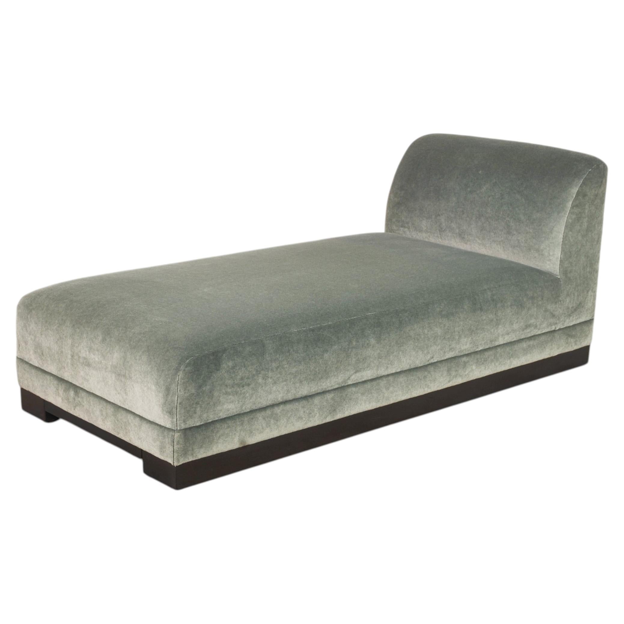 A stylish low-slung chaise loungue or daybed upholstered in an elegant sage green mohair fabric. The fabric is plush and soft with an opulent texture that dances with the light in a subtle shimmer. The design consists of a generously proportioned seat with rounded corners and a full-width rounded backrest at one end. The longue is grounded by a tailored, ebonized plinth platform with block feet to give the piece a subtle floating effect. The bespoke daybed is clad in a sophisticated seafoam blue/green mohair with minimal seams. The frames have rounded corners, giving a textural and minimalist finish that is fitted like a fine Italian suit. The design and materials evoke an Art Deco aesthetic executed in a minimalist modern design, making the piece well suited to variety of interiors. The chaise is sturdy and solid having excellent joinery and craftsmanship in exceptional condition. From an estate in San Francisco, CA.