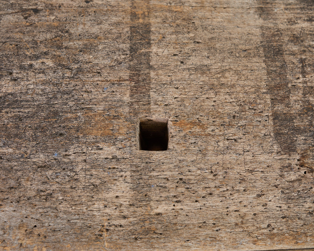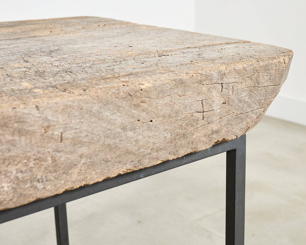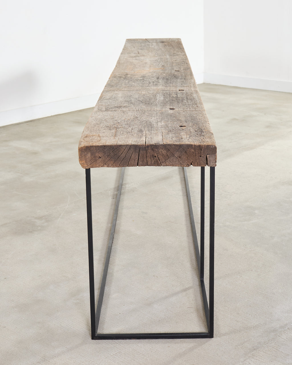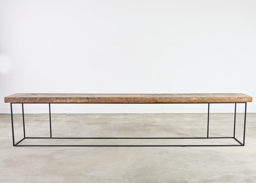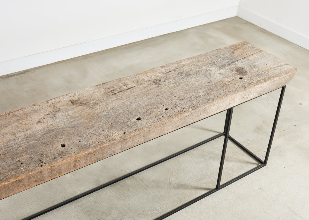 A striking and architectural console table composed around a single monolithic reclaimed timber top made on a monumental scale measuring over 13.5 feet long. The massive slab plank top retains authentic age and wear, including oxidized grain, tool marks, bench dog peg holes, scattered fastener points, and a sequence of shaped apertures consistent with a workshop utility carpenters bench or etabli table. The timber’s substantial thickness and expressive patina with natural checking and age splits provide a sculptural presence with material honesty. The top measures 4.25 inches thick, and is supported by a crisp, minimalist welded iron base having a darkened patinated finish. The linear frame creates a strong negative-space effect while the uprights firmly uphold the long plank. The piece balances industrial, modern, farmhouse, rustic, and wabi-sabi influences. Equally suited to use behind a sofa, in an entry, or as a dramatic corridor display console. The piece is very heavy and solid with an impressive profile and presence.