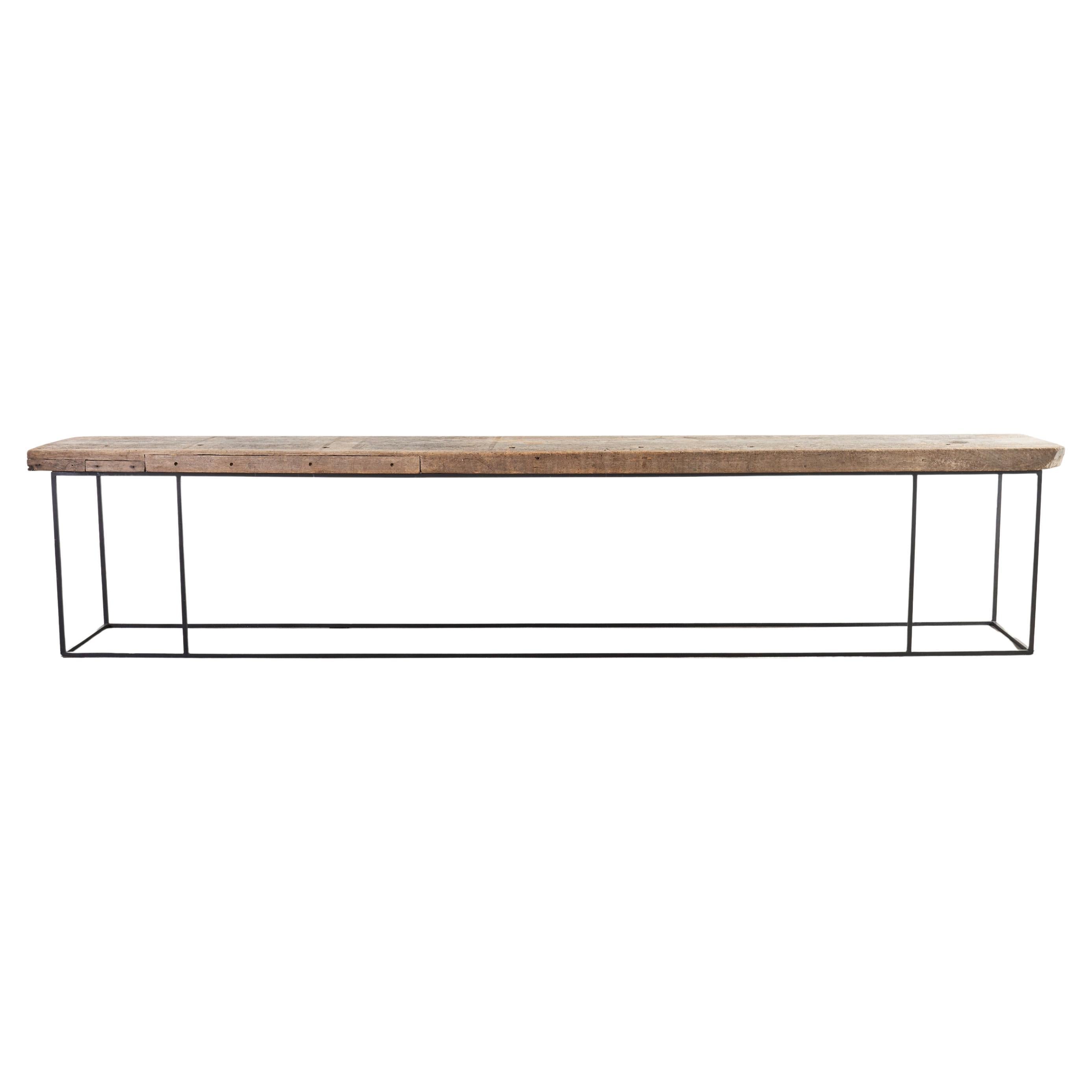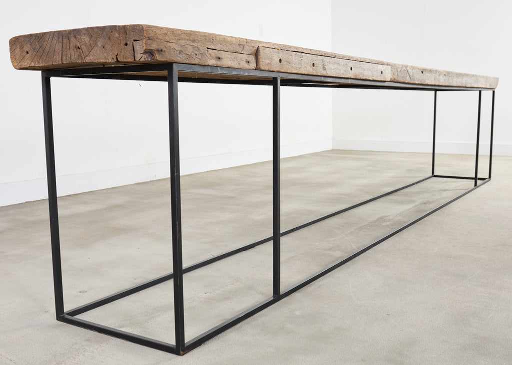 Monumental Reclaimed Wood Plank Top Iron Console 13.5 Ft