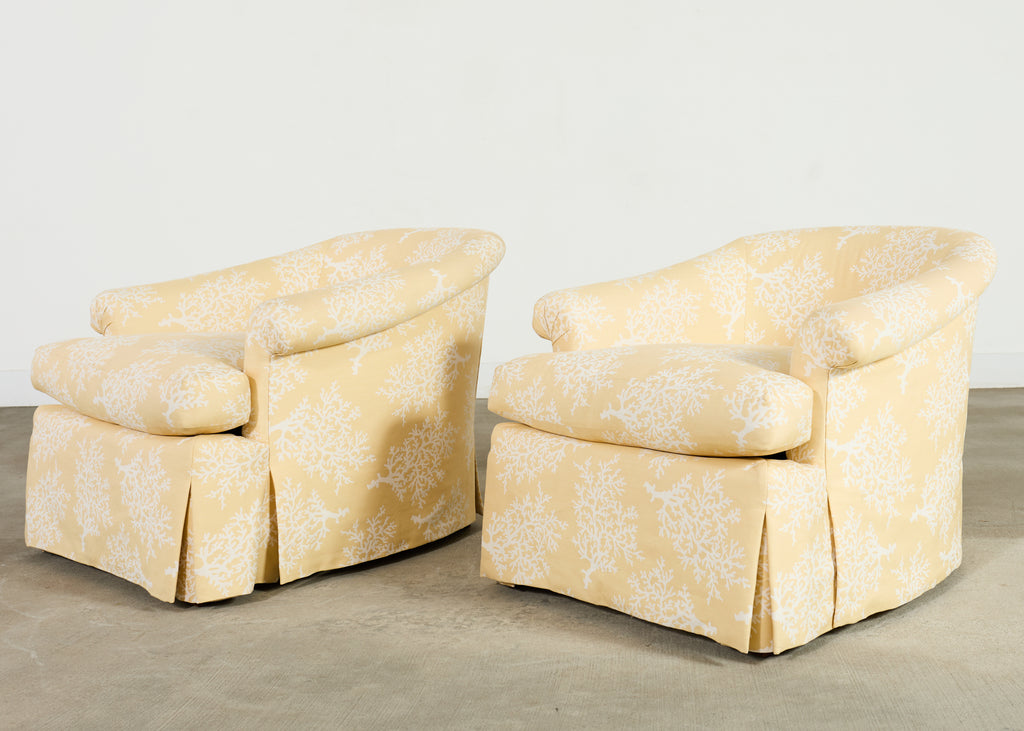 A charming pair of 20th century bespoke skirted club chairs attributed to A. Rudin San Francisco, CA. Each club chair features a low barrel-back profile with integrated arms, a thick loose fitted seat cushion, and a matching loose back pillow (A. Rudin model No. 567). The upholstery is done in a butter-yellow shade with a white coral branch motif pattern in a French textured jacquard fabric, finished with a tailored skirt around the chair having tidy corner pleats. The chairs offer an elevated and tailored California Coastal or Palm Beach Regency style look, suitable for a variety of interiors. The chairs are sturdy and solid having excellent joinery and craftsmanship in exceptional condition as seen in photos. Sold as a pair. Provenance: from the San Francisco estate of late California Senator Dianne Feinstein (1933-2023).