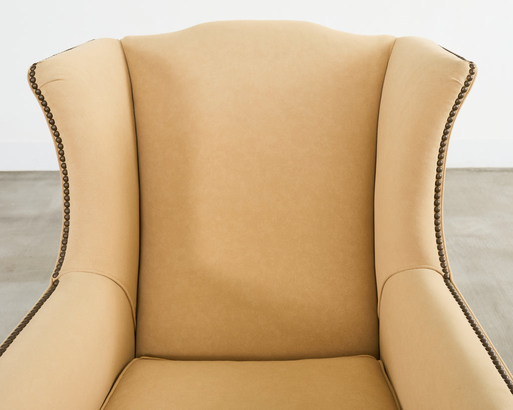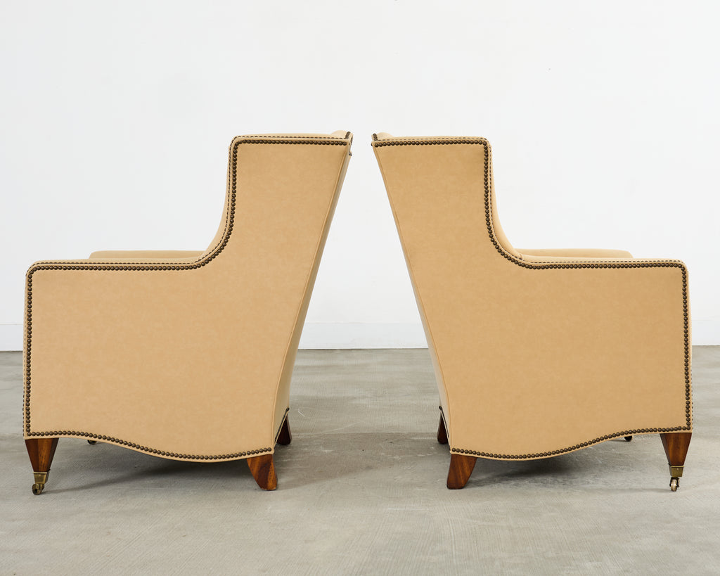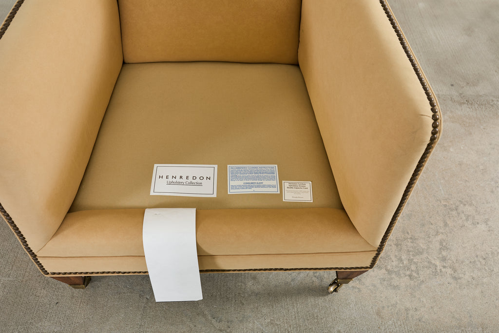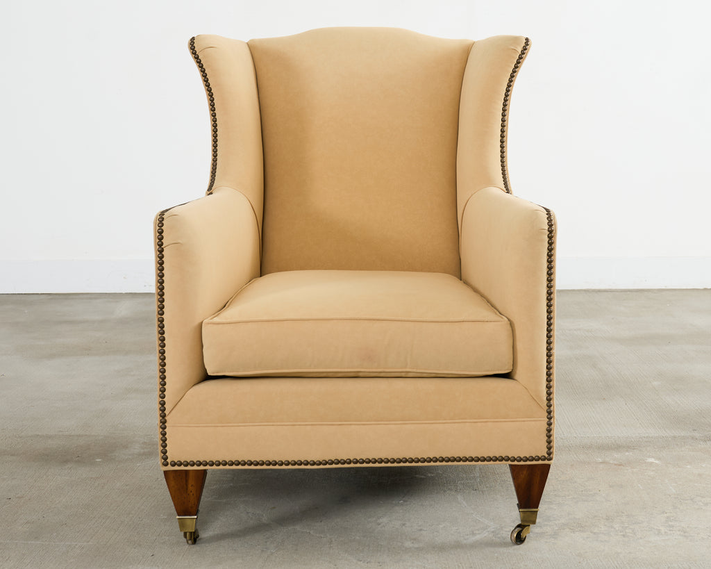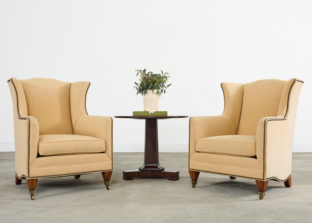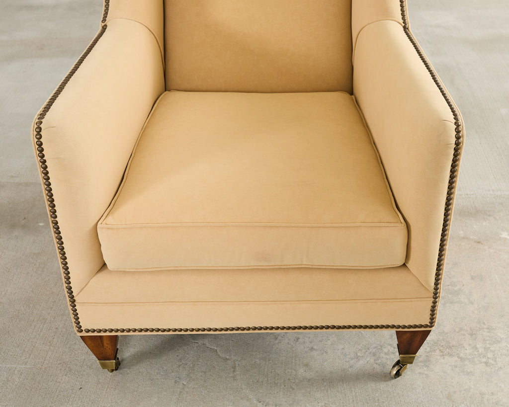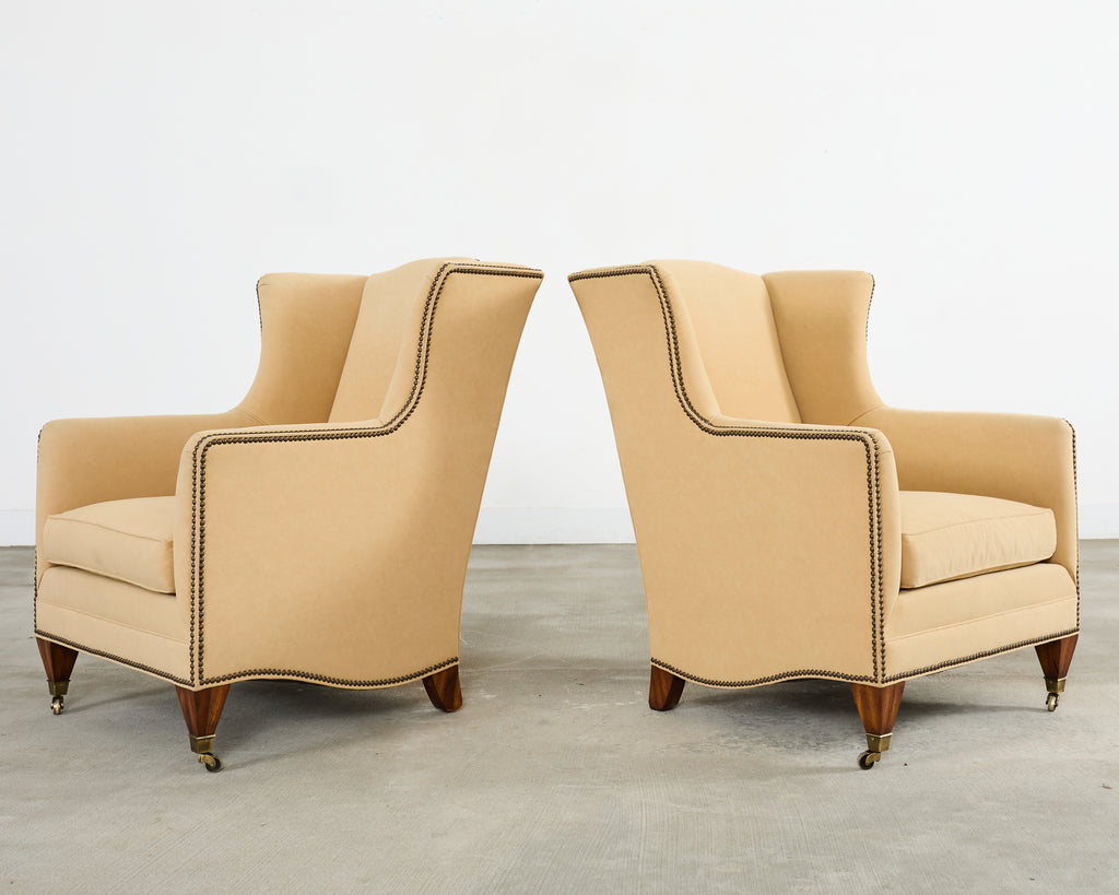An exceptional pair of bespoke wingback club armchairs from Henredon's Upholstery Collection. The chairs feature towering wingback silhouettes with gracefully curved wings that extend from the high back down to scrolled arms, creating an architectural presence. The chairs are upholstered in a neutral light camel or butter colored fabric blend having a luxurious soft faux-suede or microfiber texture. Meticulous detailing includes hand-applied antiqued brass nailhead trim that follows the outer wings and arms to the seat rail. The exposed woodwork is executed in a rich mahogany hardwood, featuring elegantly tapered front legs terminating in patinated brass sabot casters. The seating is well-proportioned with generous cushioning and a thick boxed seat cushion. Each chair retains its original Henredon tags affixed to the underside, along with care instructions. Arms measure 25.5 inches high. The chairs are in exceptional condition having excellent joinery and craftsmanship. From an estate in Beverly Hills, CA.