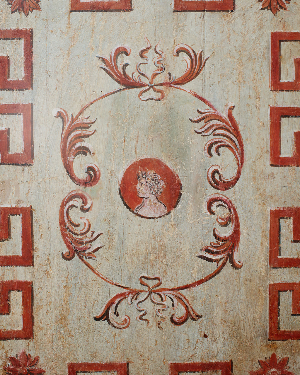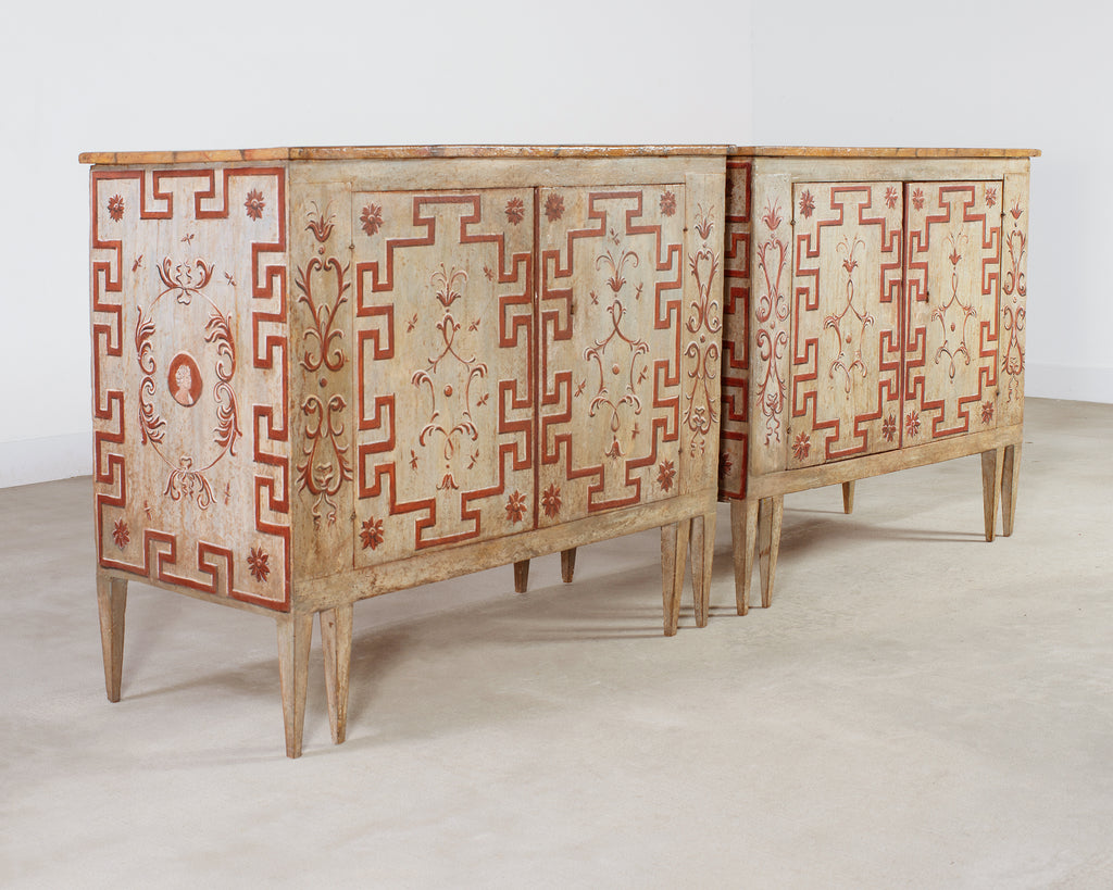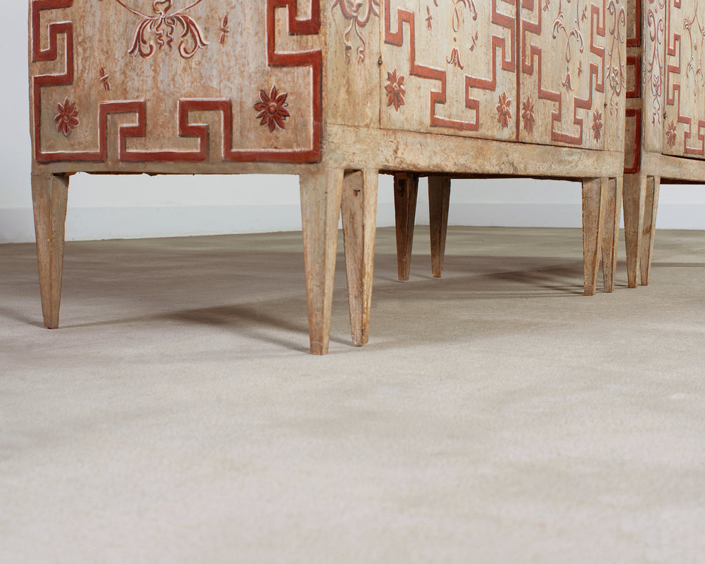 Spectacular pair of large 19th century Italian painted cabinets or chests painted in the Florentine Venetian style with bold neoclassical Greek key motifs. Each case has a faux-marble trompe l'oeil style painted top panel. The chests are each fronted by two large locking doors. The cases are decorated with scrolling floral and foliate swag ornamentation having rosettes and cameo medallions on the sides. The red brick tones are vibrant and stand out over an aged lacquer ivory parchment toned ground. The paint has an aged, distressed, and weathered patina having a faded finish with small losses commensurate age and use. The cases are supported by elegant, tapered legs on each corner and pairs in the front. Each commode has the original lock plates and keys available. The cases are heavy and solid constructed from thick planks of wood with a beautifully distressed patina. Sold as a pair from an estate in Bel Air, California.