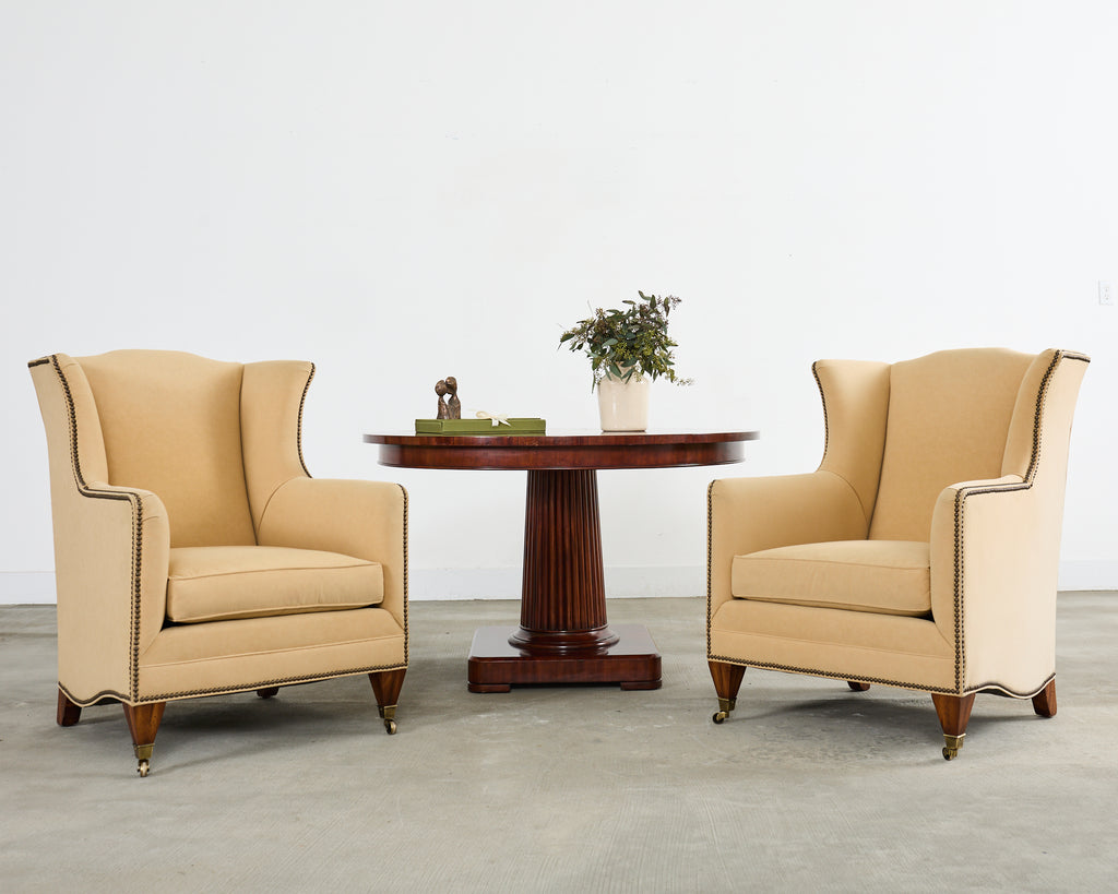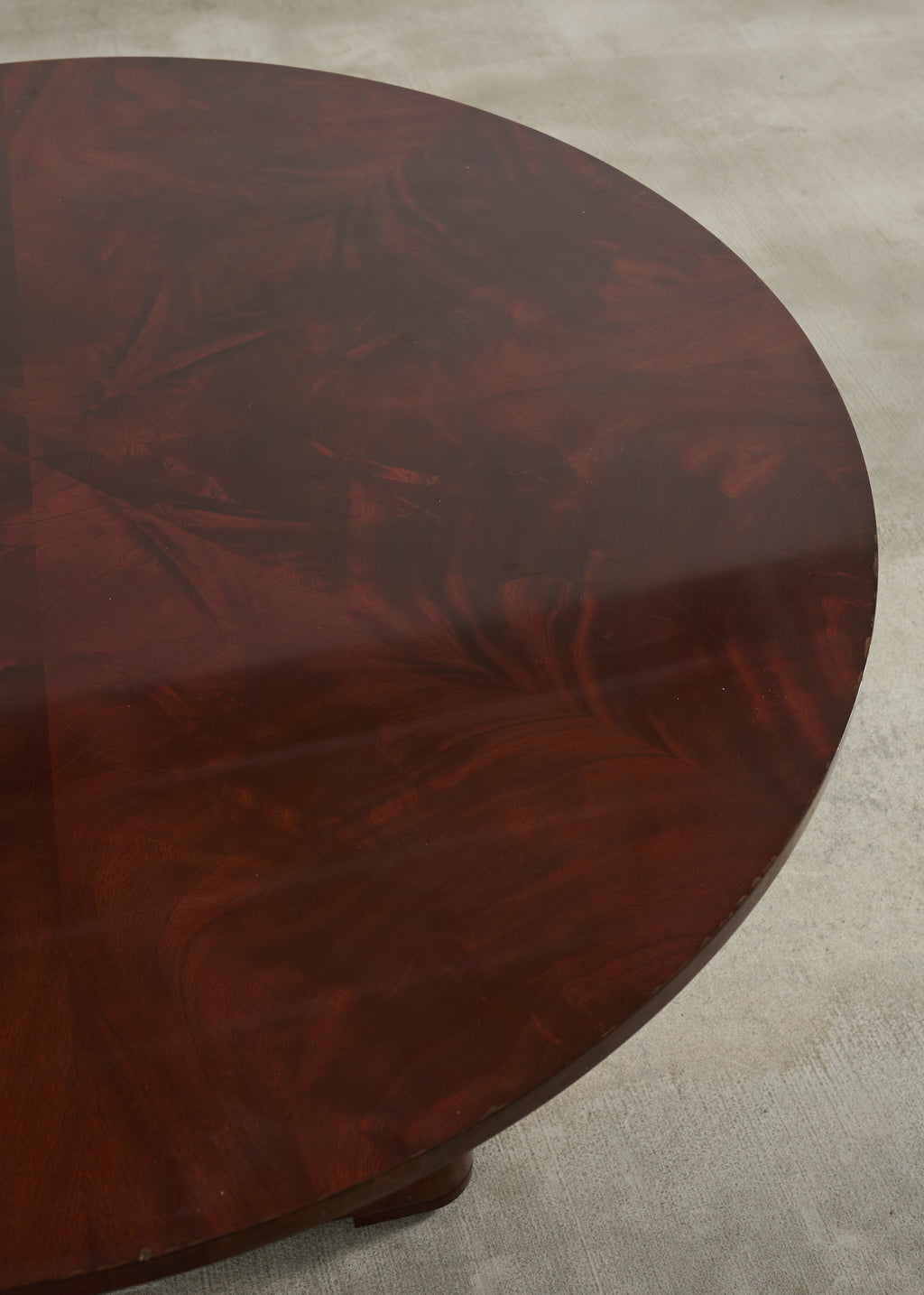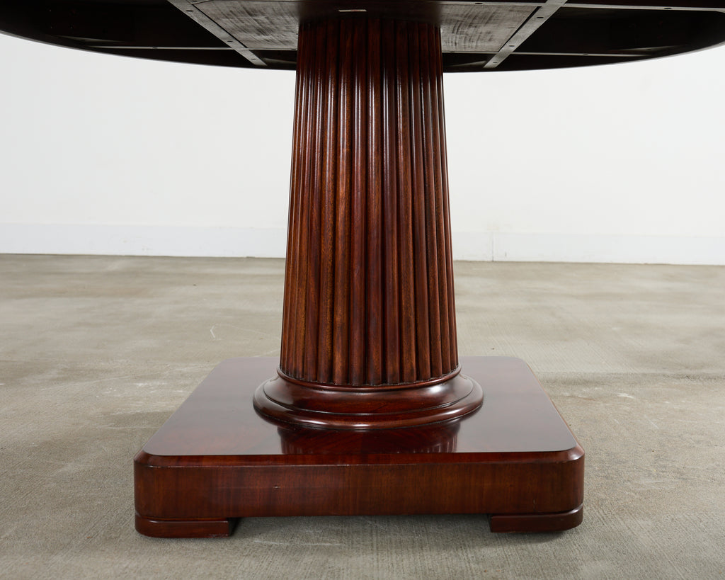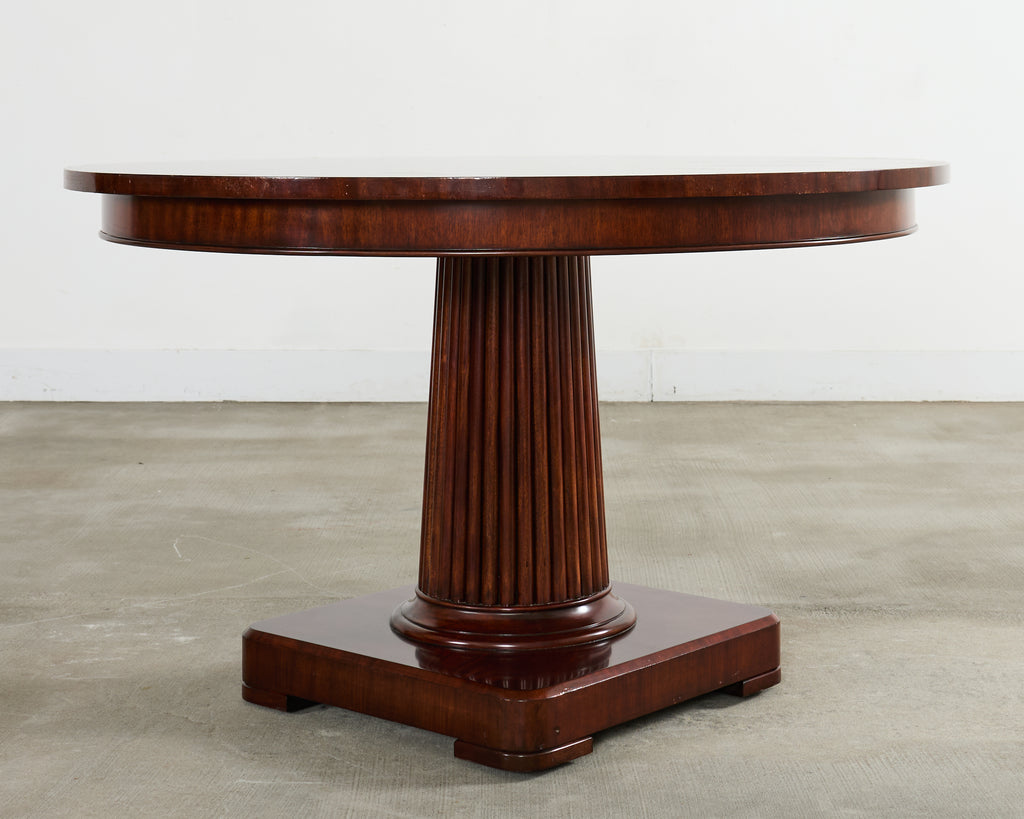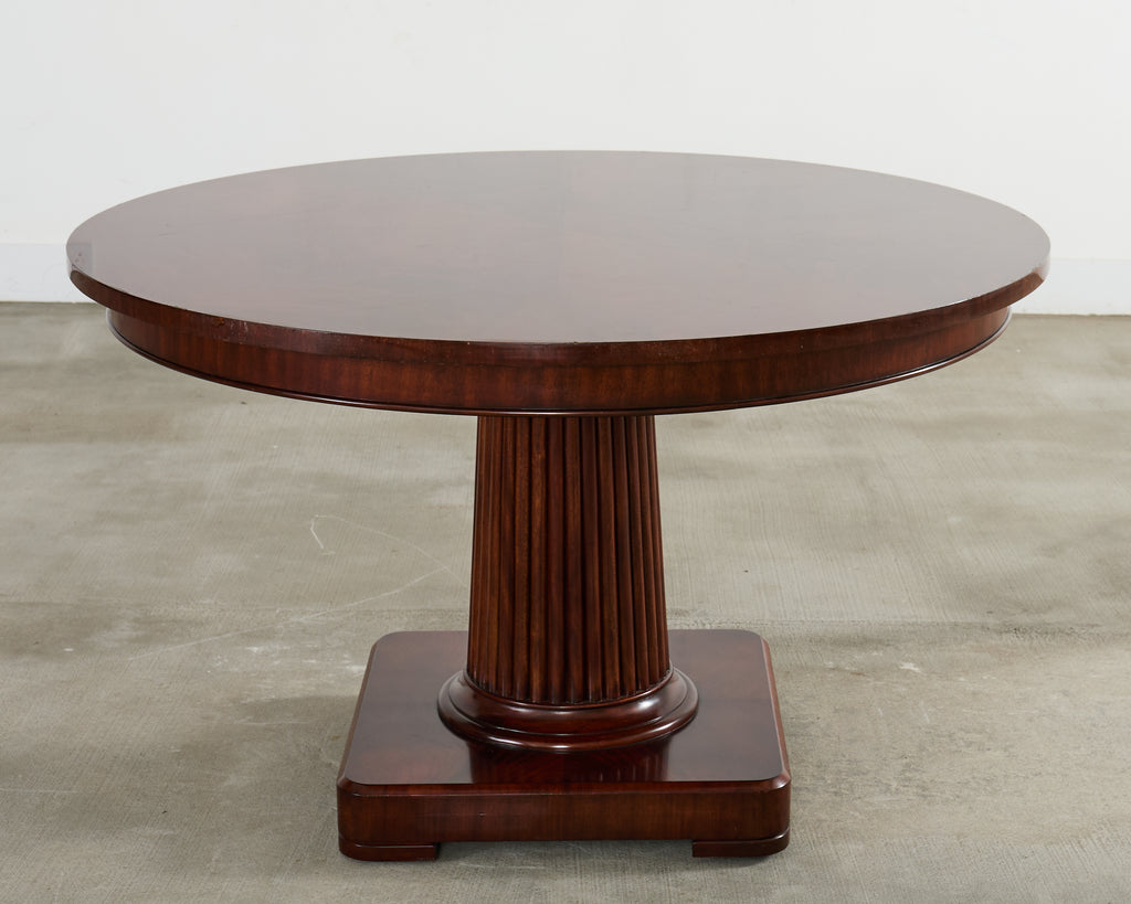 A refined "Mayfield Center Table" by Ralph Lauren features a substantial circular top finished in a radiant book matched mahogany veneer. The table is produced in Italy by artisans and finished in the U.S. by Theodore Alexander for Ralph Lauren. The top is crafted from eight mahogany panels with a rich swirled grain presented in a deep tobacco-to-chestnut brown finish with warm red undertones. The top rests on a tapered, vertically fluted Greco-Roman style column with a molded collar, anchored by a square plinth base with soft corners ending with block feet. The fluted column and plinth base create a classical architectural silhouette taking inspiration from Regency, Neoclassical, and Empire styles. Designed as part of Ralph Lauren's 'Mayfield' Collection, inspired by Mediterranean design with Hollywood influence. The table is sturdy and solid in exceptional condition as seen in photos. Each table is bench made with the highest level of craftsmanship. The original MSRP was $15,290. The original order tags are on the bottom of the table. Could also serve as a dining table with a comfortable dining height of 30 inches high and ample leg room.