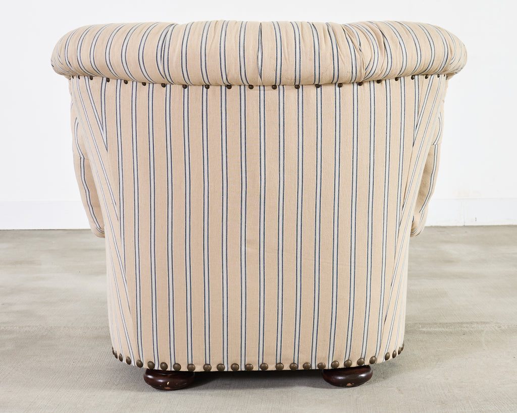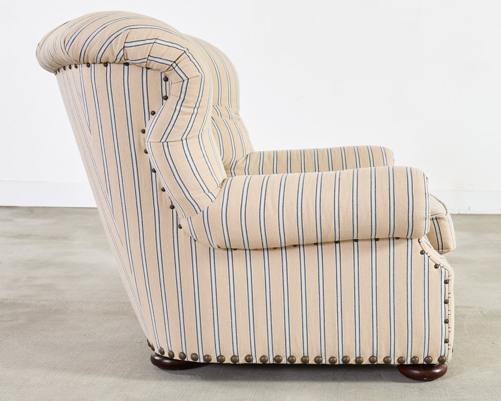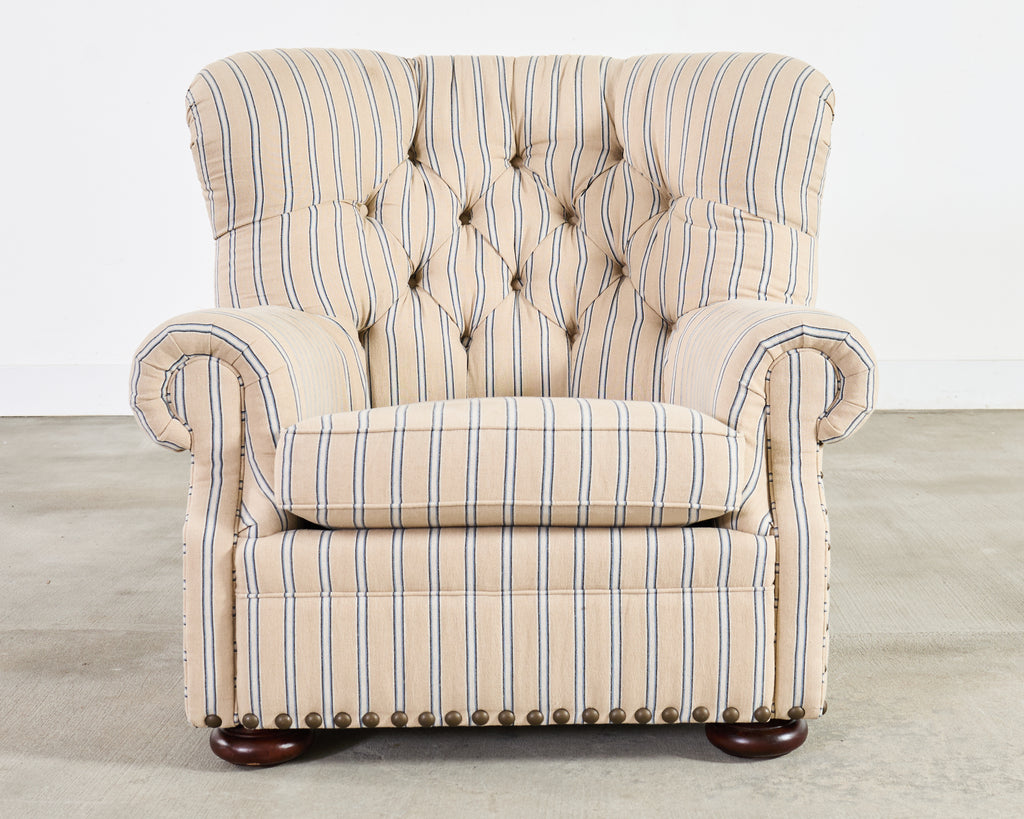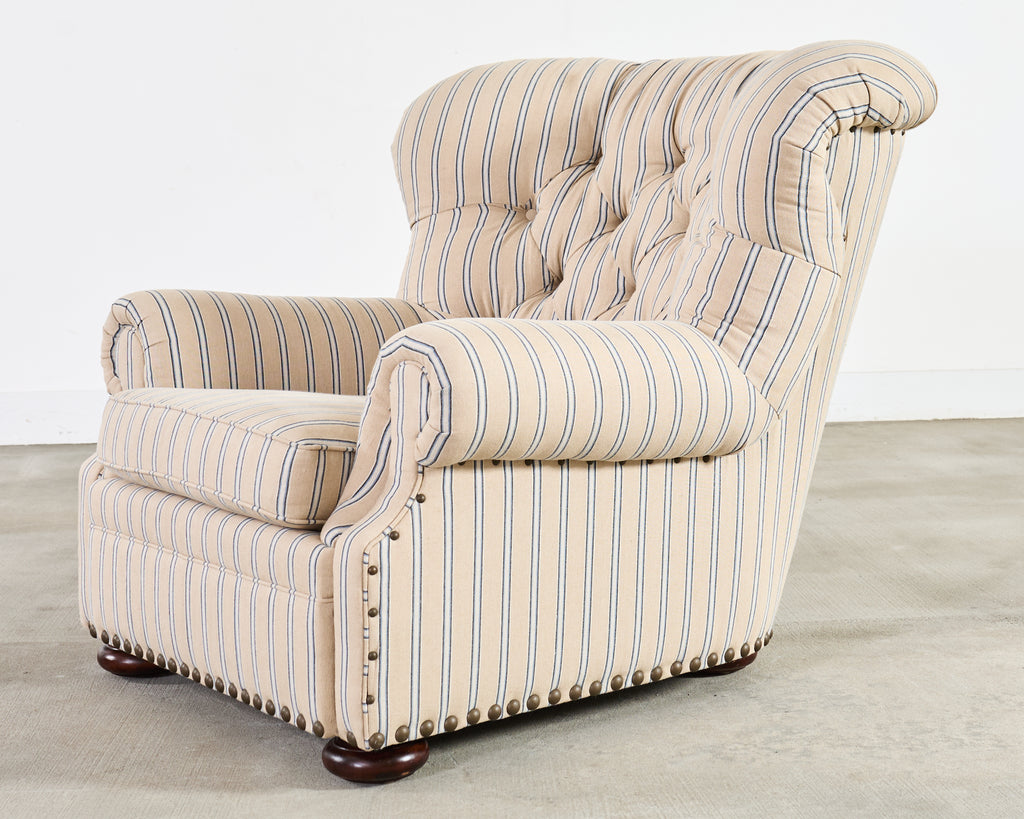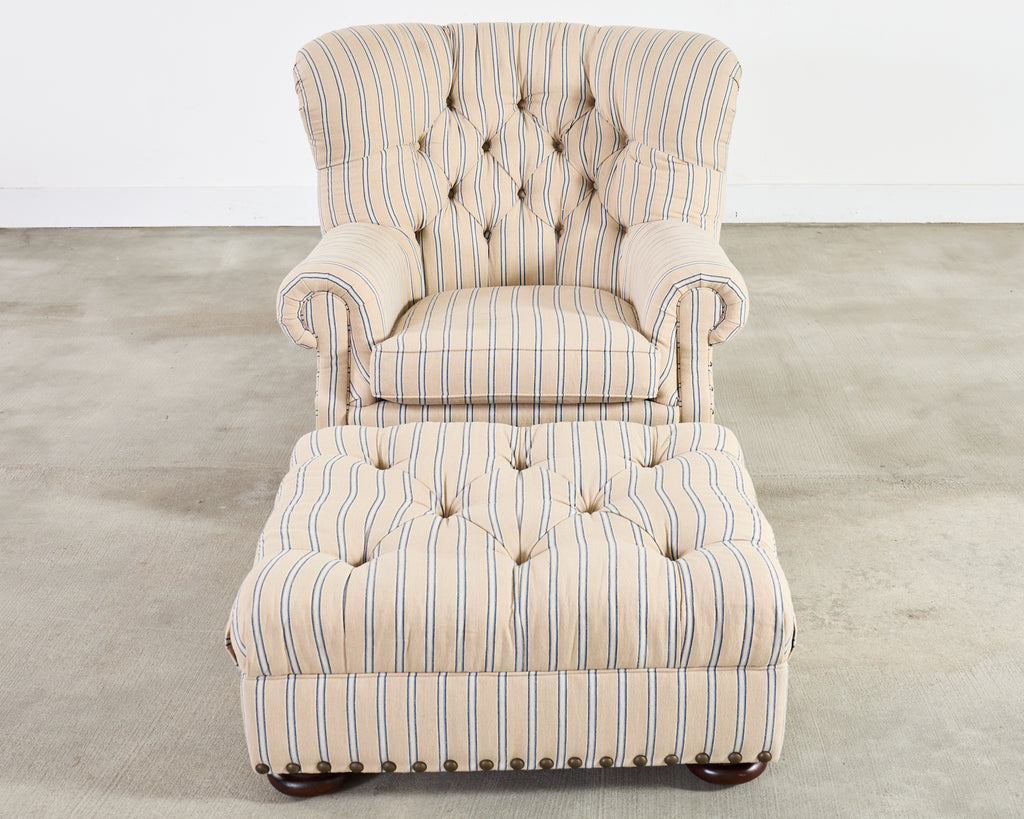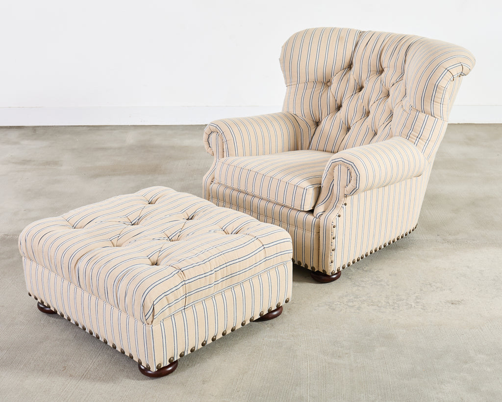 A handsome Ralph Lauren Home Writer’s Chair and matching oversized tufted writer's ottoman finished in Ralph Lauren's Amelot linen ticking stripe fabric. The Italian fabric is 100 percent linen with stylish striped cream-and-blue finish and rich texture. The chair features a hardwood frame having a tall, softly winged back, rolled arms, and deep diamond tufting. The chair also features maple wood bun feet. The frame is bordered by oversized brass tack nail-heads, along with a tight and thick spring-down cushion. The ottoman has a deep tufted top, bun feet, and a nailhead trim to match the chair. Both are finished in a matching Amelot oatmeal and denim tone with vertical stripes, giving a crisp, tailored, traditional English look. Both pieces made in Italy and finished in the U.S. by E.J. Victor, Morganton, North Carolina. The chair and ottoman were individually bench made and are in exception condition as seen in photos. Original MSRP was $8875. Sold as a pair.