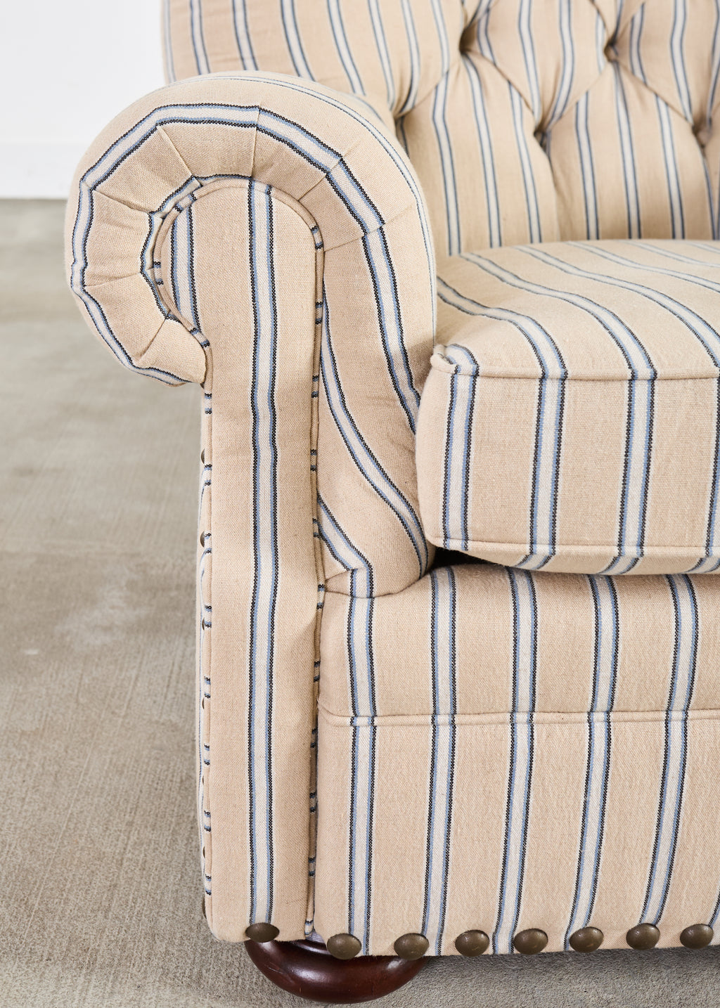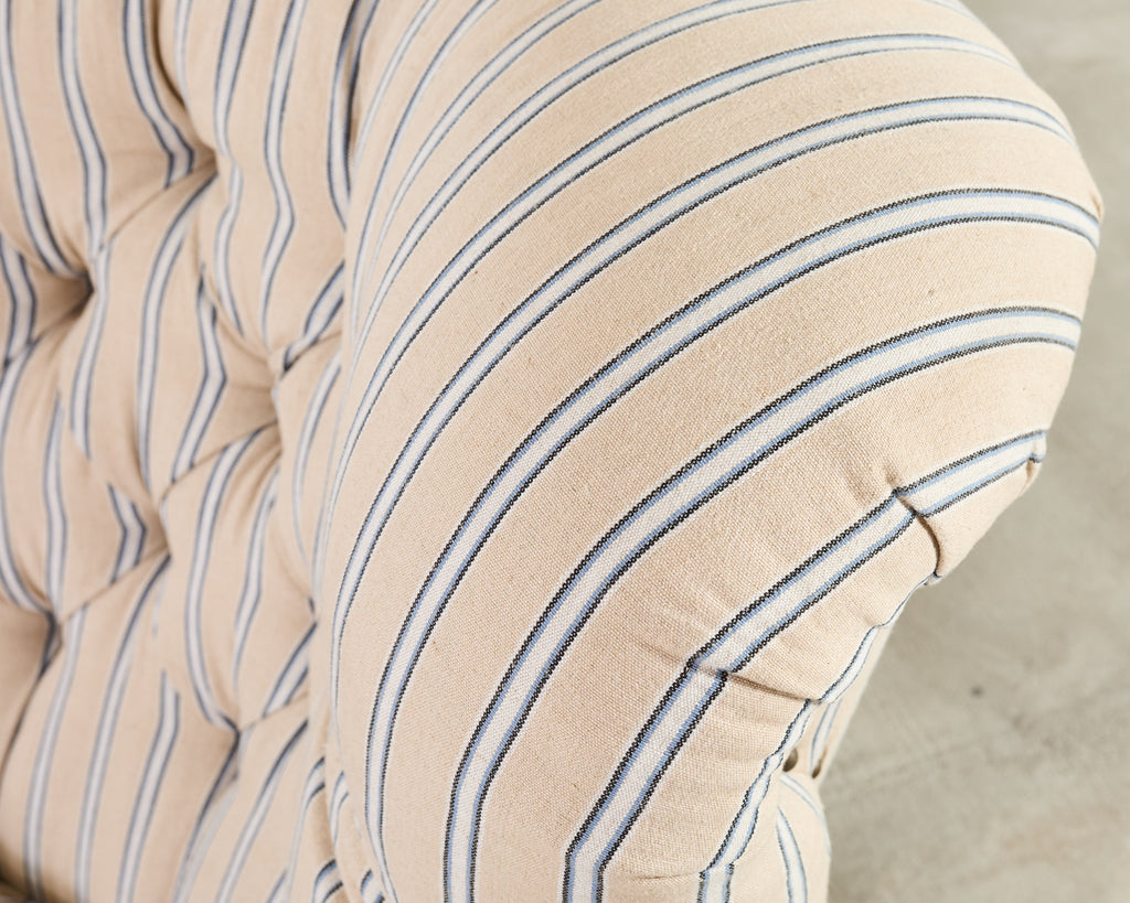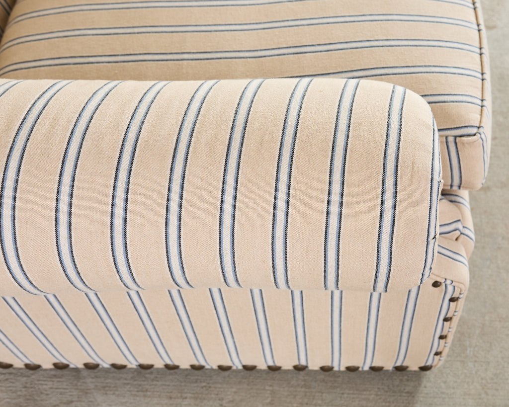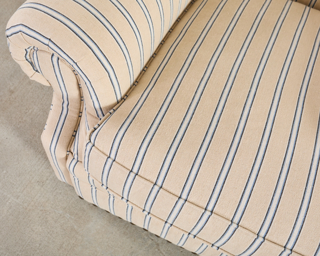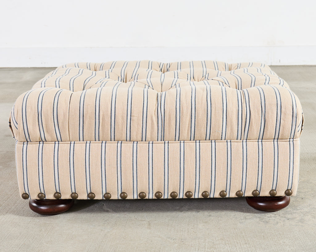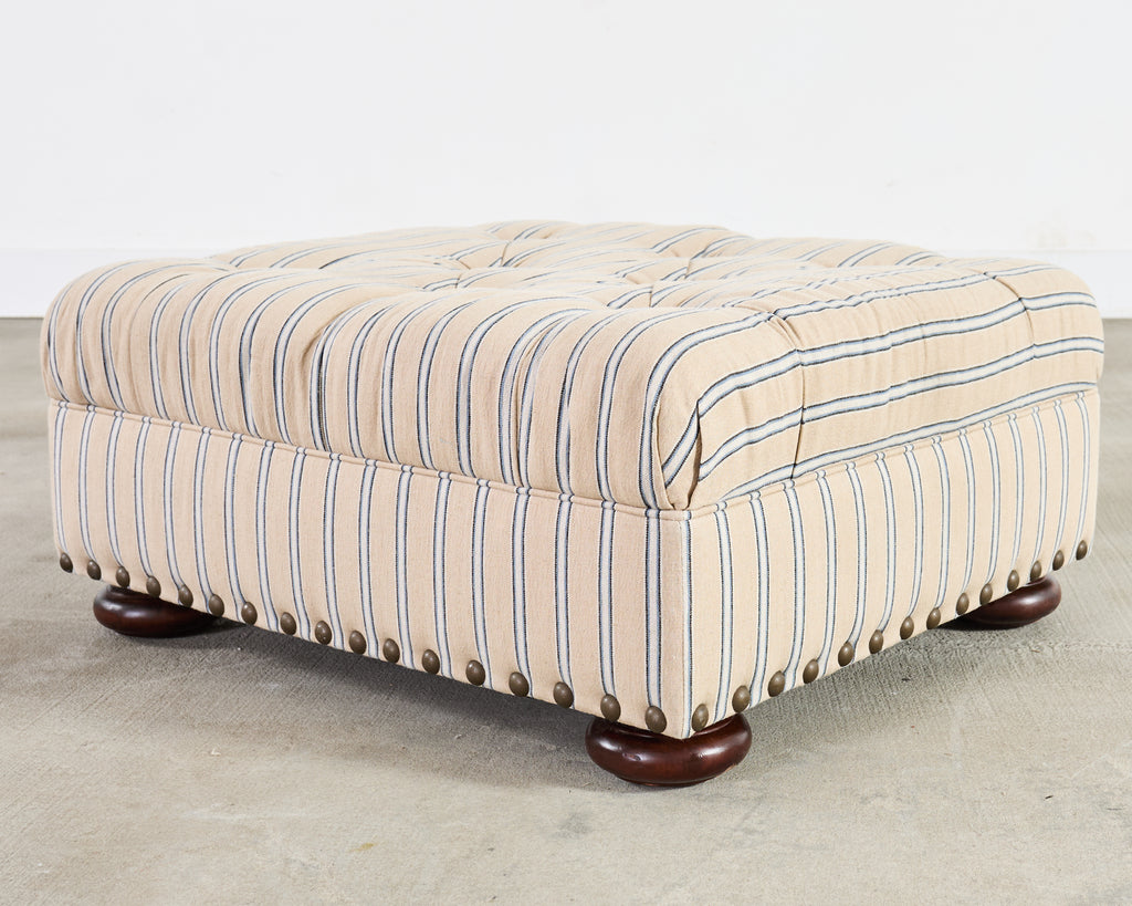 A handsome Ralph Lauren Home Writer’s Chair and matching oversized tufted writer's ottoman finished in Ralph Lauren's Amelot linen ticking stripe fabric. The Italian fabric is 100 percent linen with stylish striped cream-and-blue finish and rich texture. The chair features a hardwood frame having a tall, softly winged back, rolled arms, and deep diamond tufting. The chair also features maple wood bun feet. The frame is bordered by oversized brass tack nail-heads, along with a tight and thick spring-down cushion. The ottoman has a deep tufted top, bun feet, and a nailhead trim to match the chair. Both are finished in a matching Amelot oatmeal and denim tone with vertical stripes, giving a crisp, tailored, traditional English look. Both pieces made in Italy and finished in the U.S. by E.J. Victor, Morganton, North Carolina. The chair and ottoman were individually bench made and are in exception condition as seen in photos. Original MSRP was $8875. Sold as a pair.