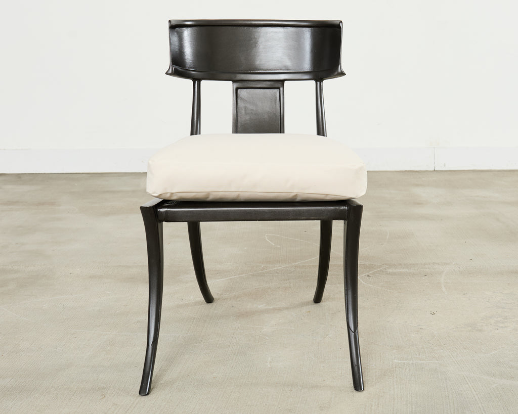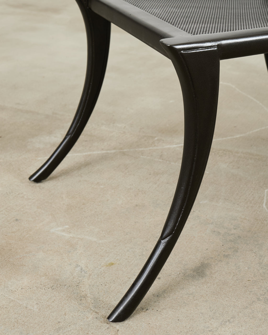 Dramatic set of four cast aluminum metal patio and garden dining chairs designed by Michael Taylor. The chairs feature an iconic neoclassical Greco-Roman klismos design with saber legs and gracefully curved tablet backs. The chairs are heavy crafted from solid cast aluminum with a later dark satin charcoal finish. The seats measure 16 inches high without seat cushions. The original cushions have been reupholstered with an all weather fabric in a light cream tone. Sold as a set of four. From an estate in Beverly Hills, California.