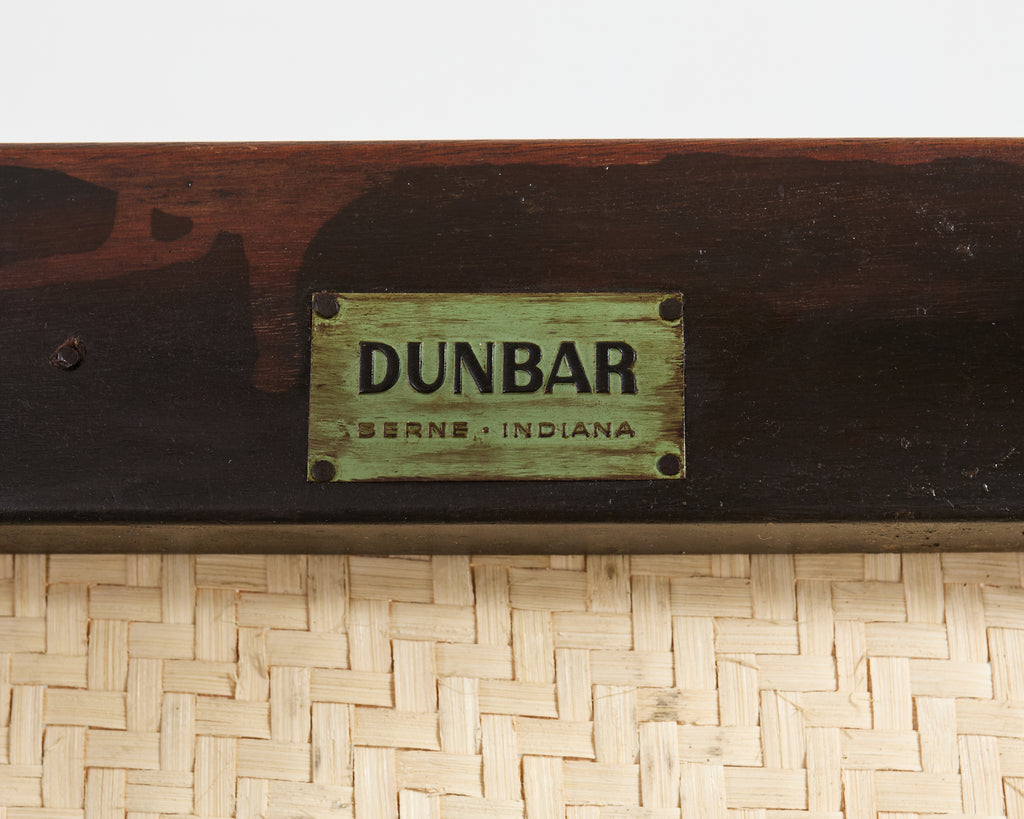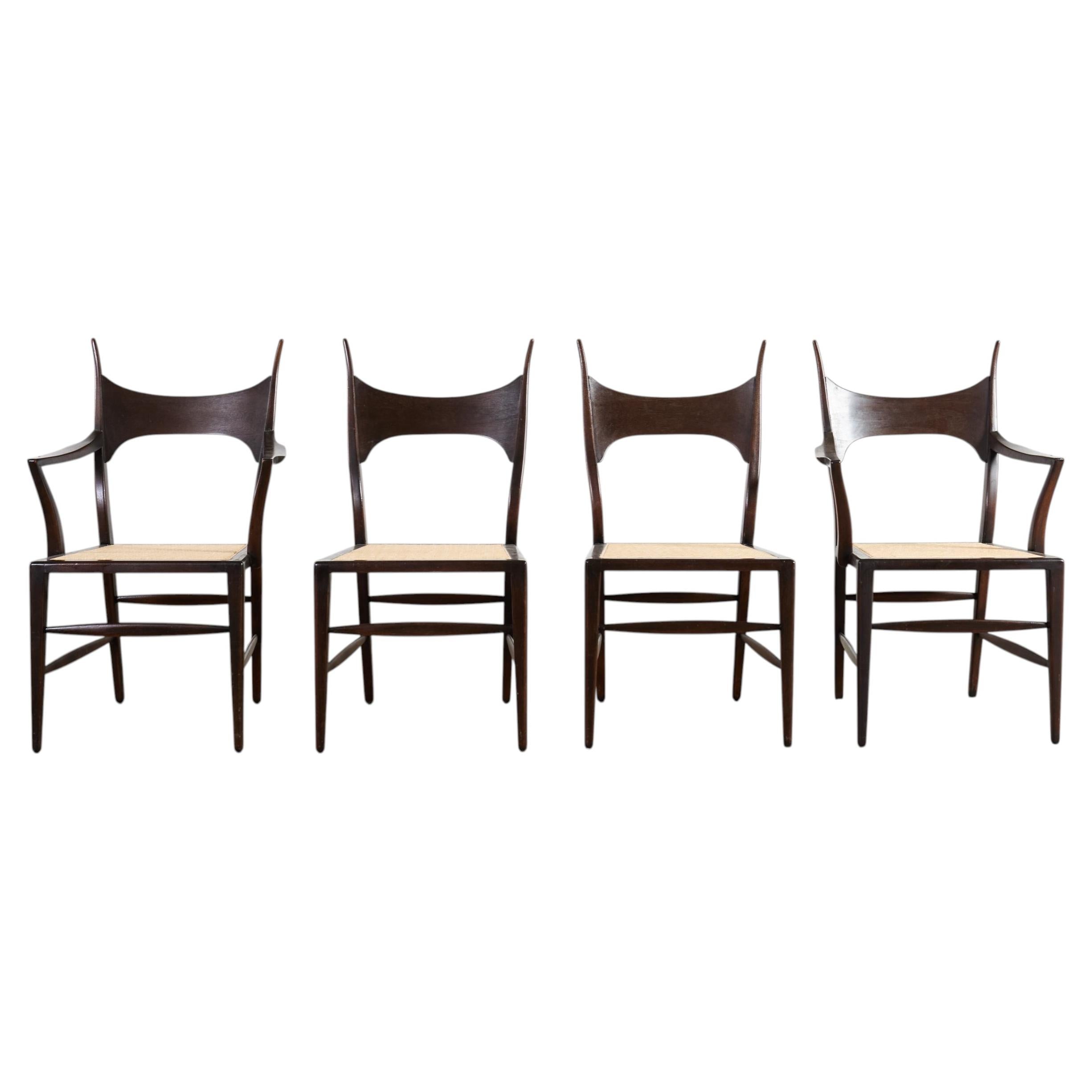 An iconic and rare set of four horned antler chairs designed by Edward Wormley for Dunbar. Known as 5580 model these dining chairs are crafted from rich mahogany with newly caned seats. The natural toned cane is woven in a chevron or herringbone geometric pattern. Arguably one of the most beautiful chair designs Wormley ever created and one of the most elusive as very few were produced. The design is distinguished by a dramatic sweeping "horned" antler crest, sculptural back rail, and elegant, slightly splayed stance. The newly re-woven cane seat panels offer a warm contrast to the dark espresso finish. The set includes two rare armchairs measuring 23" wide with 25.75" tall arms, and two side chairs, measuring 19.5" wide. 3 of the 4 chairs retain their original Dunbar metal plaques underneath. From an estate in Beverly Hills, CA. Sold as a set of four.