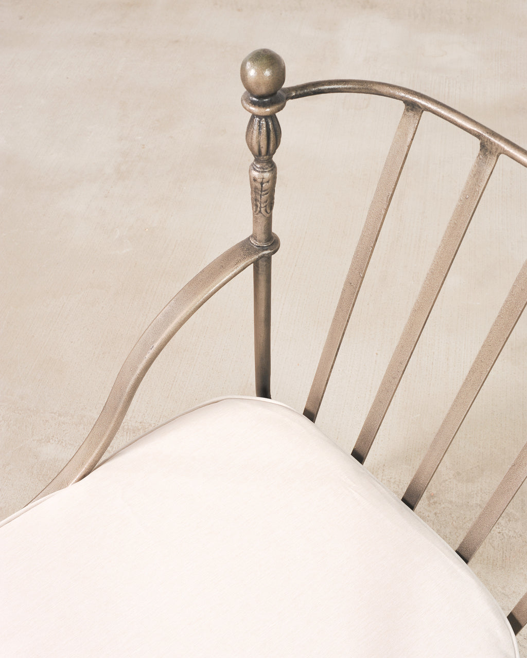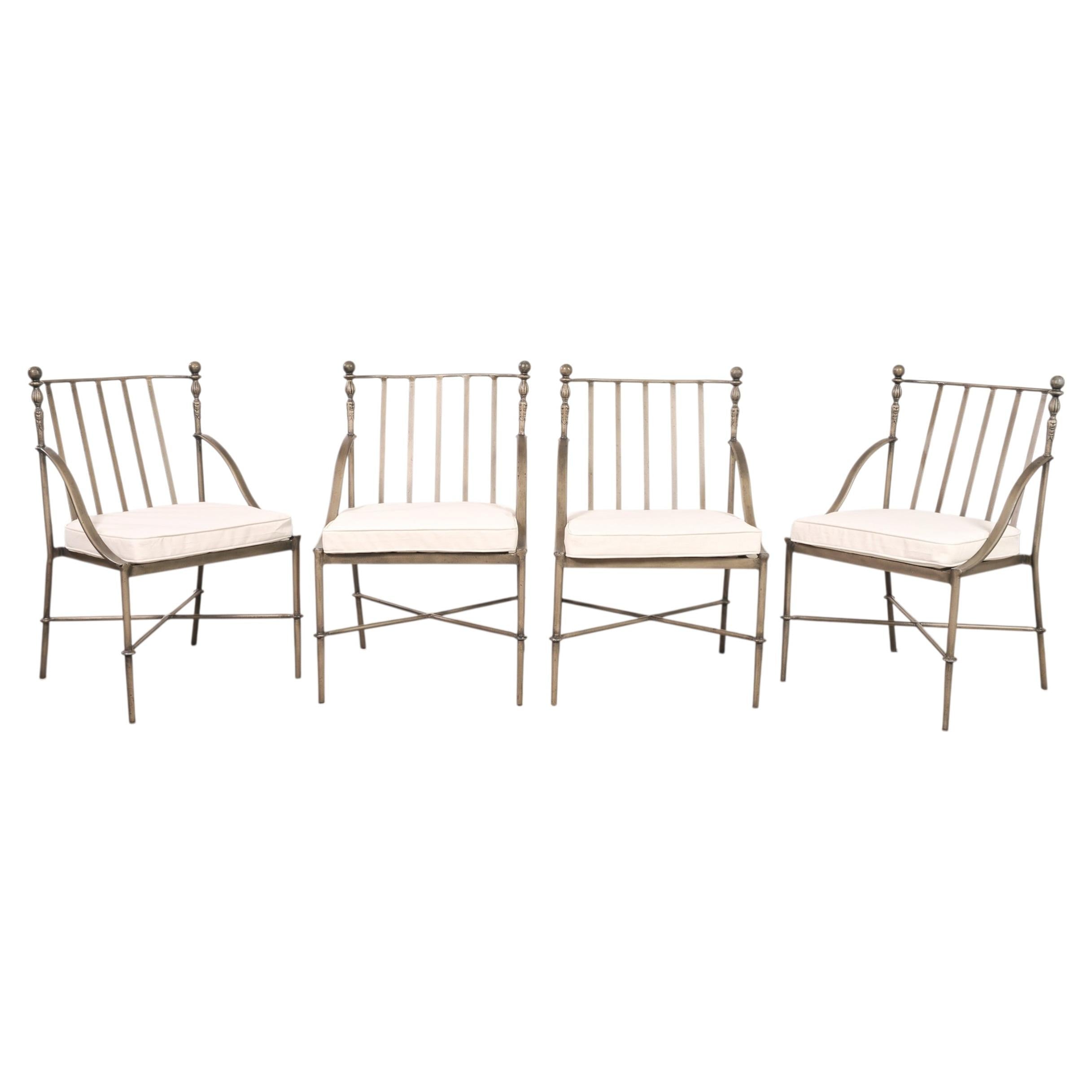 A distinctive signed set of four Michael Taylor "Montecito" dining chairs featuring an intentionally distressed powder coated nickel or pewter finish with a beautifully aged patina. The iconic chairs have smooth ball finials on the back top rail. The frames feature an airy vertical slat back with turned corner supports, decorated in the neoclassical taste. The arms have a long, sweeping design echoing the gentle curve of the back rail. The chairs rest on straight slim tapered legs conjoined with X-stretchers. The set is finished with later added loose seat cushions in a light off-white fabric. The bottoms of the seats have an open geometric lattice design. The chairs blend Neoclassical, Coastal, and California Regency styles, suitable for a variety of settings. Each chairs retain the original Michael Taylor Designs maker's plaques under the seats. the frames are sturdy and solid having excellent joinery and craftsmanship in exceptional condition. The powder coating has an optional intentionally aged patina in a rich nickel or pewter style finish as seen in photos. Sold as a set of four. From an estate in Beverly hills, CA.