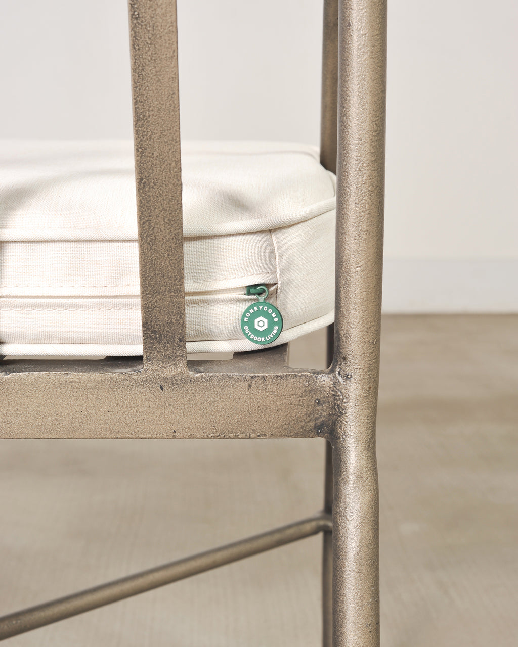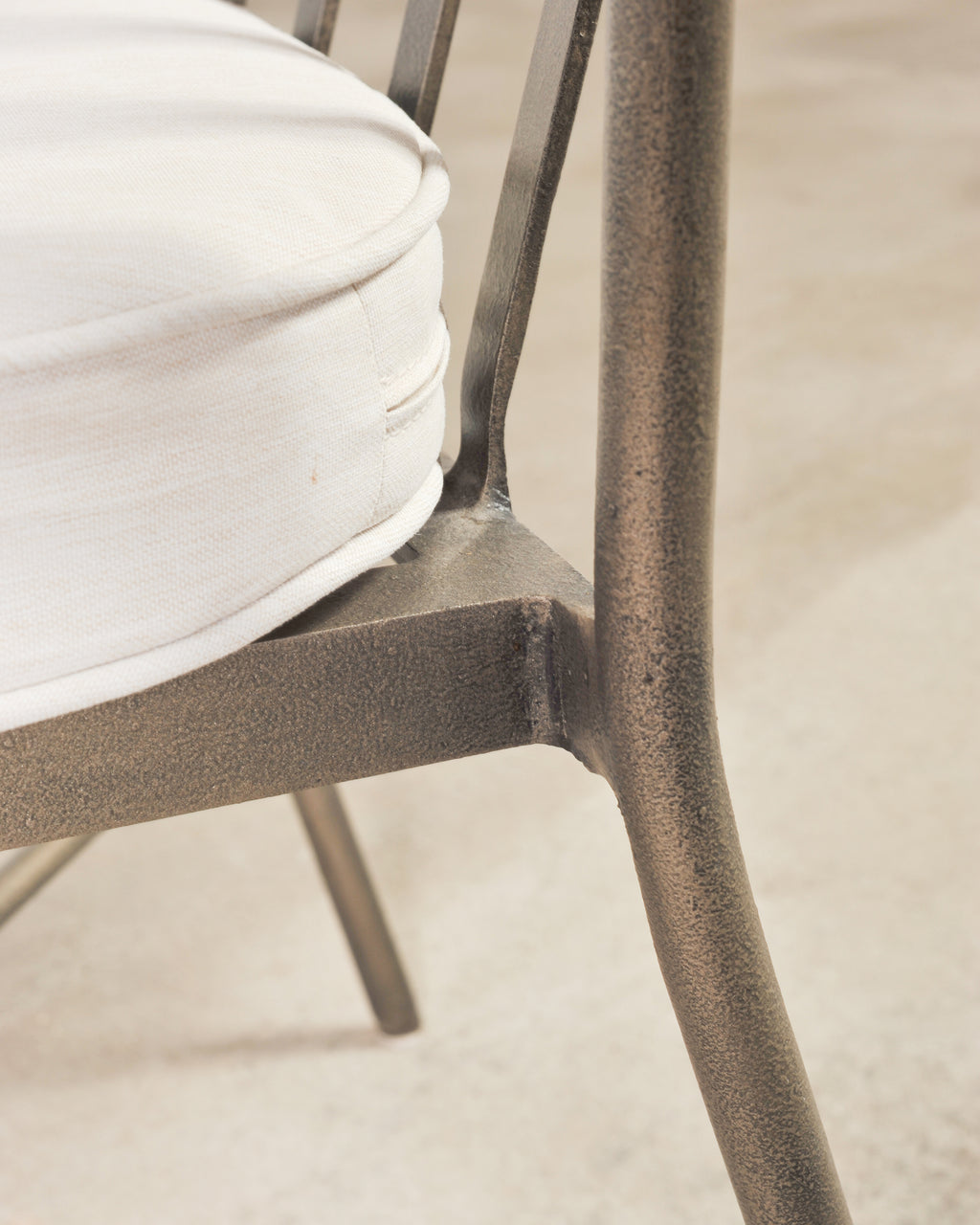 Condition: Good, minor wear consistent with age and use. Beautifully crafted with strong joinery and construction. Intentionally distressed finish on aluminum. Age appropriate wear with aged patina as seen in photos. Minor scuffs and wear to finish. Later cushions present well and appear clean.