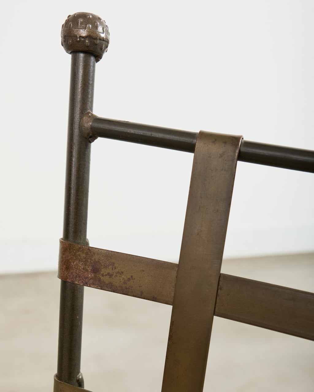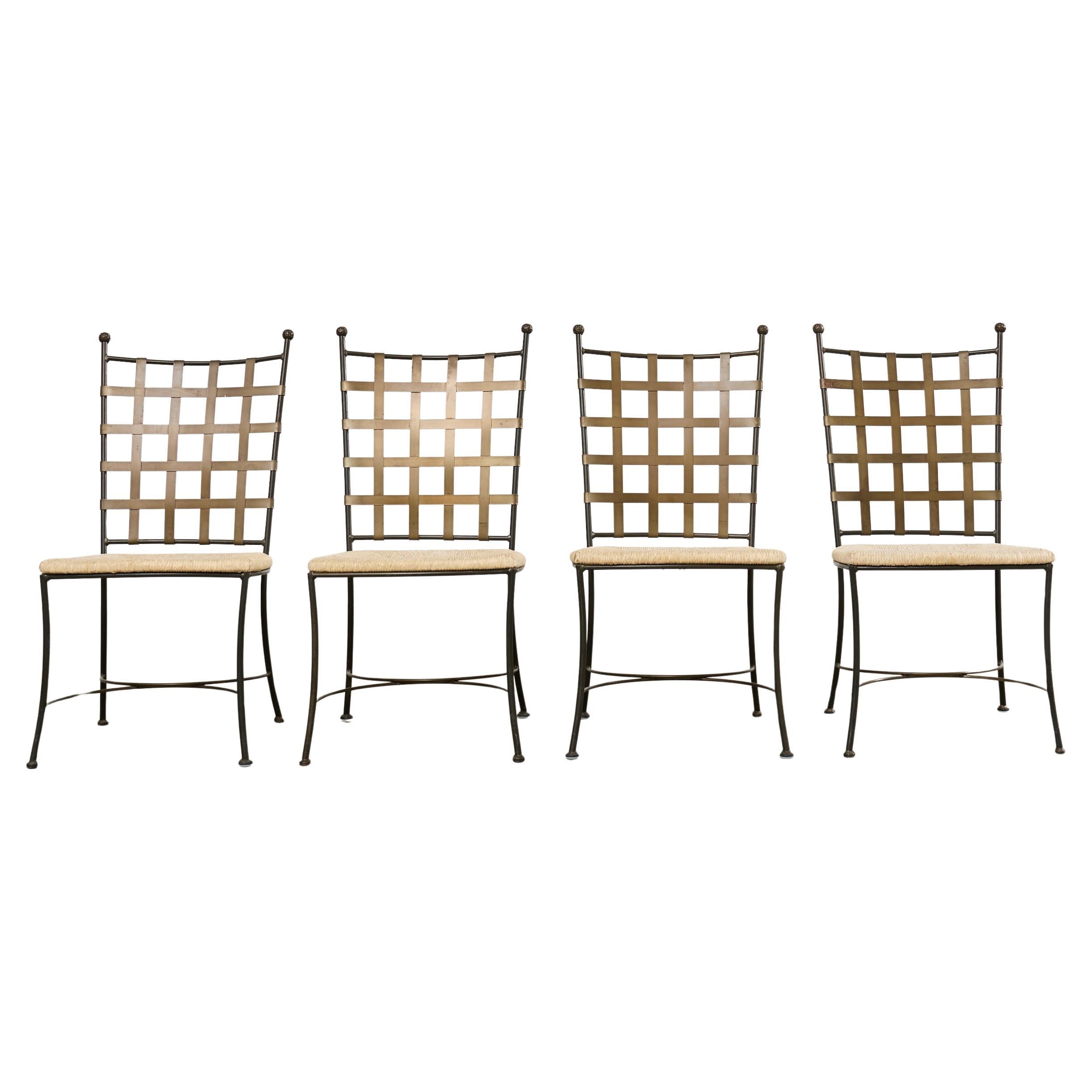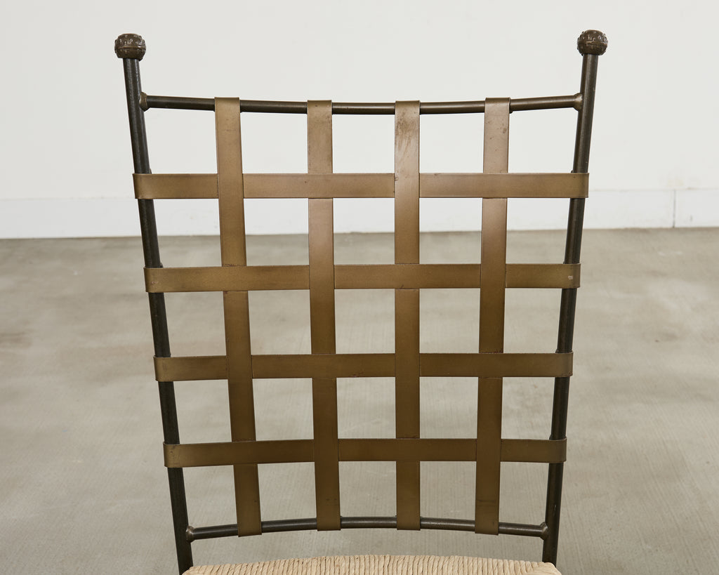 Iconic set of four Amalfi patio and garden dining chairs made in the manner and style of Mario Papperzini by Charleston Forge, North Carolina. The chairs feature a wrought iron frame with a bronzed finish. The backs of the chairs have a geometric lattice inset and ball finials on each corner. The generous wheat-toned seats have a woven rush bottom that is wide and comfortable. The seats are supported by splayed legs conjoined by demilune-shaped stretchers. The chairs are sturdy and strong with excellent joinery and craftsmanship. The iron has a dark oil rubbed bronze style finish. The design is airy with a slender profile in the European decorateur movement of the 1950-1960s. Sold as a set of four.