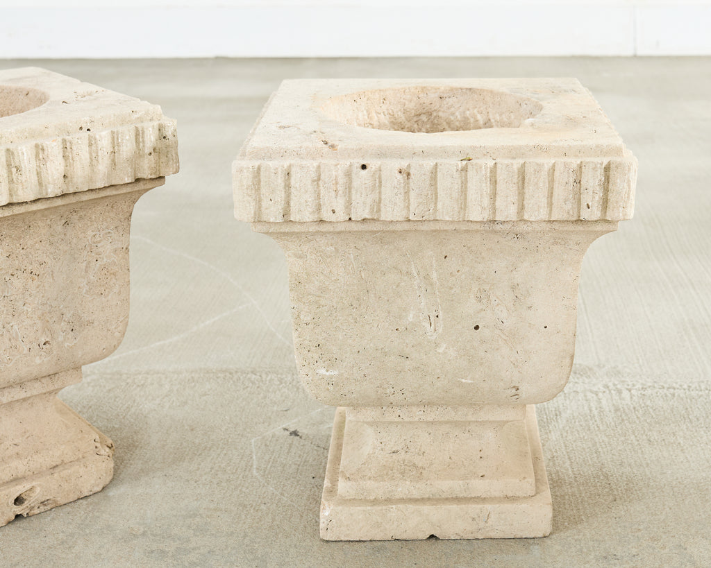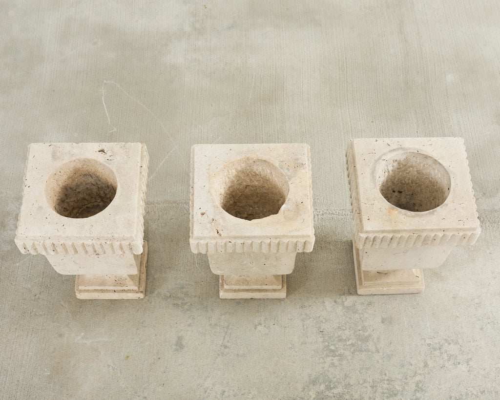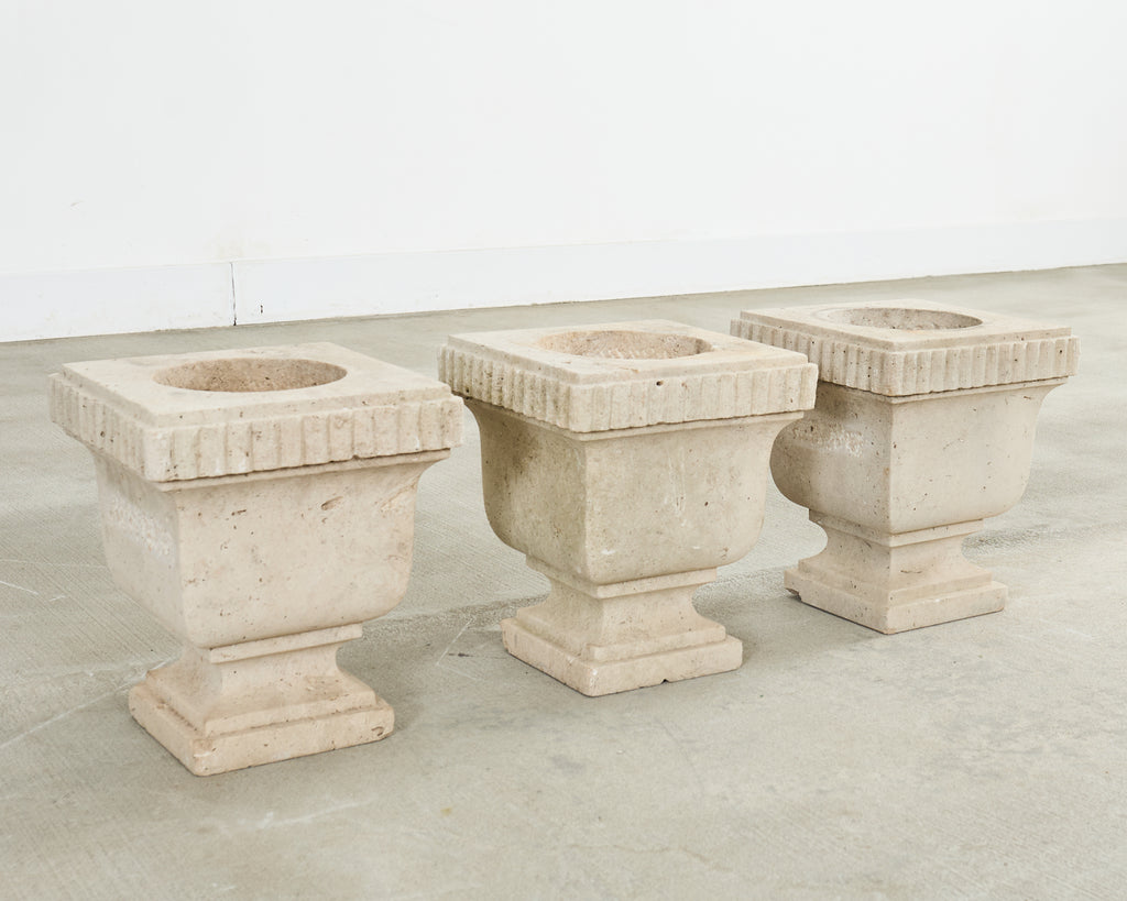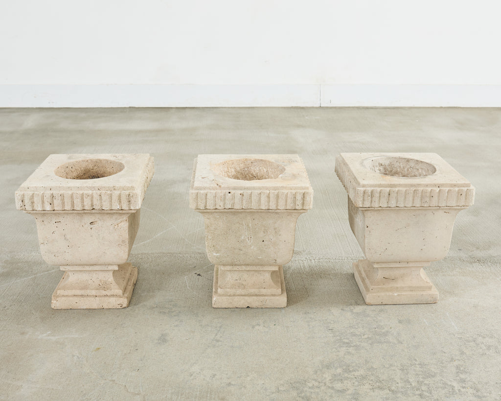 A sculptural set of three Italian molded stone urn planters or jardinieres executed in a warm ivory travertine tone. The planters are finished in a Neoclassical style with Mediterranean and Provençal influence. Each urn planter features a crisply defined square top with reeded frieze. The frieze frames a deep circular planting well, the interiors intentionally left rough-hewn. The bodies swell gently above a stepped plinth base, producing a classic architectural silhouette. Subtle variation from planter to planter in the shaping and tooling creates some variance while retaining a cohesive, matching set. The pale stone exhibits natural inclusions and markings with light weathering, giving a natural and authentic character. Each planter is drilled for drainage at the base of the interior. Suitable for indoor, outdoor, or garden use.