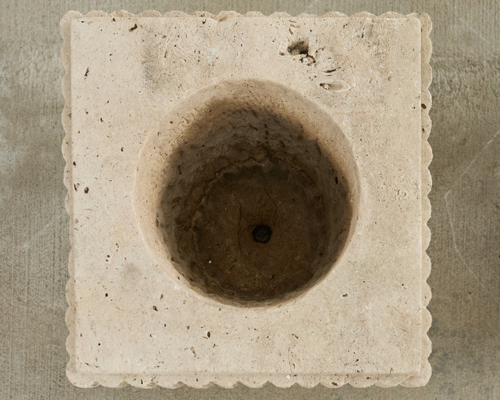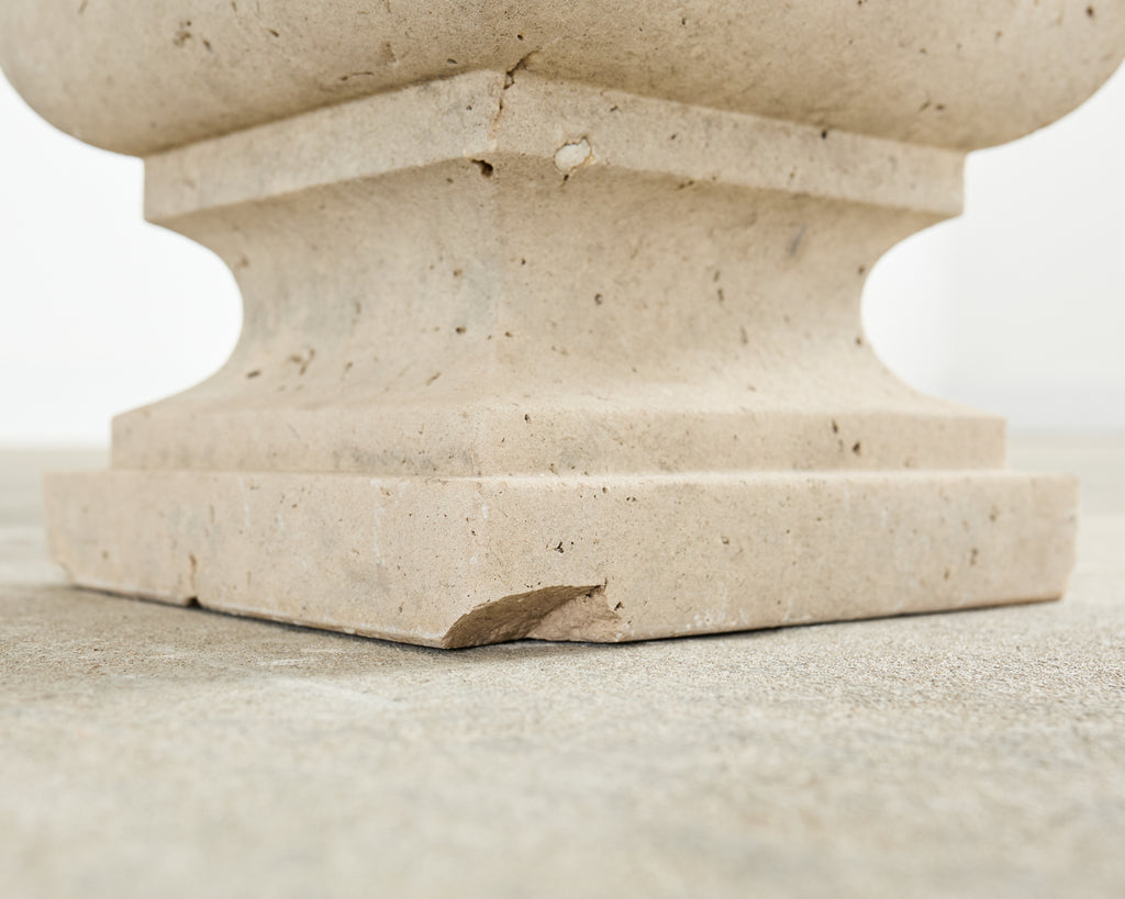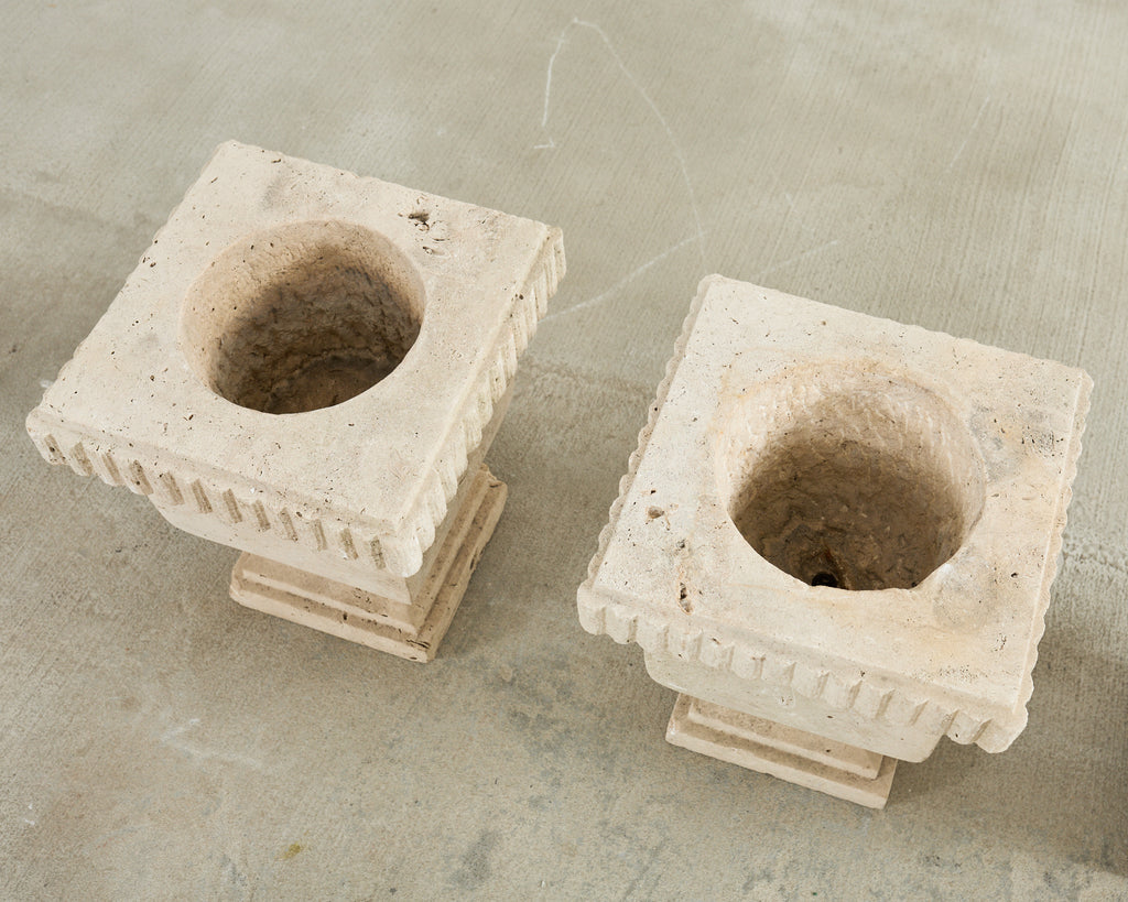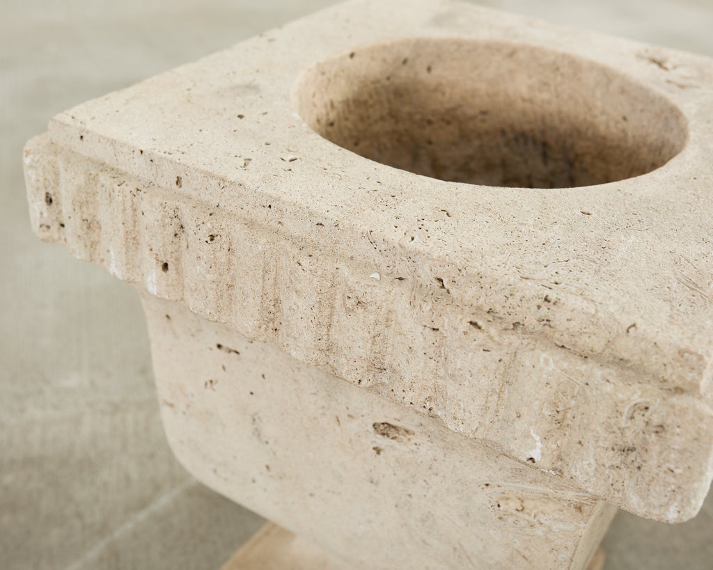 A sculptural set of three Italian molded stone urn planters or jardinieres executed in a warm ivory travertine tone. The planters are finished in a Neoclassical style with Mediterranean and Provençal influence. Each urn planter features a crisply defined square top with reeded frieze. The frieze frames a deep circular planting well, the interiors intentionally left rough-hewn. The bodies swell gently above a stepped plinth base, producing a classic architectural silhouette. Subtle variation from planter to planter in the shaping and tooling creates some variance while retaining a cohesive, matching set. The pale stone exhibits natural inclusions and markings with light weathering, giving a natural and authentic character. Each planter is drilled for drainage at the base of the interior. Suitable for indoor, outdoor, or garden use.