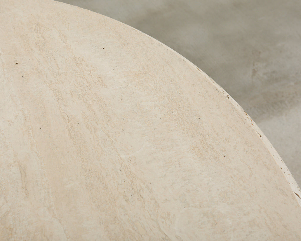 Condition: Distressed, wear consistent with age and use. Beautifully crafted with solid joinery and construction. Heavily patinated, weathered finish on the bronze as seen in photos. Base is mounted to a later iron foot. Travertine has natural inclusions, fissures, stains and areas with fill on the voids.