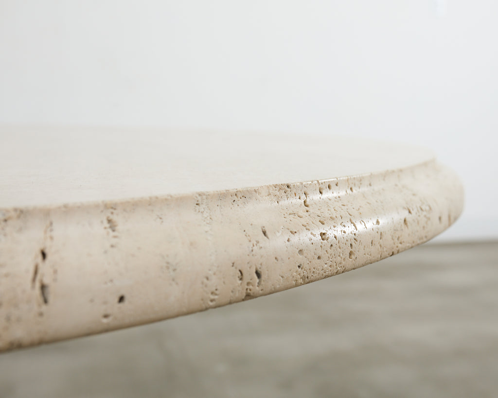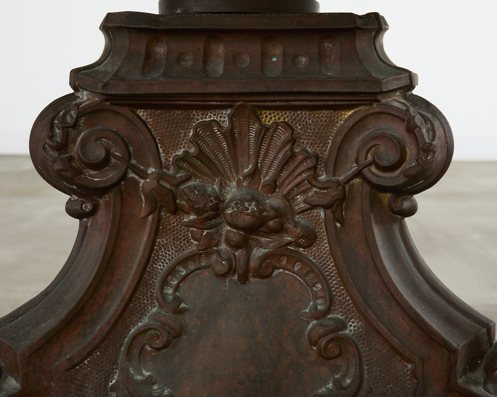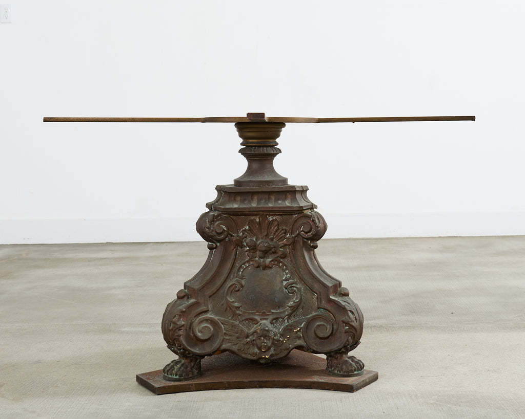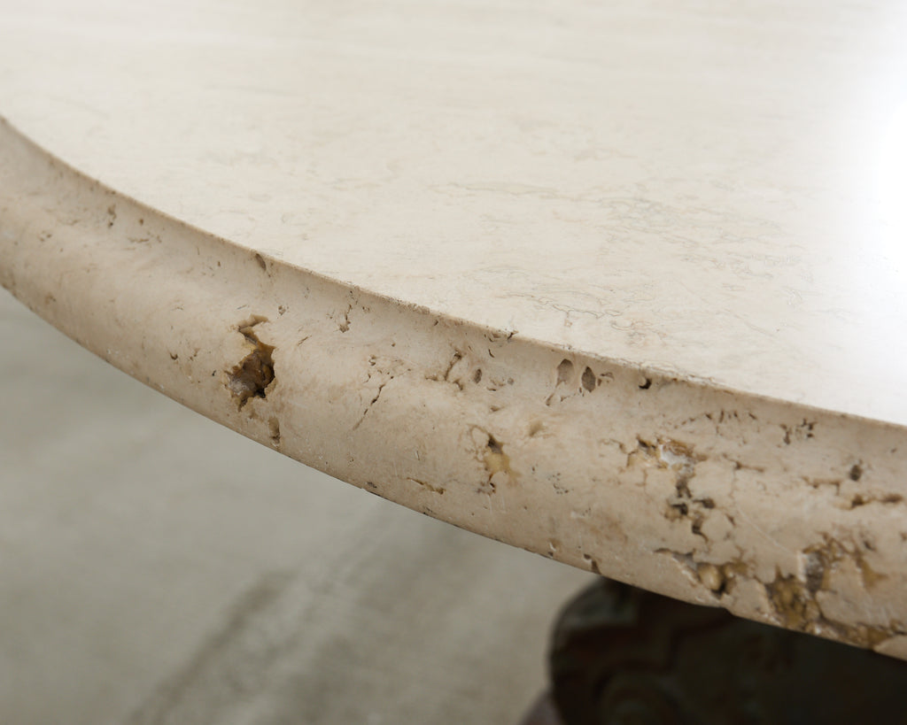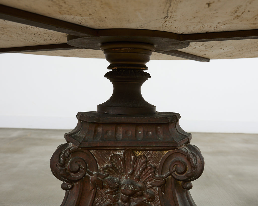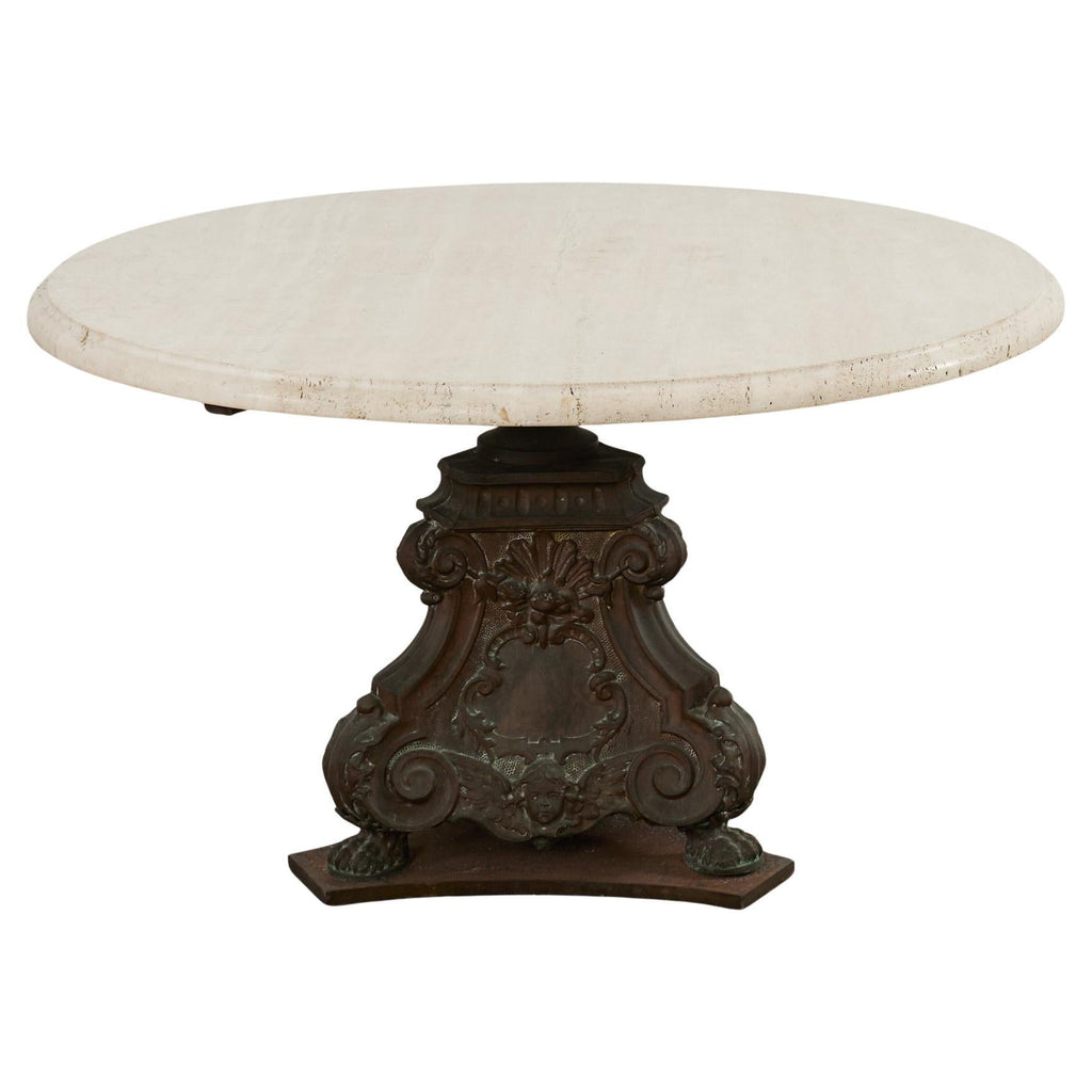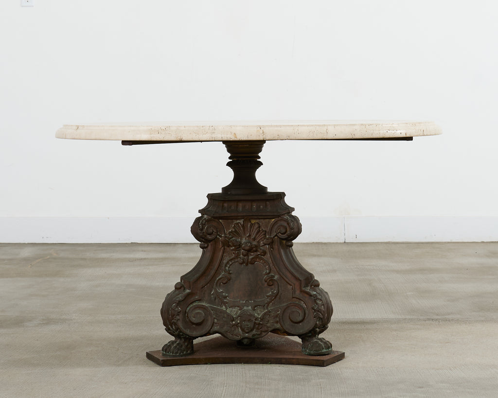 Impressive French pedestal garden dining table or center table featuring a patinated bronze base topped with a thick slab of Italian travertine. The round top measures 1.5 inches thick with an ogee beveled edge. The travertine is supported by a three-sided bronze pedestal decorated in the baroque taste having shell rocaille above winged cherubs on each side. The corners are decorated with neoclassical acanthus scrolls ending with lions paw feet. The pedestal is mounted to a later iron plinth in a conforming shape. The bronze has a heavily patinated, weathered finish with verdigris. The opulent table could serve as a grand center table or in an orangerie. From an estate in Bel Air, CA.