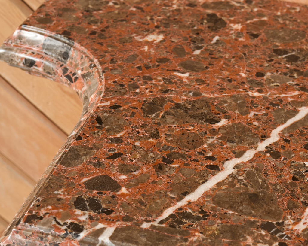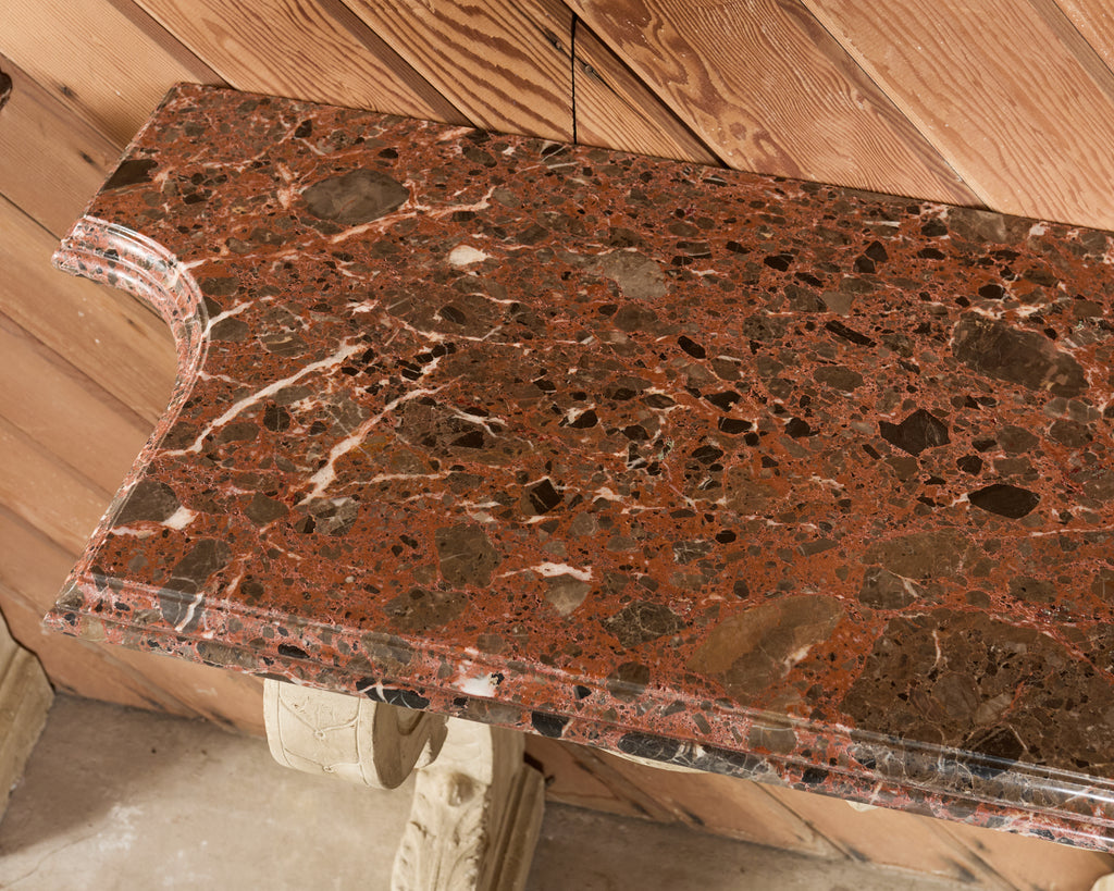 Dramatic pair of neoclassical Greco-Roman style wall-mounted consoles designed by Dennis and Leen, Hollywood, California. The Hadrian consoles feature molded stone supports decorated with gracefully curved scrolled legs. The legs are conjoined by a serpentine shaped apron centered by a mythological Greek satyr face on the frieze. The stone base is topped with a massive, 3" inch thick shaped top with an ogee stepped edge. The Italian marble has a variegated pattern with deep reds, grey's, black, and white veins. The set includes mounting hardware. The stone bases have an intentionally, distressed patina as seen in photos. The marble has a fine honed, polished finish. Sold as a pair. Bespoke tables custom ordered for a grand estate in San Francisco, California. Heavy and solid, weighing 300 pounds each. Dennis and Leen Hadrian console model #DL-CN19.